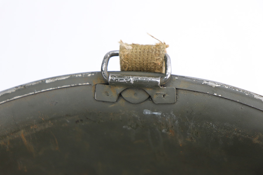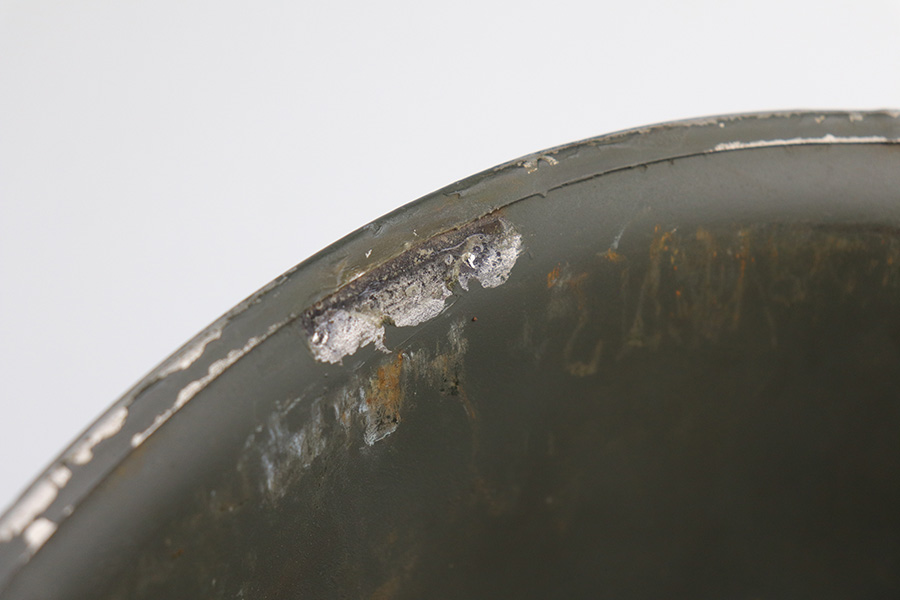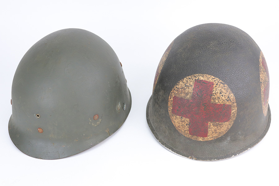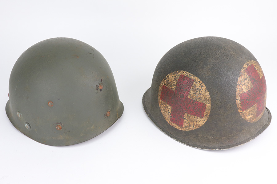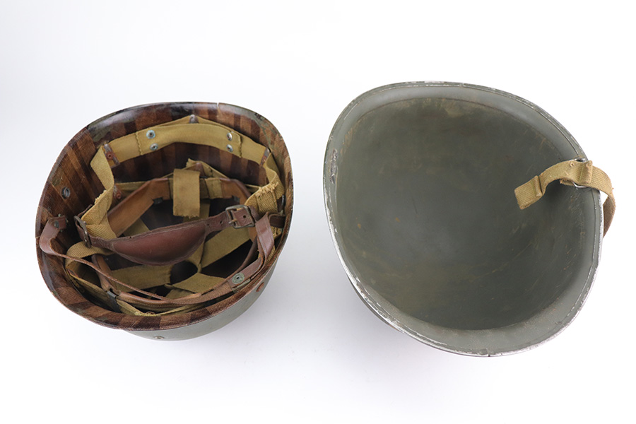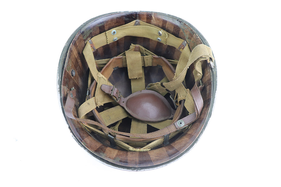 10/28/21 – This is an original US Military Medic Helmet from WW2. The helmet is for a paratrooper medic, as indicated by the type of chine strap shown. The helmet shell is missing one of the bail rings, and the one in tact is the later-wartime swivel version. The shell has no dents, and has multiple medic cross logos around the exterior. We suspect this was repainted / refurbished some time ago. The liner shell has a few small cracks starting from the lip that are about an inch long. The interior is maker stamped by Firestone. We’re not sure if the liner is original or period correct. The liner is in good overall condition with the chin strap in tact as shown.