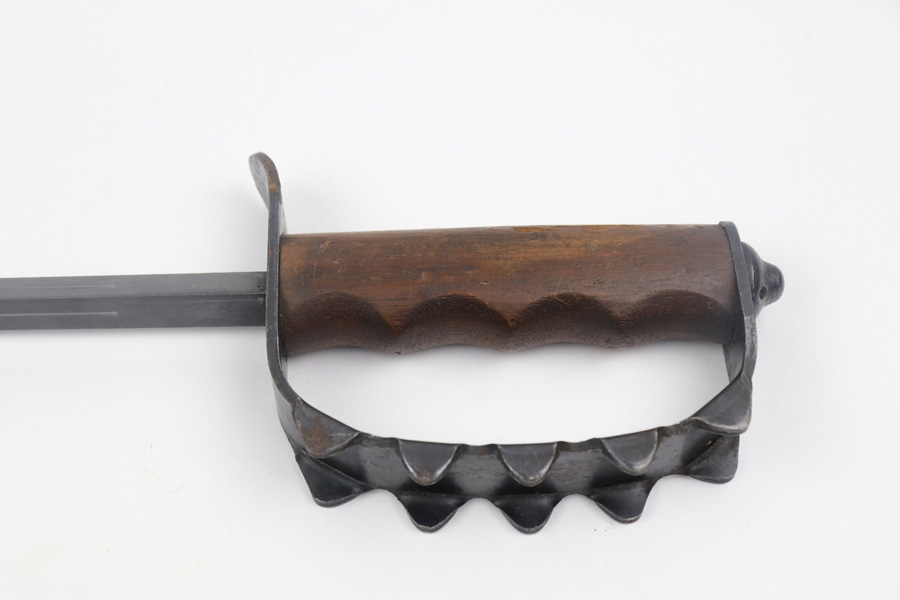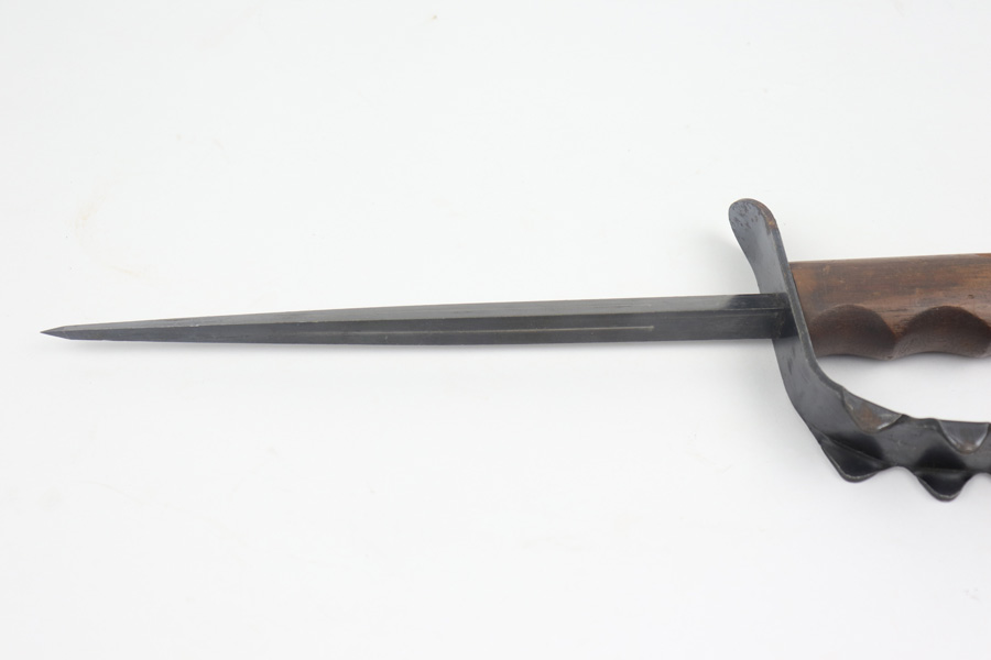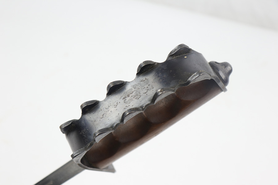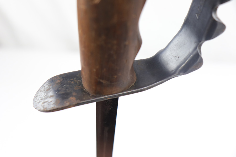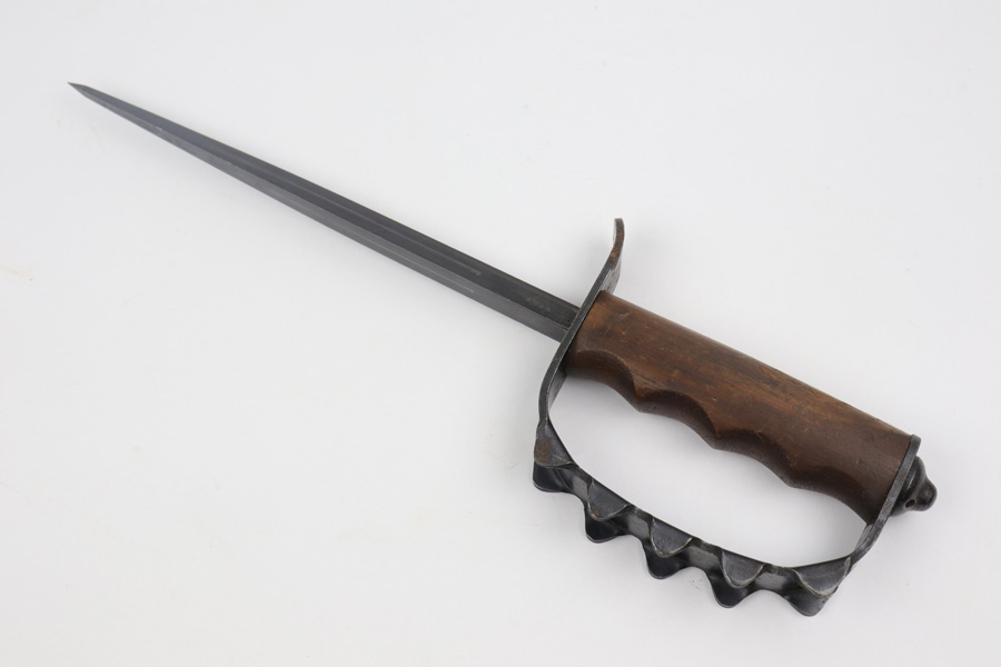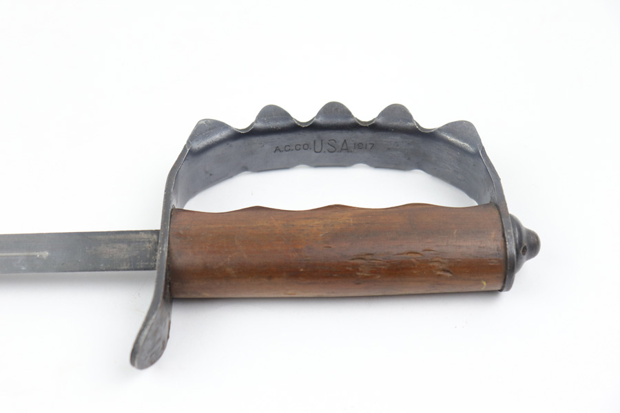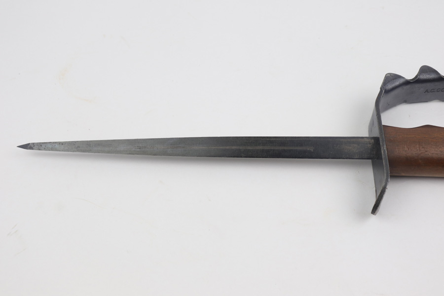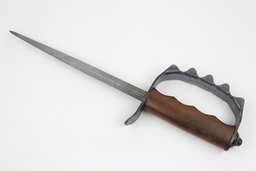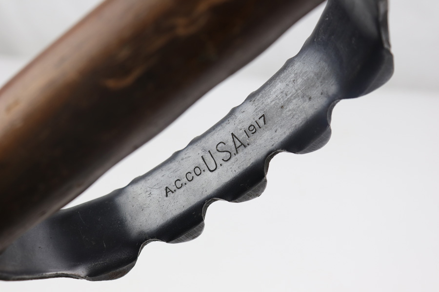 4/12/19 – This is an original WWI production US Trench fighting knife made by A.C. Co. The knife does not come with a scabbard, as shown in photos. The knife is excellent overall condition however, with most of the original finish still on the blade. There is some discoloration and speckling throughout – but this is relatively minor. The wood handle has a few small chew marks, but no major issues. The knuckle guard has a few small spots of rust but overall is excellent with a strong interior maker stamp.