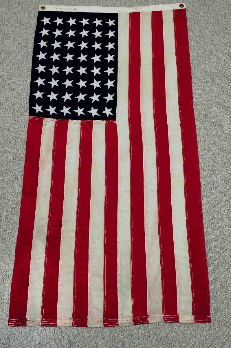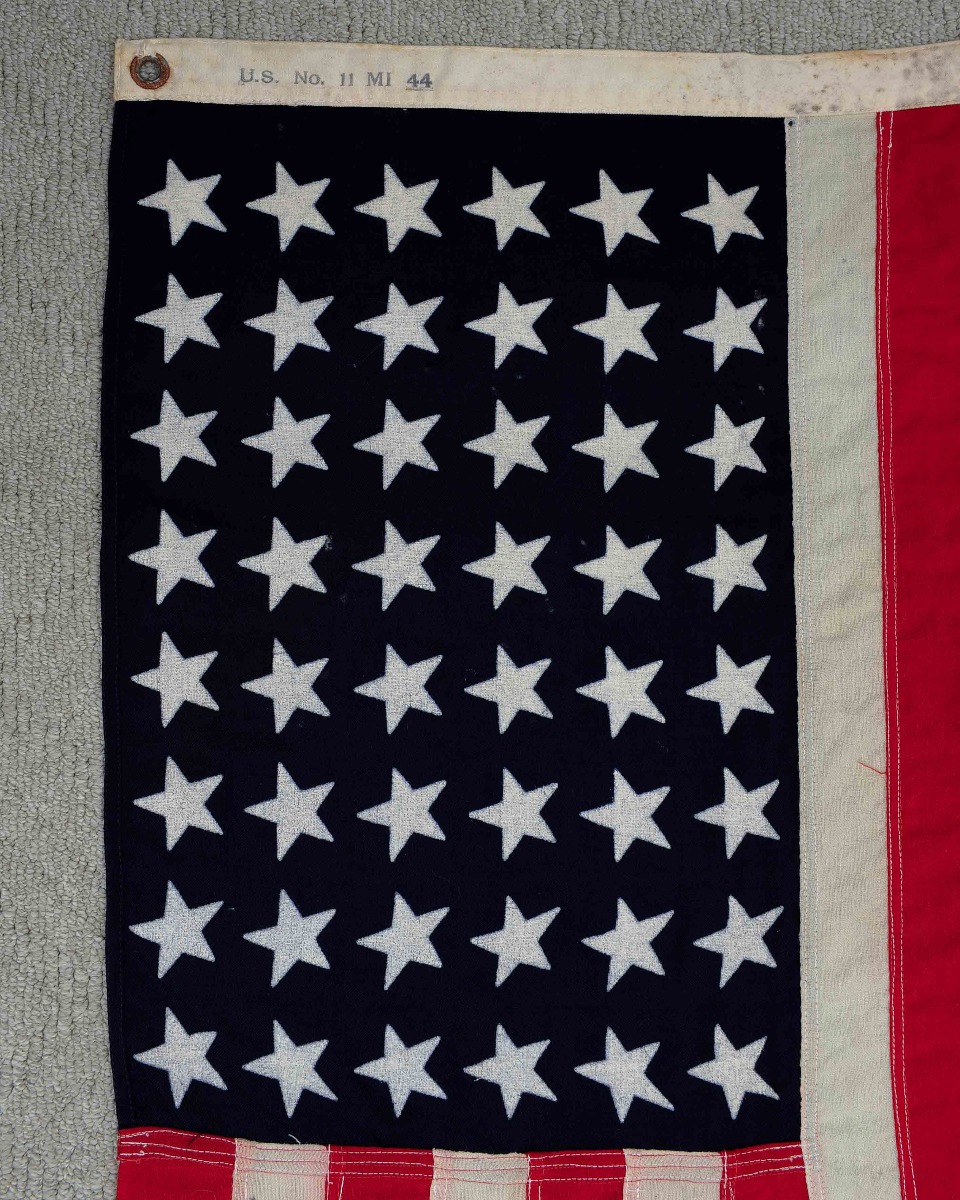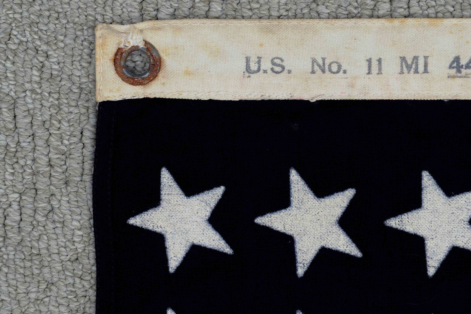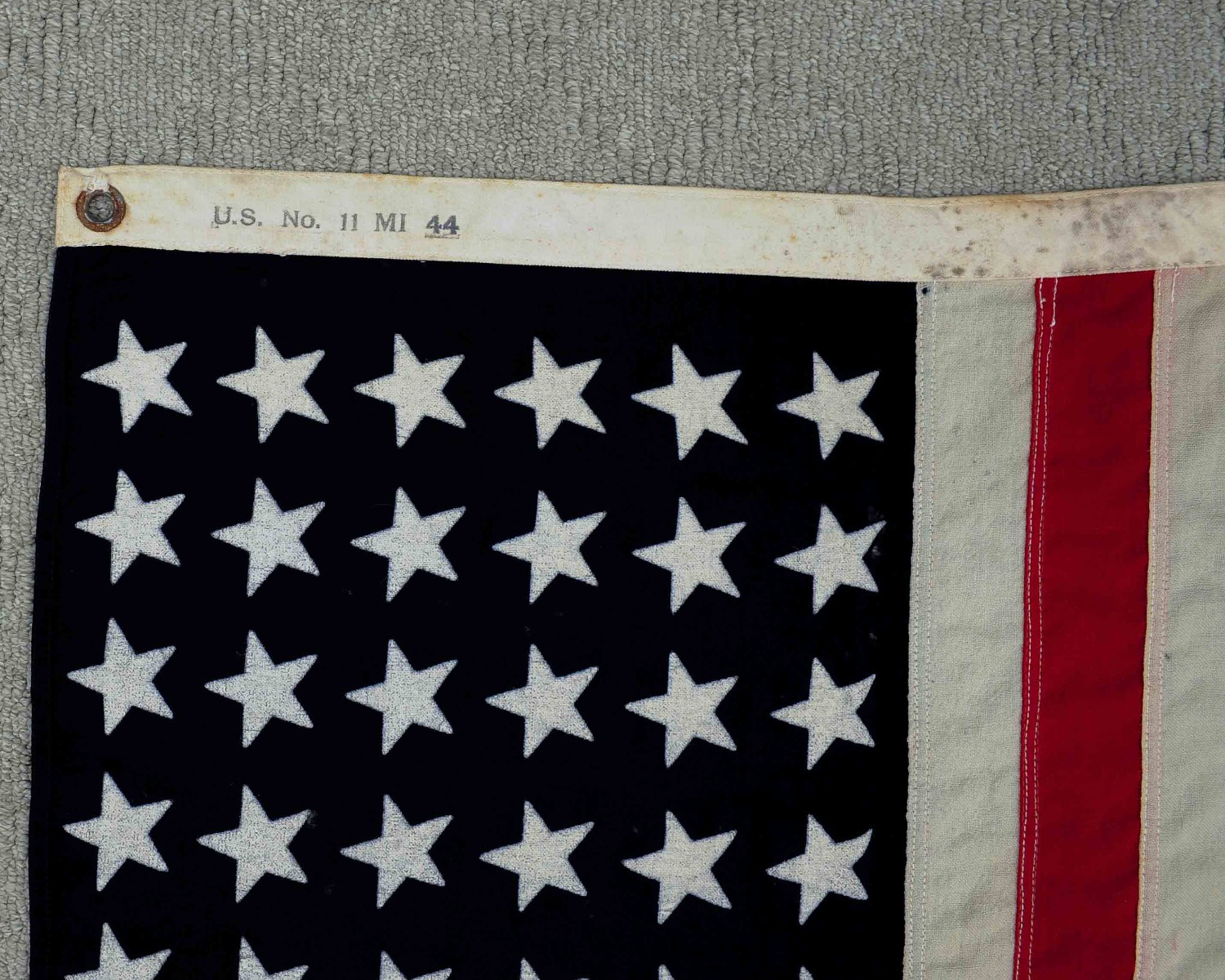 6/18/20 – This is an original U.S. Mare Island No. 11 flag. The header is ink stamped and made in 1944. The No. 11 refers to the size of the flag, with 11 being the 2nd smallest size (and therefore more desirable). There are a few small holes around the stars area of the flag (blue backing), but overall in great condition. The hook rings have some rust around them as well, but this is normal. Some dark spotting on the header as well. Stitching is all original and in tact.