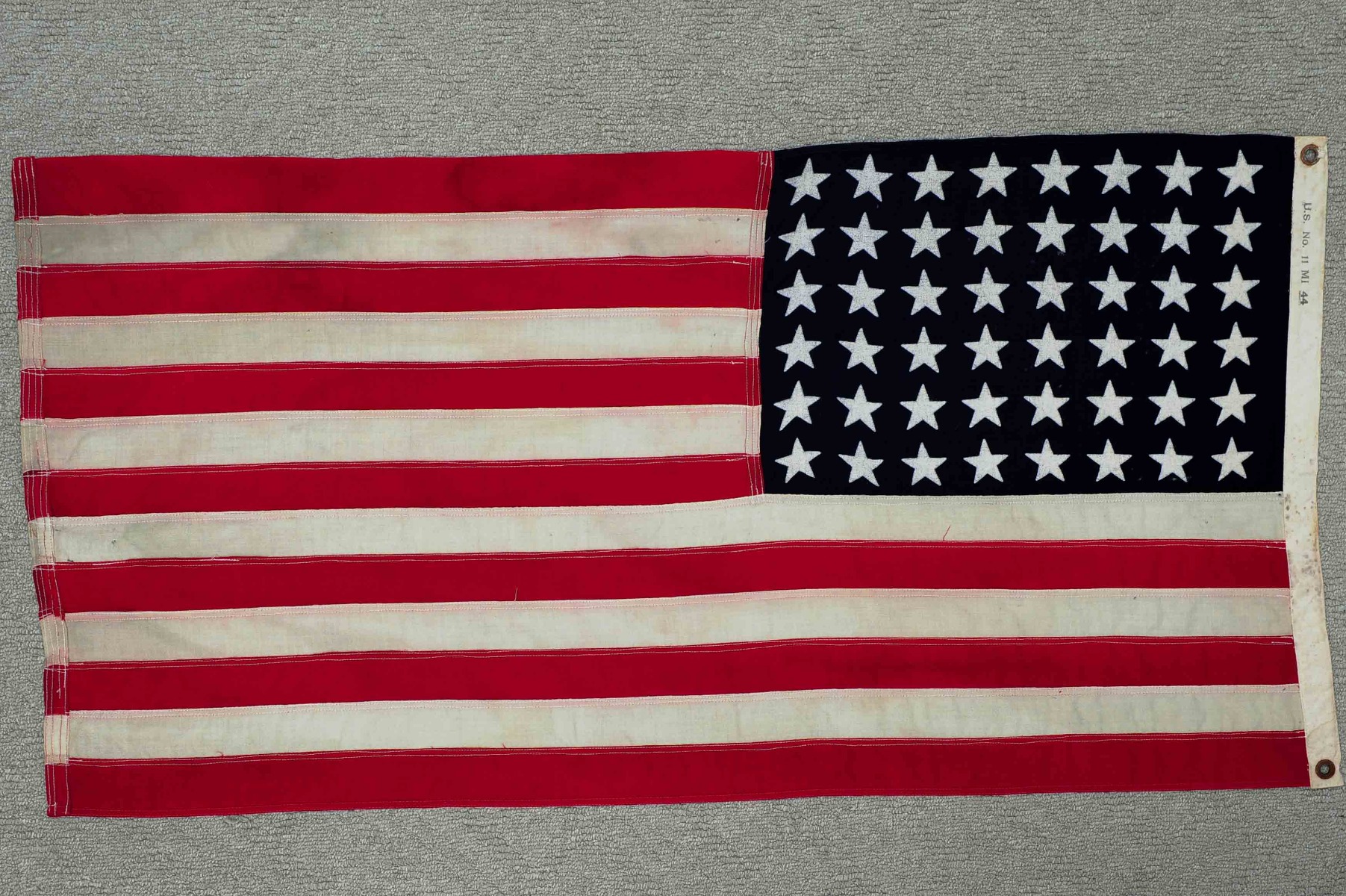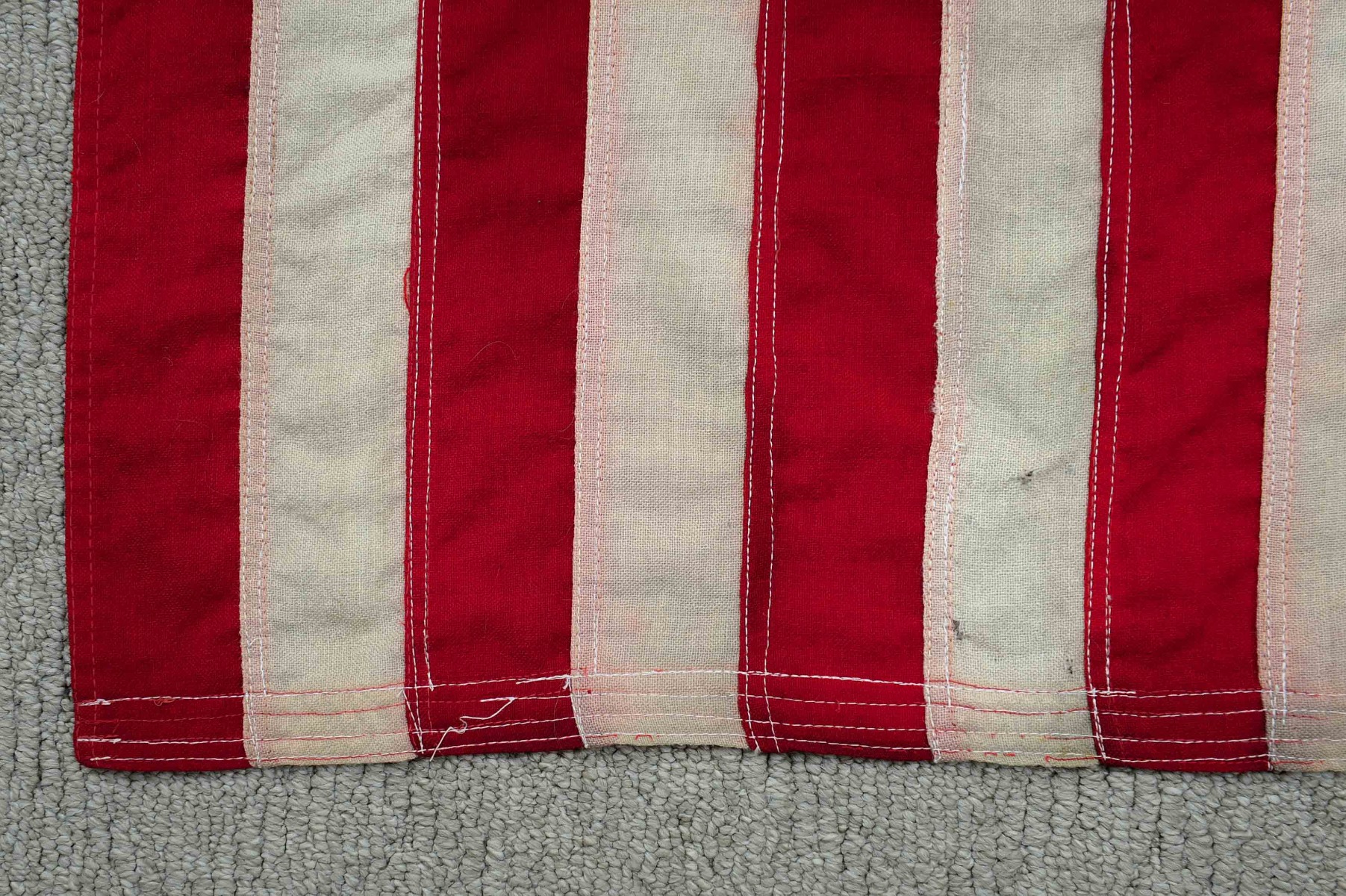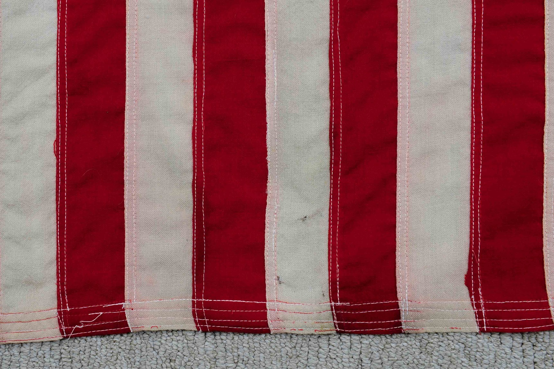 6/18/20 – This is an original U.S. Mare Island No. 11 flag. The header is ink stamped and made in 1944. The No. 11 refers to the size of the flag, with 11 being the 2nd smallest size (and therefore more desirable). There are a few small holes around the stars area of the flag (blue backing), but overall in great condition. The hook rings have some rust around them as well, but this is normal. Some dark spotting on the header as well. Stitching is all original and in tact.