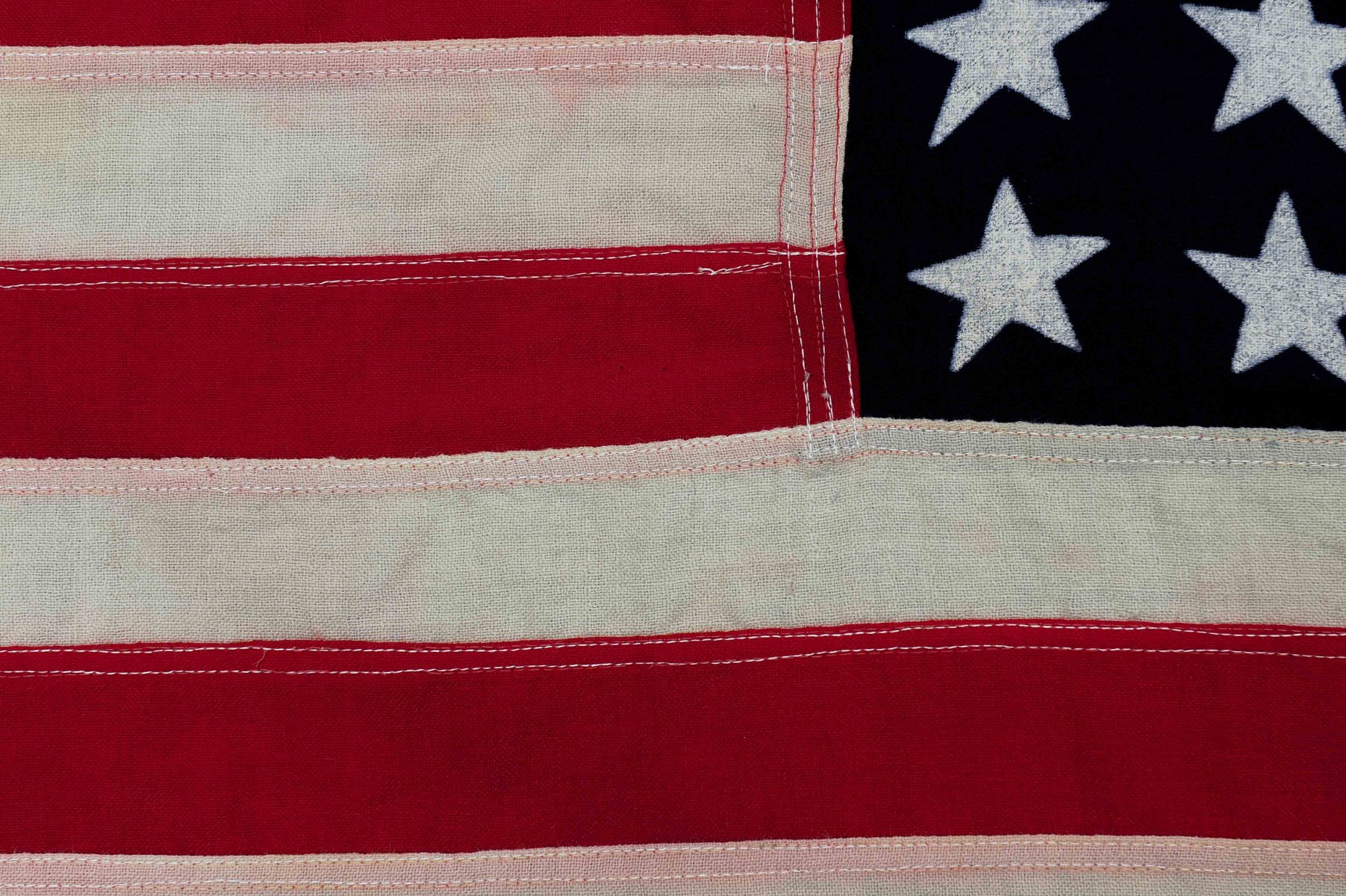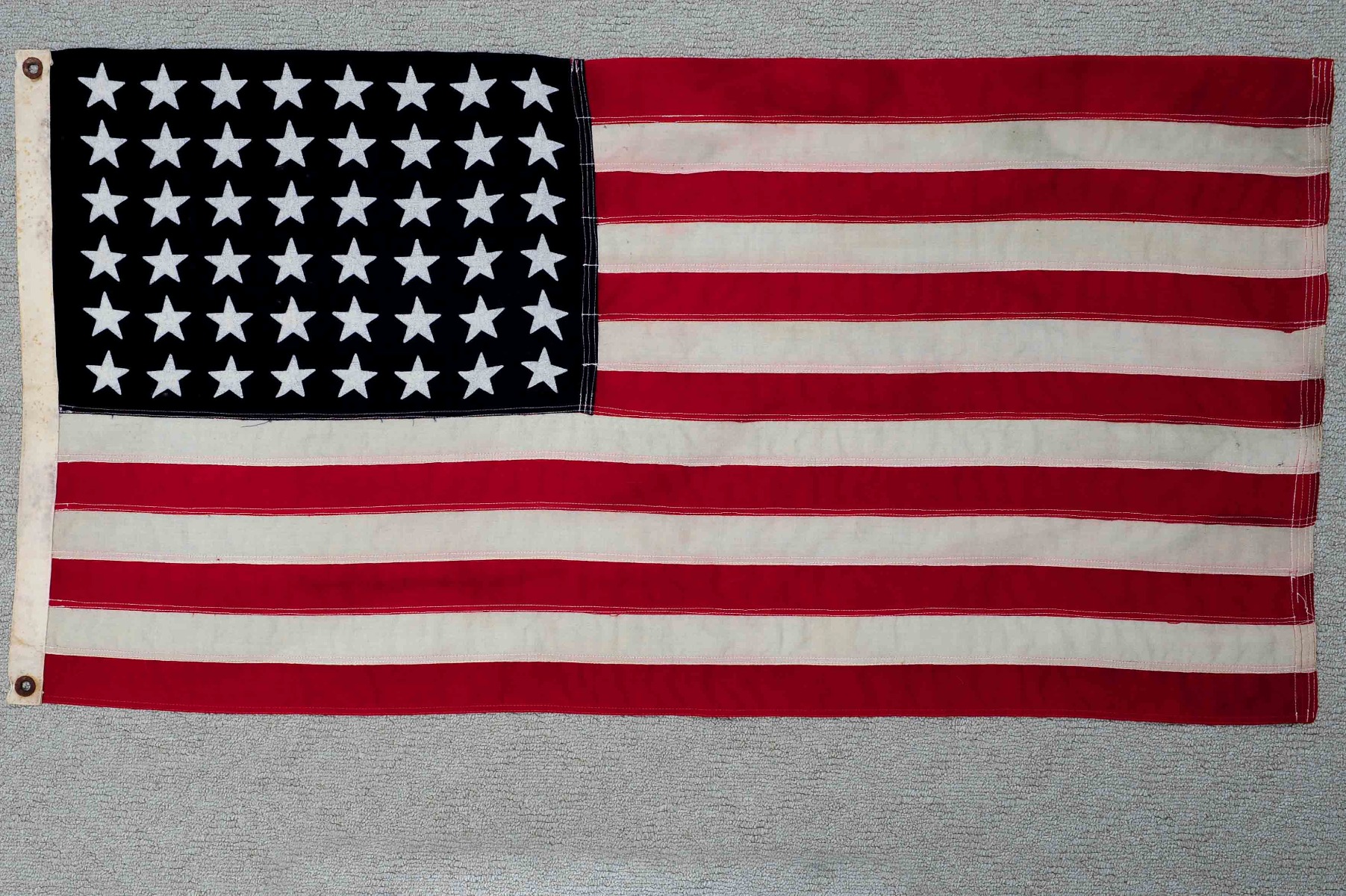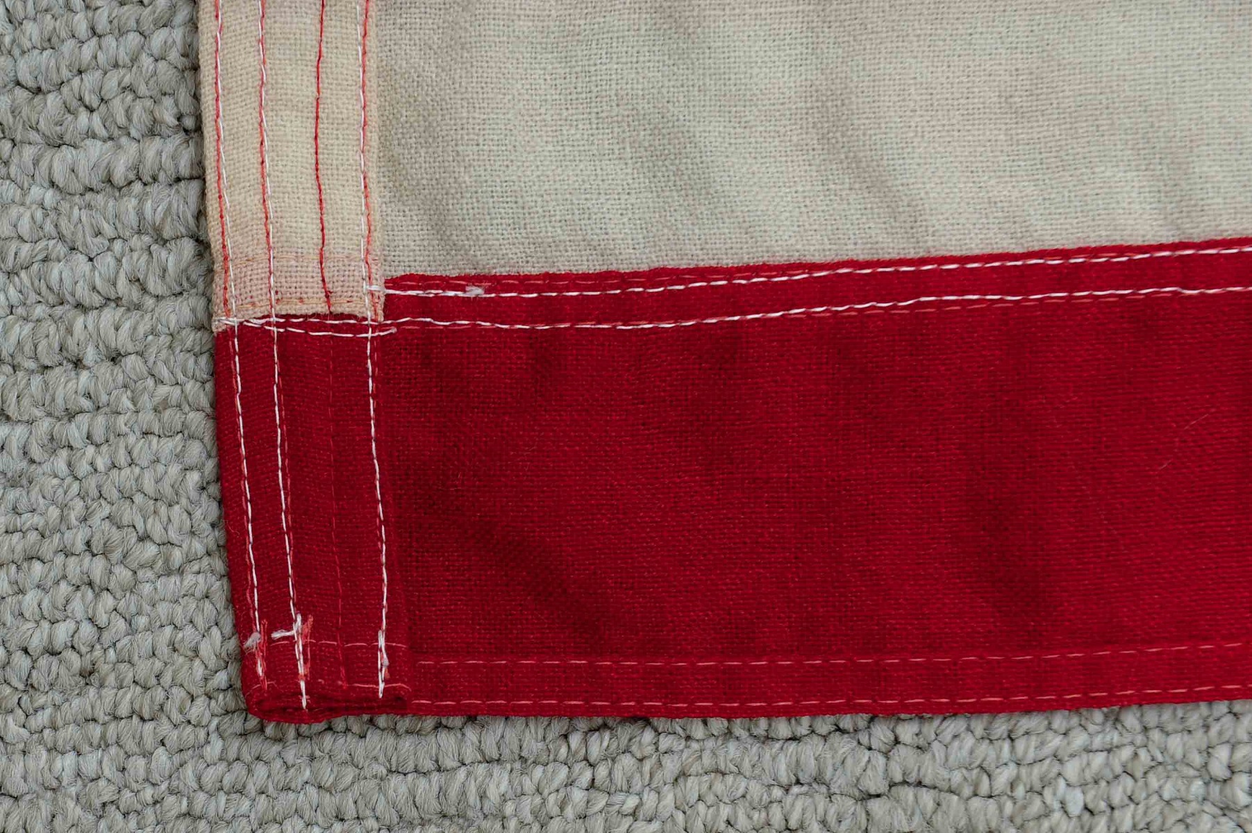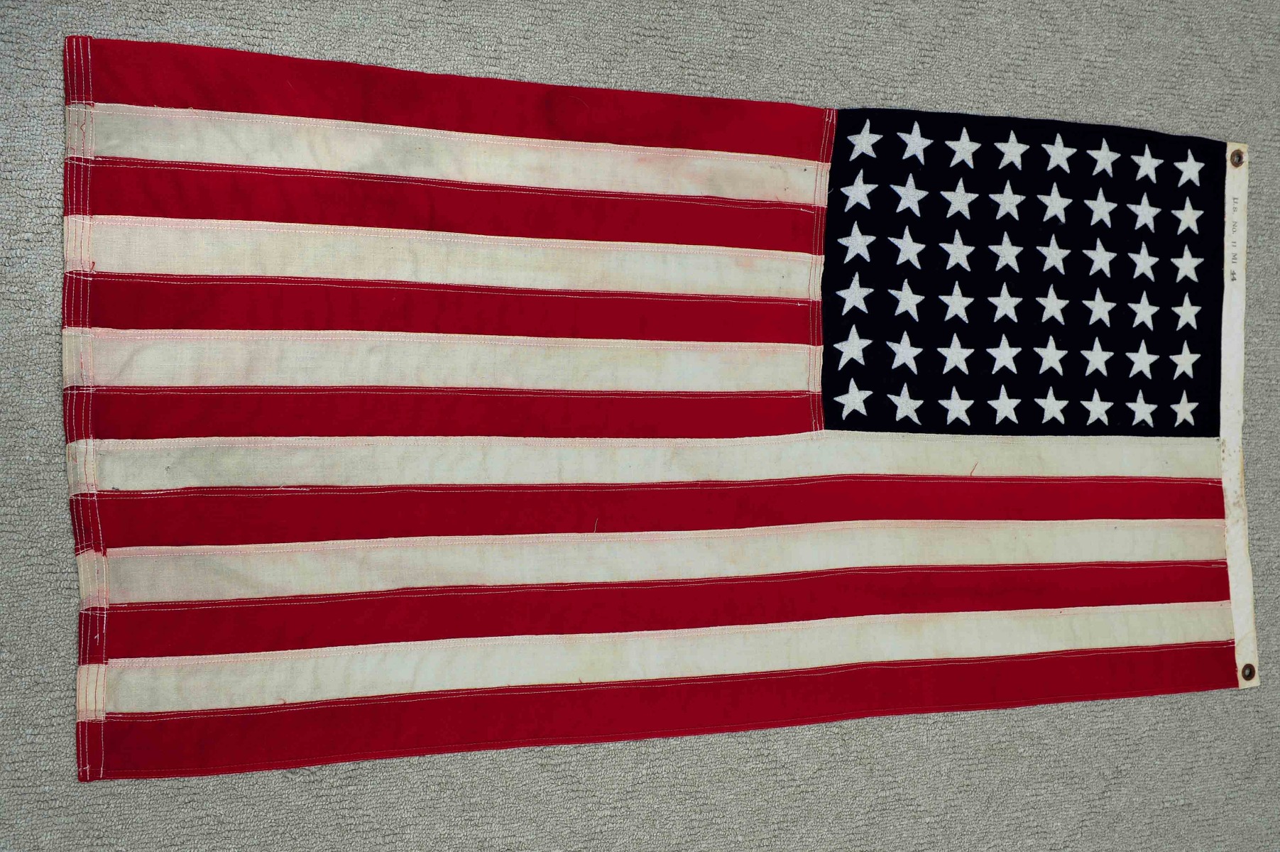 6/18/20 – This is an original U.S. Mare Island No. 11 flag. The header is ink stamped and made in 1944. The No. 11 refers to the size of the flag, with 11 being the 2nd smallest size (and therefore more desirable). There are a few small holes around the stars area of the flag (blue backing), but overall in great condition. The hook rings have some rust around them as well, but this is normal. Some dark spotting on the header as well. Stitching is all original and in tact.