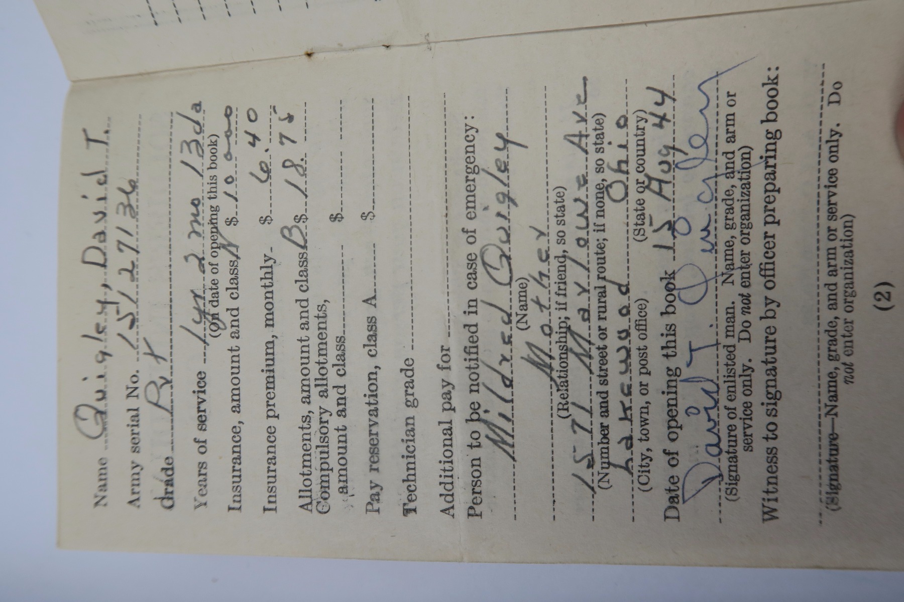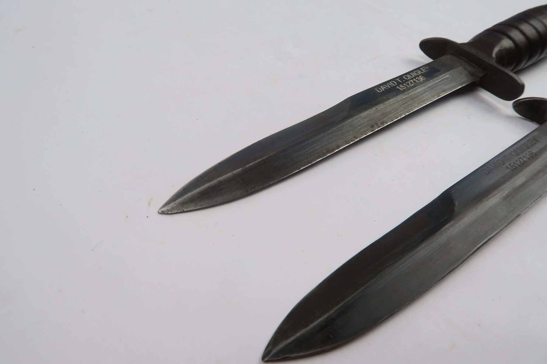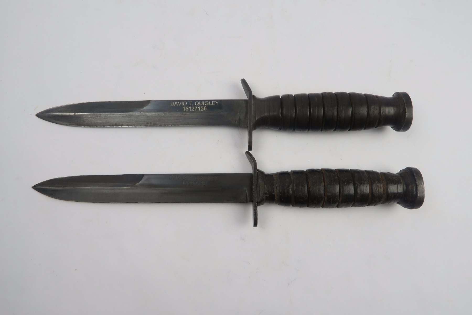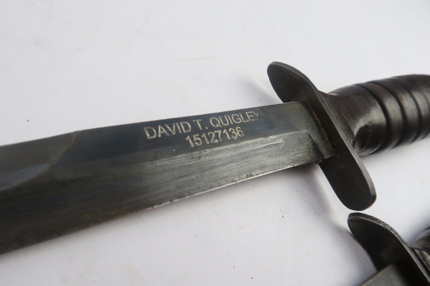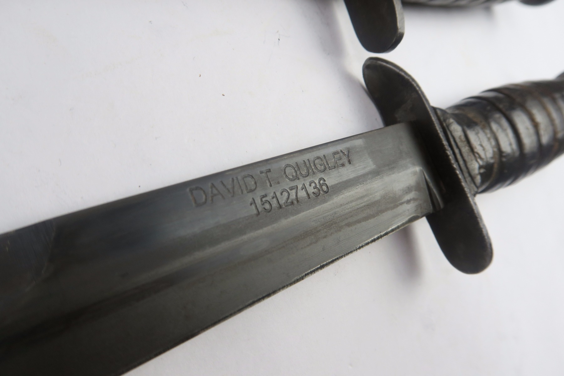 12/5/17 – This is a rare offering of a WW2 Paratrooper veteran’s belongings including two US M3 Fighting knives the solider was issued during his time of service. Each blade is engraved on one side with the soldier’s name: “David T. Quigley” and serial number. David Quigley fought with the US Airborne paratroopers and we have his parachute log record, US Airborne patch and pin, Soldier’s Pay Record booklet, Motor Vehicle Permit, dog tags, photo, and two identification cards for when he was enlisted in the Army Reserve Corps. Furhter research on this soldier found that he was born June 6th 1925, received a Purple Heart during WW2, and died on February 10th, 1991. Everything shown in photos is included with this listing. The two blades are different maker stamps, one being CASE blade marked and the other being KINFOLKS blade marked. The family had each blade engraved with his name after he returned from WW2. This is a very cool grouping of REAL US history! Guaranteed all original and authentic.