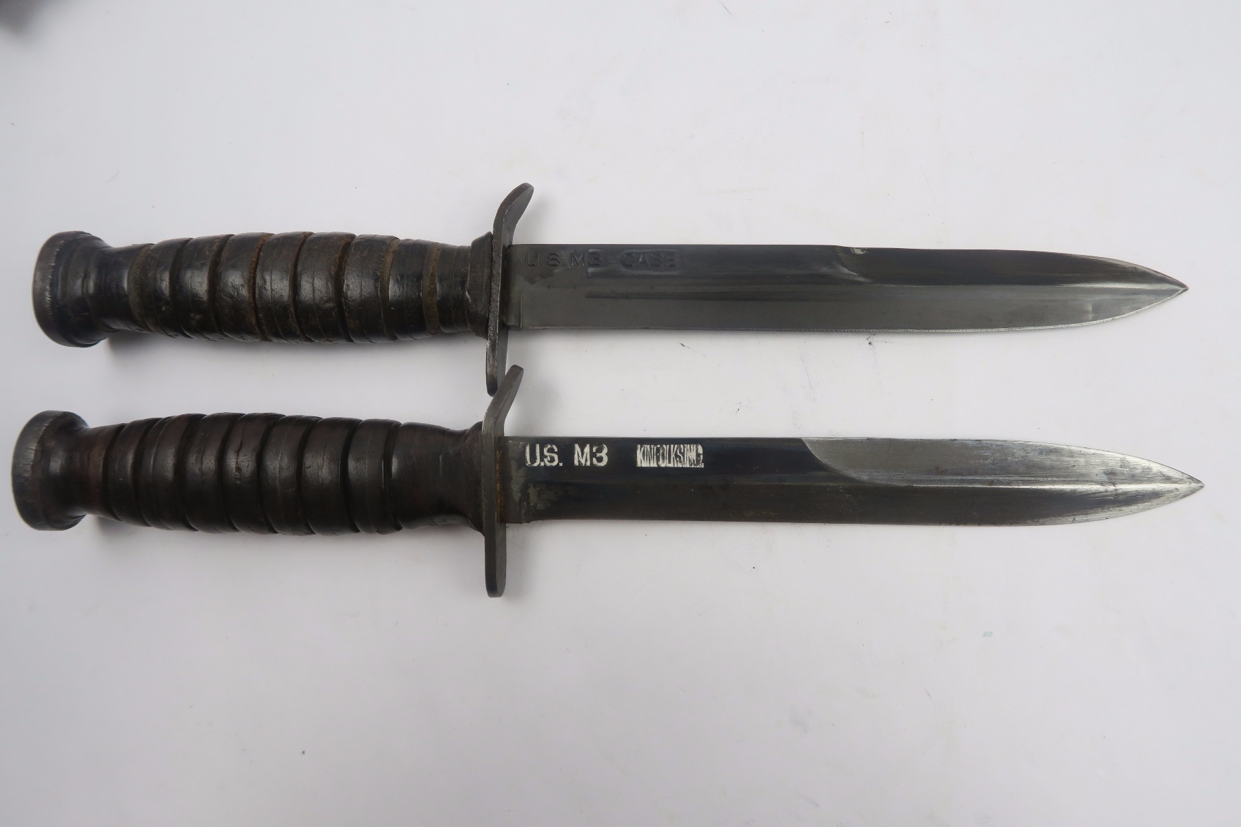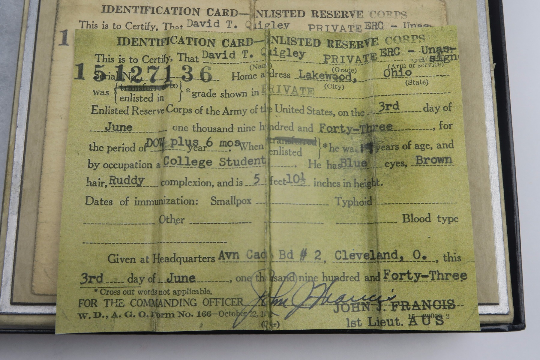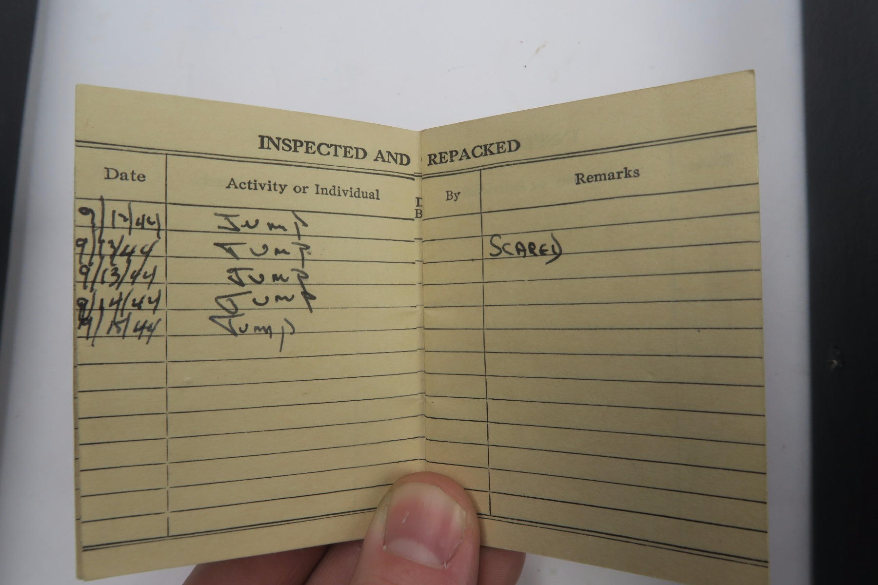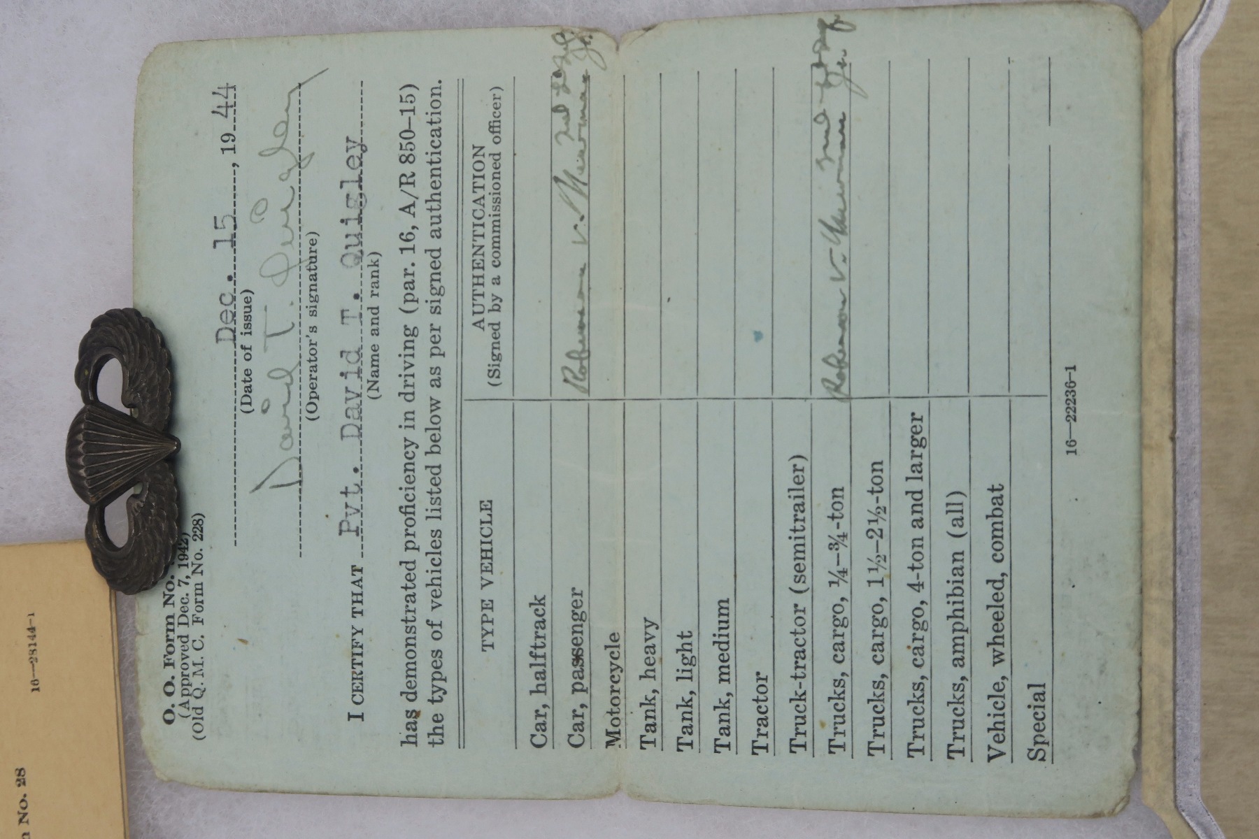 12/5/17 – This is a rare offering of a WW2 Paratrooper veteran’s belongings including two US M3 Fighting knives the solider was issued during his time of service. Each blade is engraved on one side with the soldier’s name: “David T. Quigley” and serial number. David Quigley fought with the US Airborne paratroopers and we have his parachute log record, US Airborne patch and pin, Soldier’s Pay Record booklet, Motor Vehicle Permit, dog tags, photo, and two identification cards for when he was enlisted in the Army Reserve Corps. Furhter research on this soldier found that he was born June 6th 1925, received a Purple Heart during WW2, and died on February 10th, 1991. Everything shown in photos is included with this listing. The two blades are different maker stamps, one being CASE blade marked and the other being KINFOLKS blade marked. The family had each blade engraved with his name after he returned from WW2. This is a very cool grouping of REAL US history! Guaranteed all original and authentic.