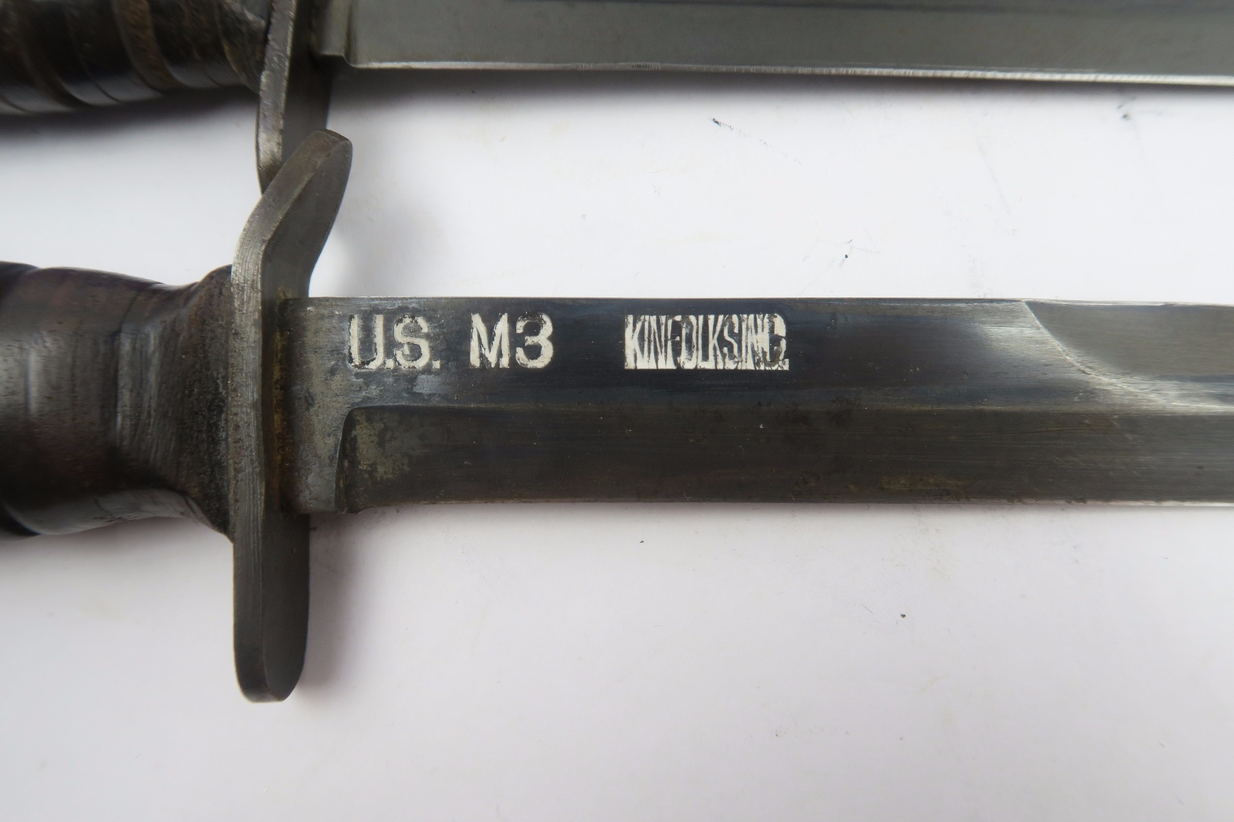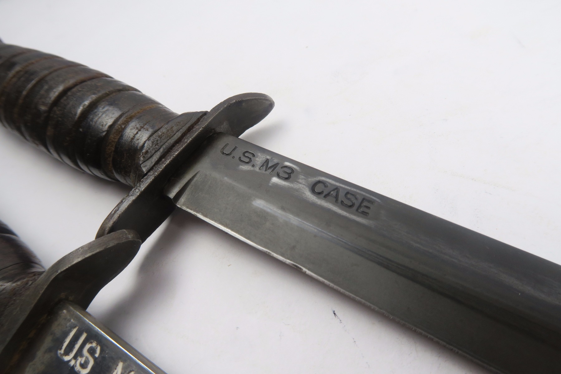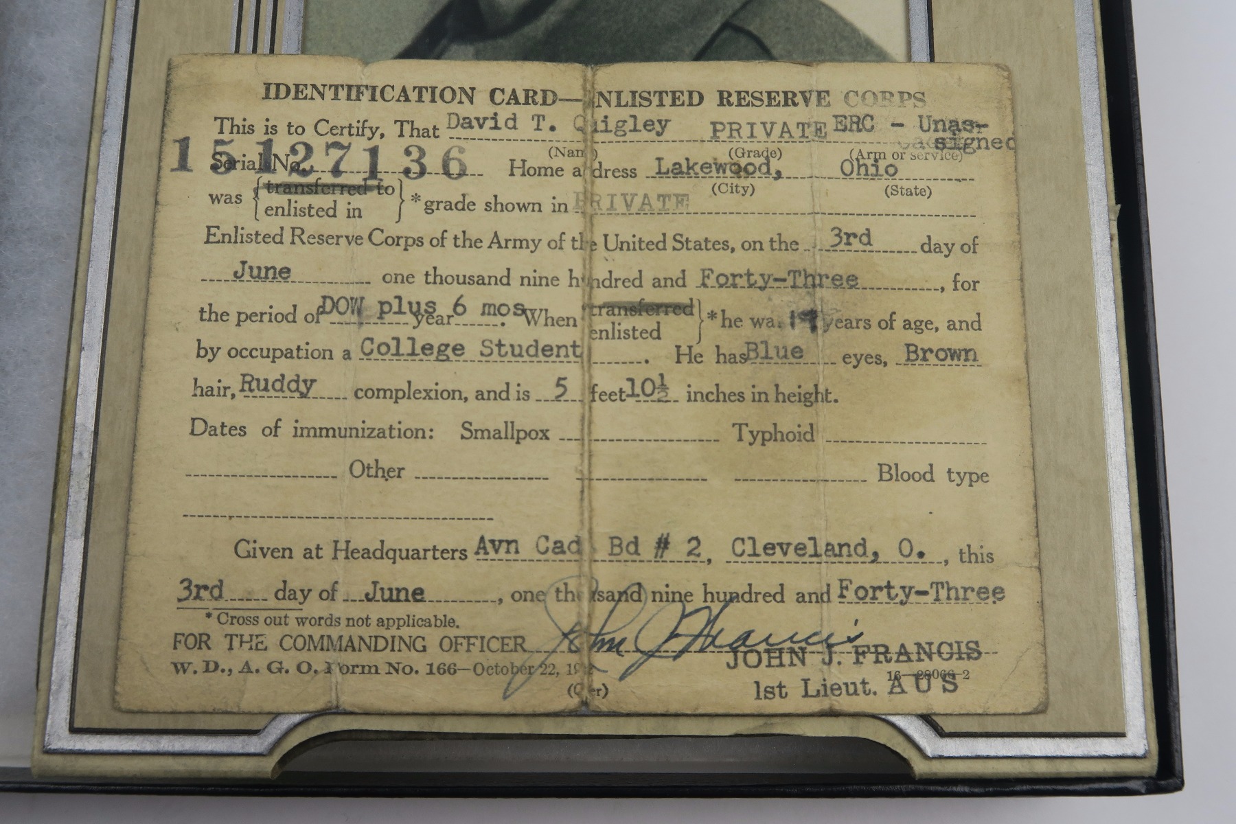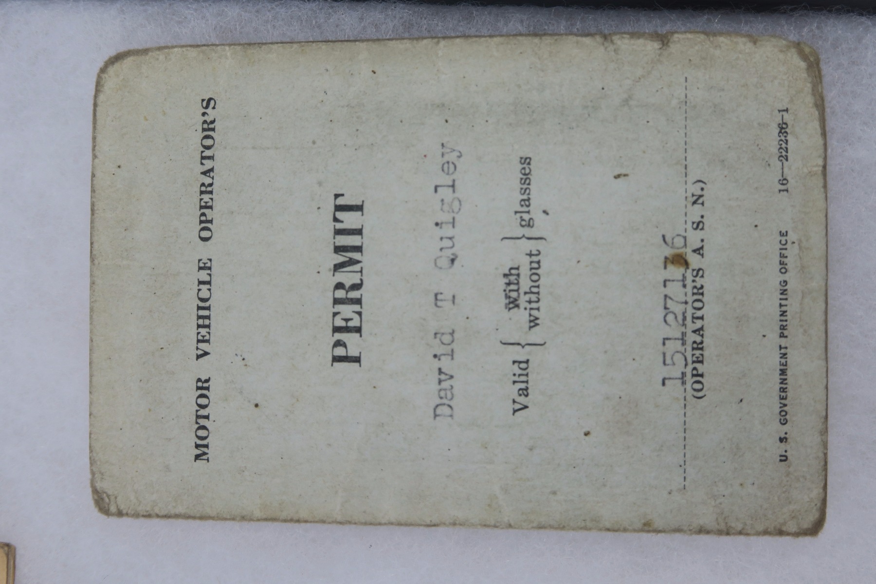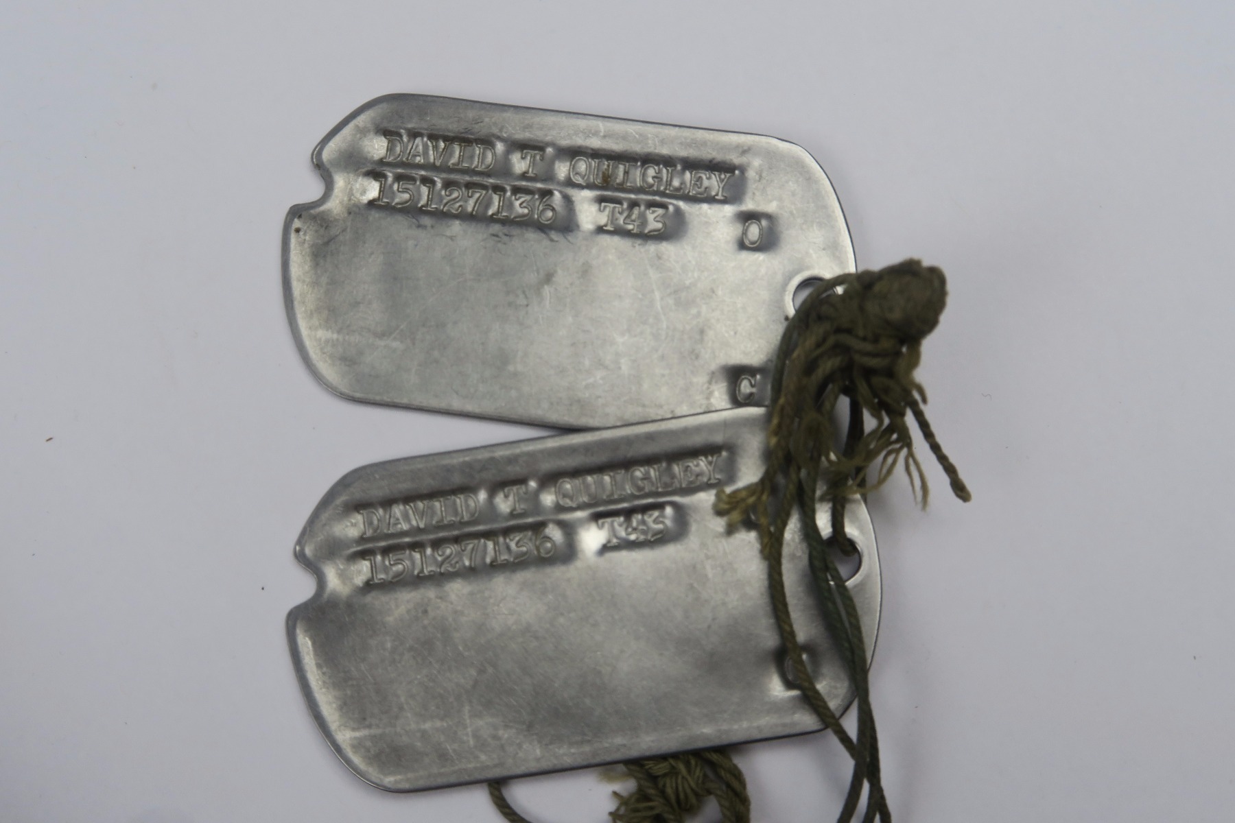 12/5/17 – This is a rare offering of a WW2 Paratrooper veteran’s belongings including two US M3 Fighting knives the solider was issued during his time of service. Each blade is engraved on one side with the soldier’s name: “David T. Quigley” and serial number. David Quigley fought with the US Airborne paratroopers and we have his parachute log record, US Airborne patch and pin, Soldier’s Pay Record booklet, Motor Vehicle Permit, dog tags, photo, and two identification cards for when he was enlisted in the Army Reserve Corps. Furhter research on this soldier found that he was born June 6th 1925, received a Purple Heart during WW2, and died on February 10th, 1991. Everything shown in photos is included with this listing. The two blades are different maker stamps, one being CASE blade marked and the other being KINFOLKS blade marked. The family had each blade engraved with his name after he returned from WW2. This is a very cool grouping of REAL US history! Guaranteed all original and authentic.