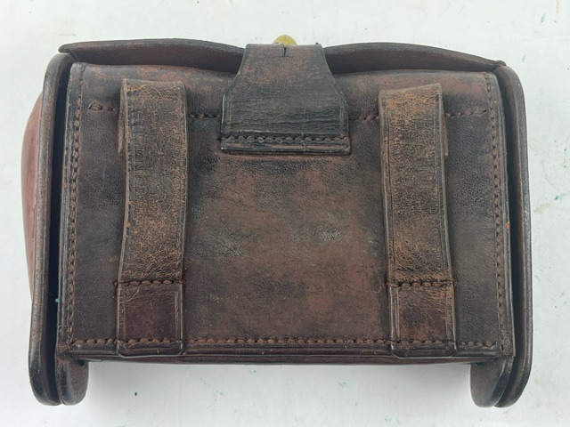 10/12/23 – This is US Pre WW1 McKeever Pattern Cartridge Box from 1904. Canvas loops on the interior for 20, .30 caliber rifle rounds. Normal age and wear but no major damage, nice gloss to the leather surface, with scattered patches of surface dryness on the edges.