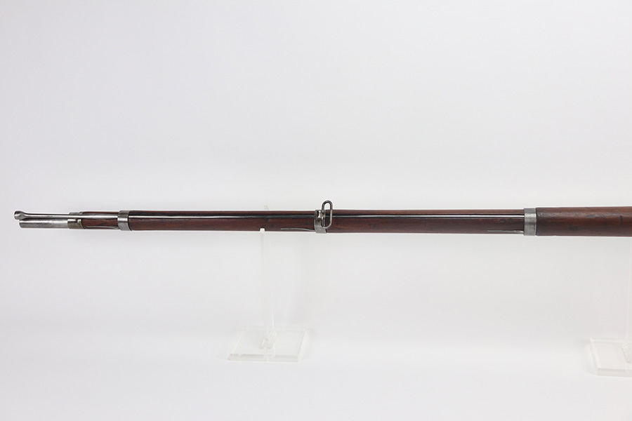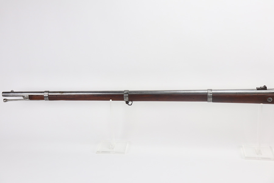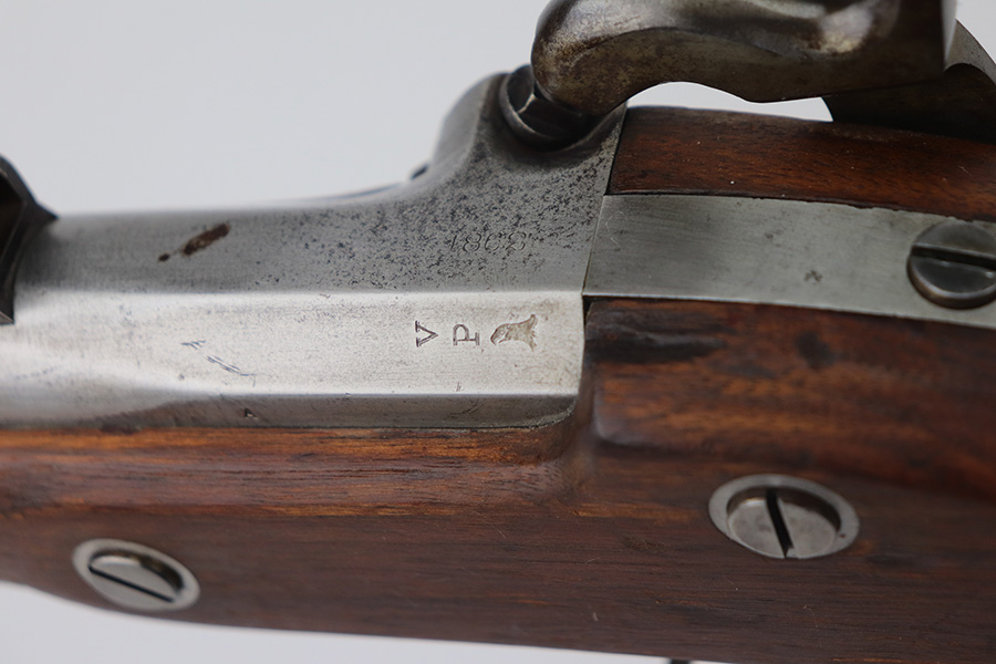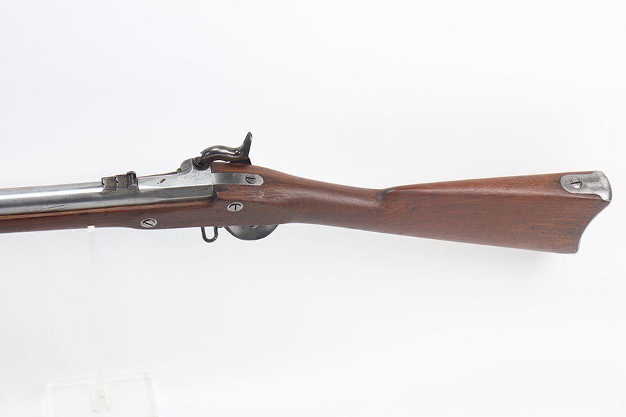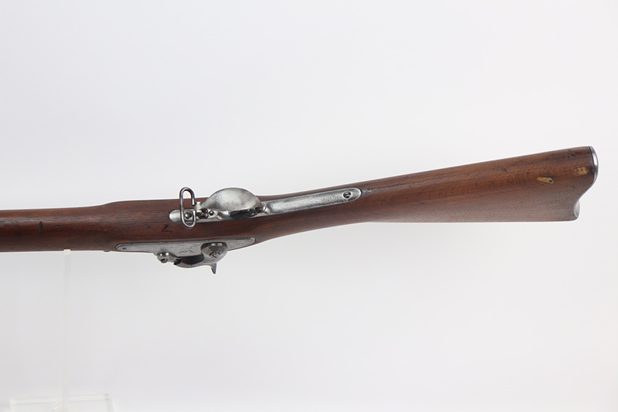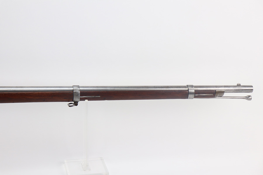 6/21/21 – This is a very nice example of a Springfield Model 1861 Rifle issued to the US military in 1862. The gun has the proper military proofs on the receiver. The lock has the proper Springfield logo and is dated 1862. The butt plate is marked “US”. The stock has very faint inspector proofs on the left side. Overall, the gun is in very nice condition with spotty oxidation throughout and areas of minor pitting here and there, most noticeable around the muzzle, on the barrel bands, and on the top of the receiver. There are a few noticeable scratches on the left side of the barrel. The stock is excellent but has been sanded – markings just barely visible. The bore is excellent – shiny with strong rifling. 40″ barrel. NOTE: The trigger guard is loose/can be removed if pulled down on.