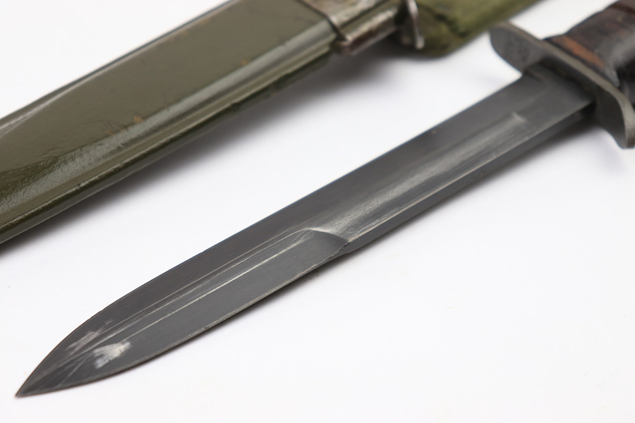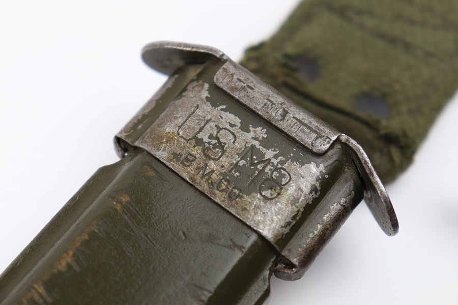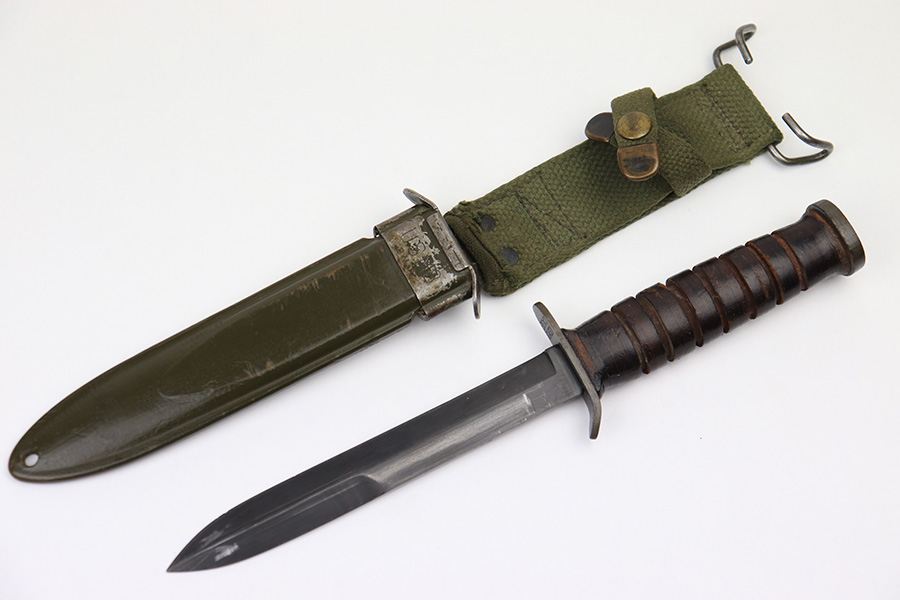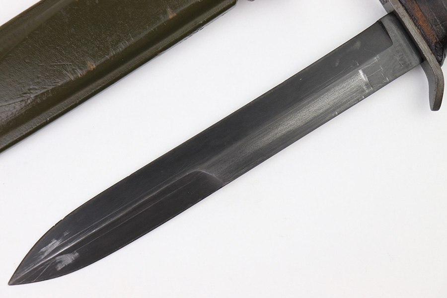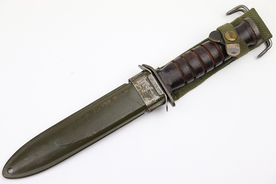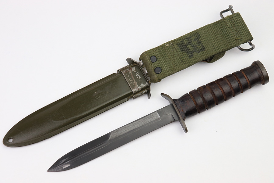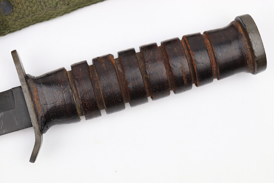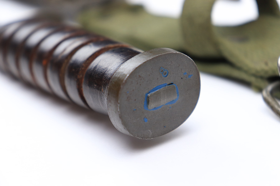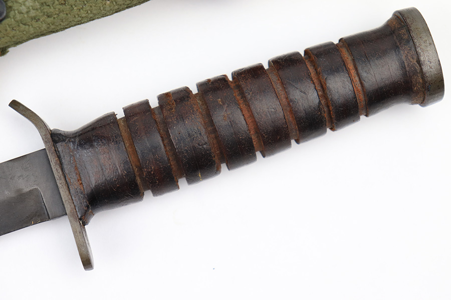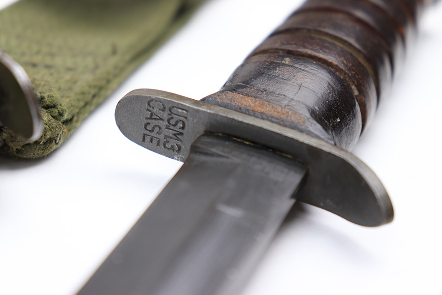 7/12/22 – This is an original US M3 fighting knife made by CASE during WW2. The fighting knife comes with an original US M8 scabbard, but we believe the scabbard has a replaced canvas frog. The knife is in great condition with very nice bluing throughout. The edge has a few nicks and signs of previous use wear. The hand guard is maker stamped. The leather handle is in excellent condition. The pommel is stamped with a flaming bomb ordnance proof. Great overall condition.