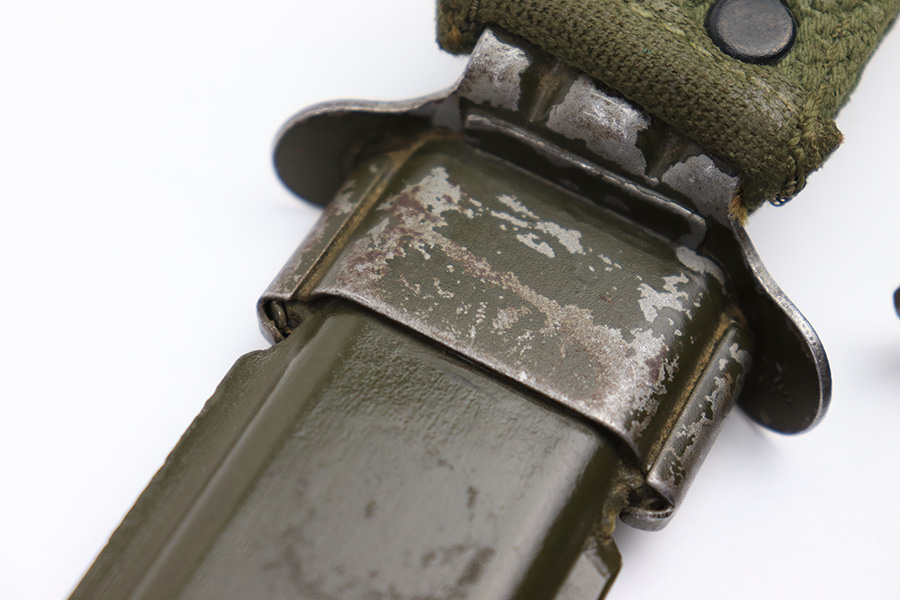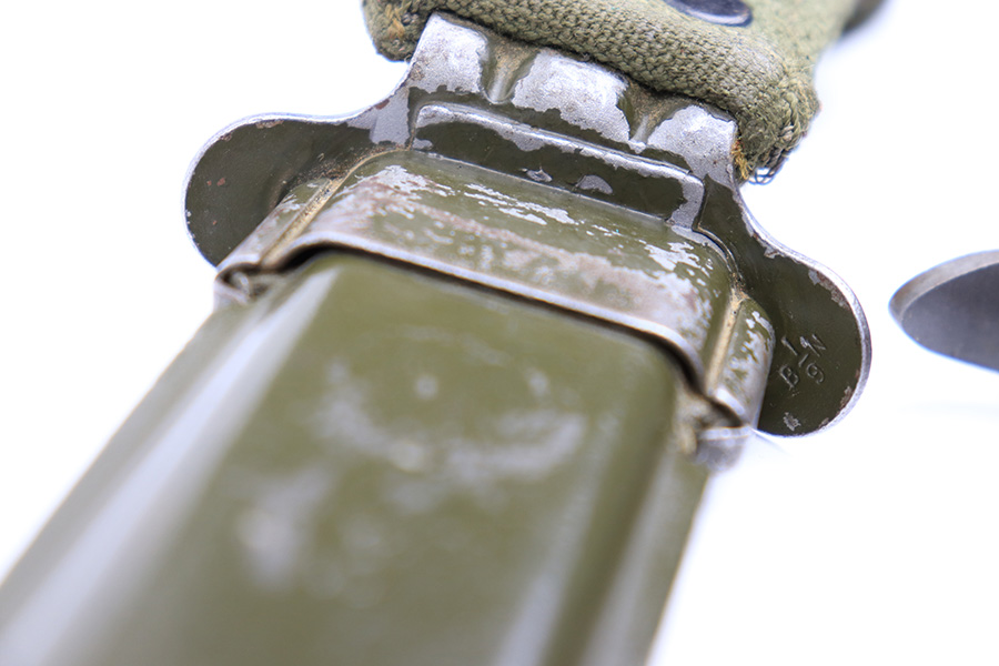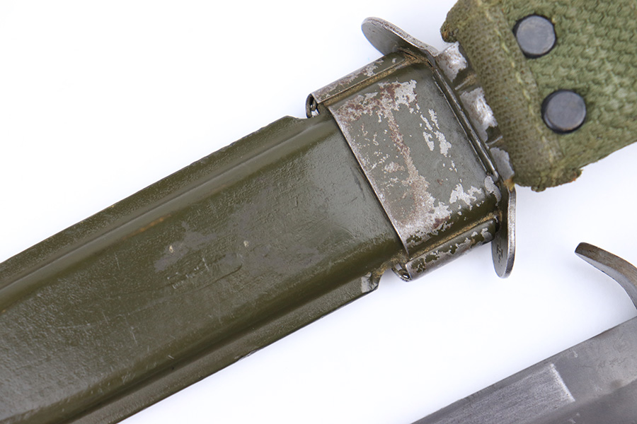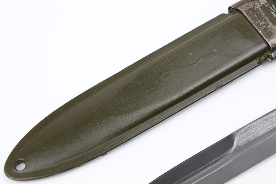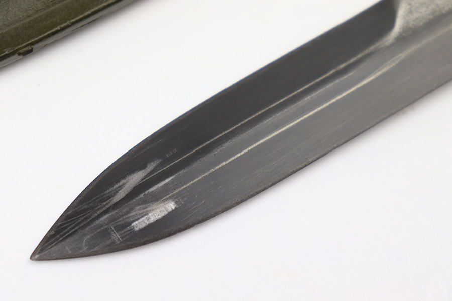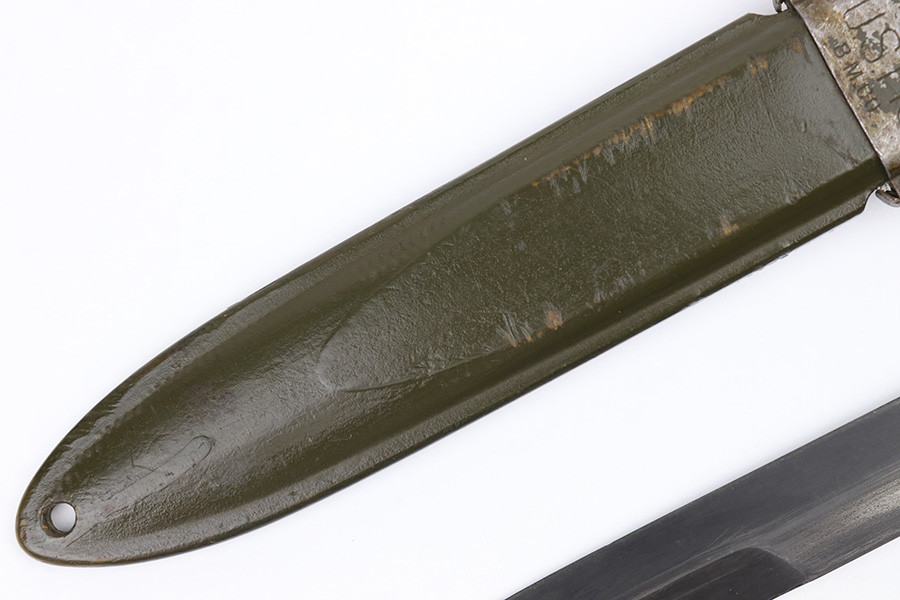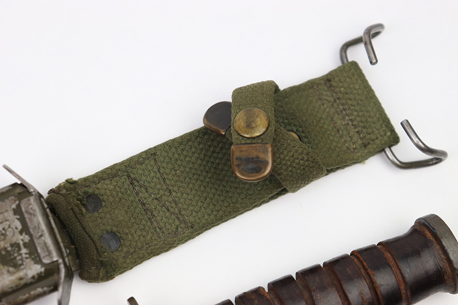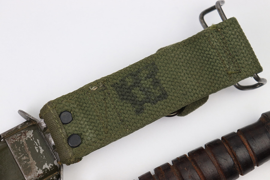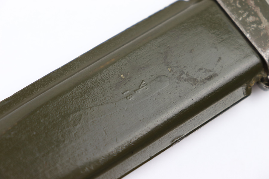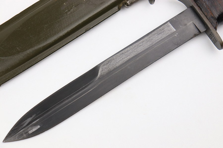 7/12/22 – This is an original US M3 fighting knife made by CASE during WW2. The fighting knife comes with an original US M8 scabbard, but we believe the scabbard has a replaced canvas frog. The knife is in great condition with very nice bluing throughout. The edge has a few nicks and signs of previous use wear. The hand guard is maker stamped. The leather handle is in excellent condition. The pommel is stamped with a flaming bomb ordnance proof. Great overall condition.