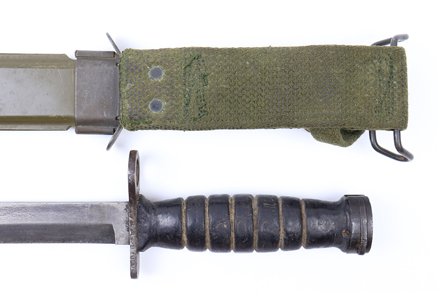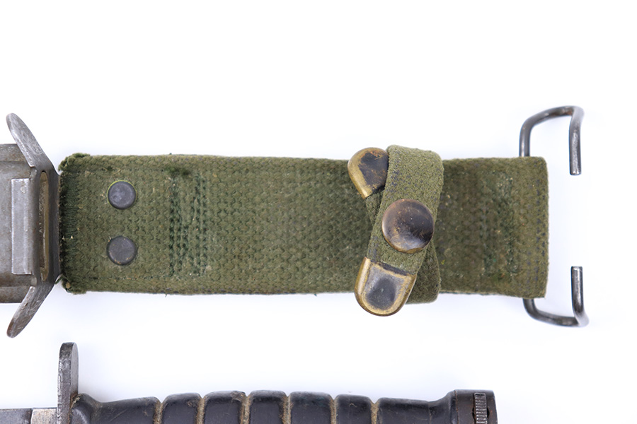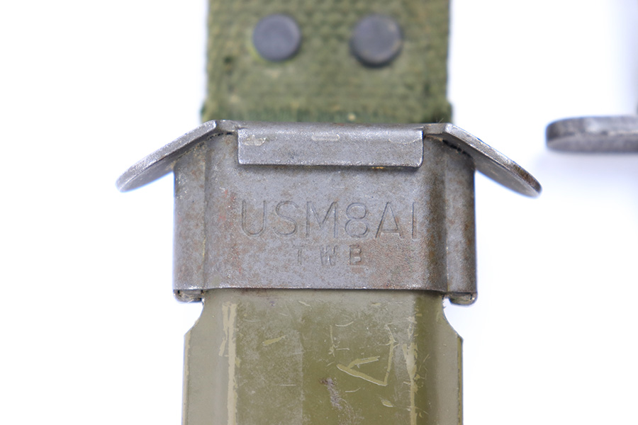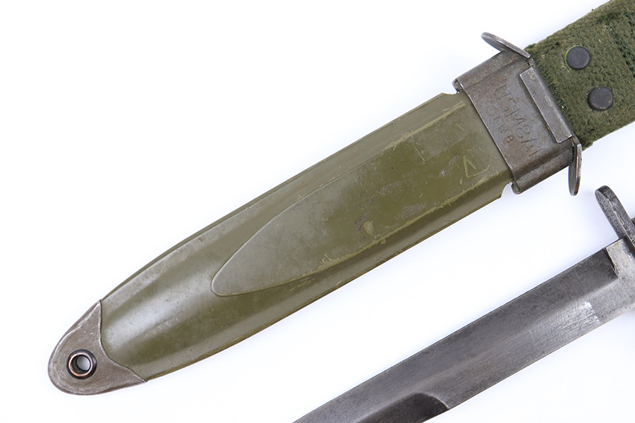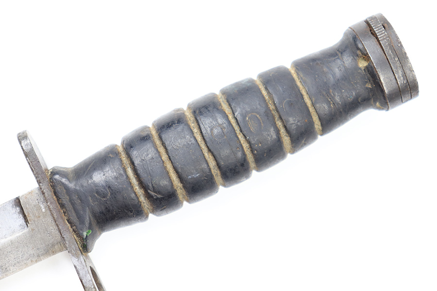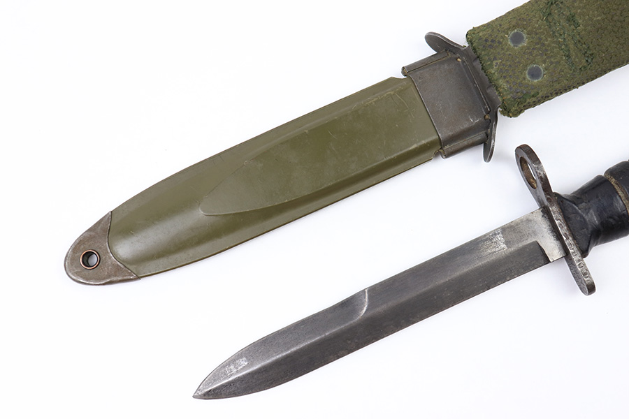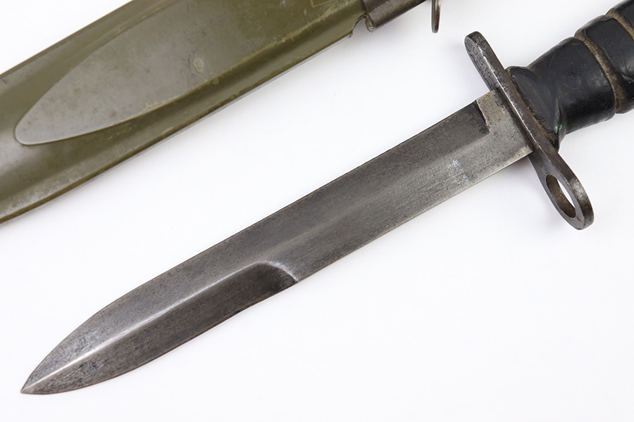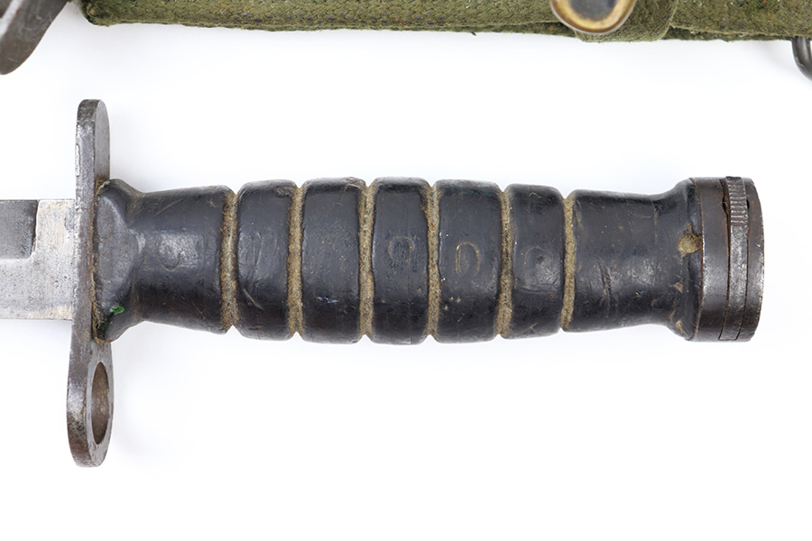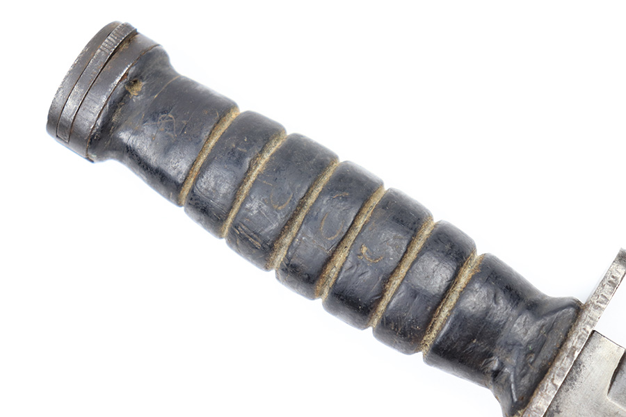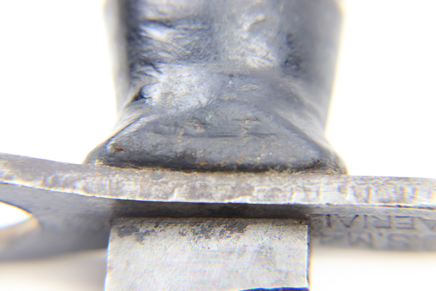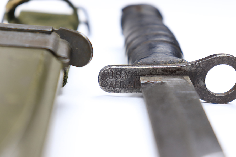 6/24/22 – This is an original USM4 Aerial Bayonet. The bayonet blade has no signs of sharpening but there is patina and surface wear throughout the blade. The blued finish is mostly thinned out. There are some signs of previous use along the edge. The hand guard is maker and ordnance stamped. The leather handle appears to have some faint numbers that were stamped into the leather a while ago. General signs of aging throughout the handle and pommel. Comes with a post WW2 USM8A1 scabbard.