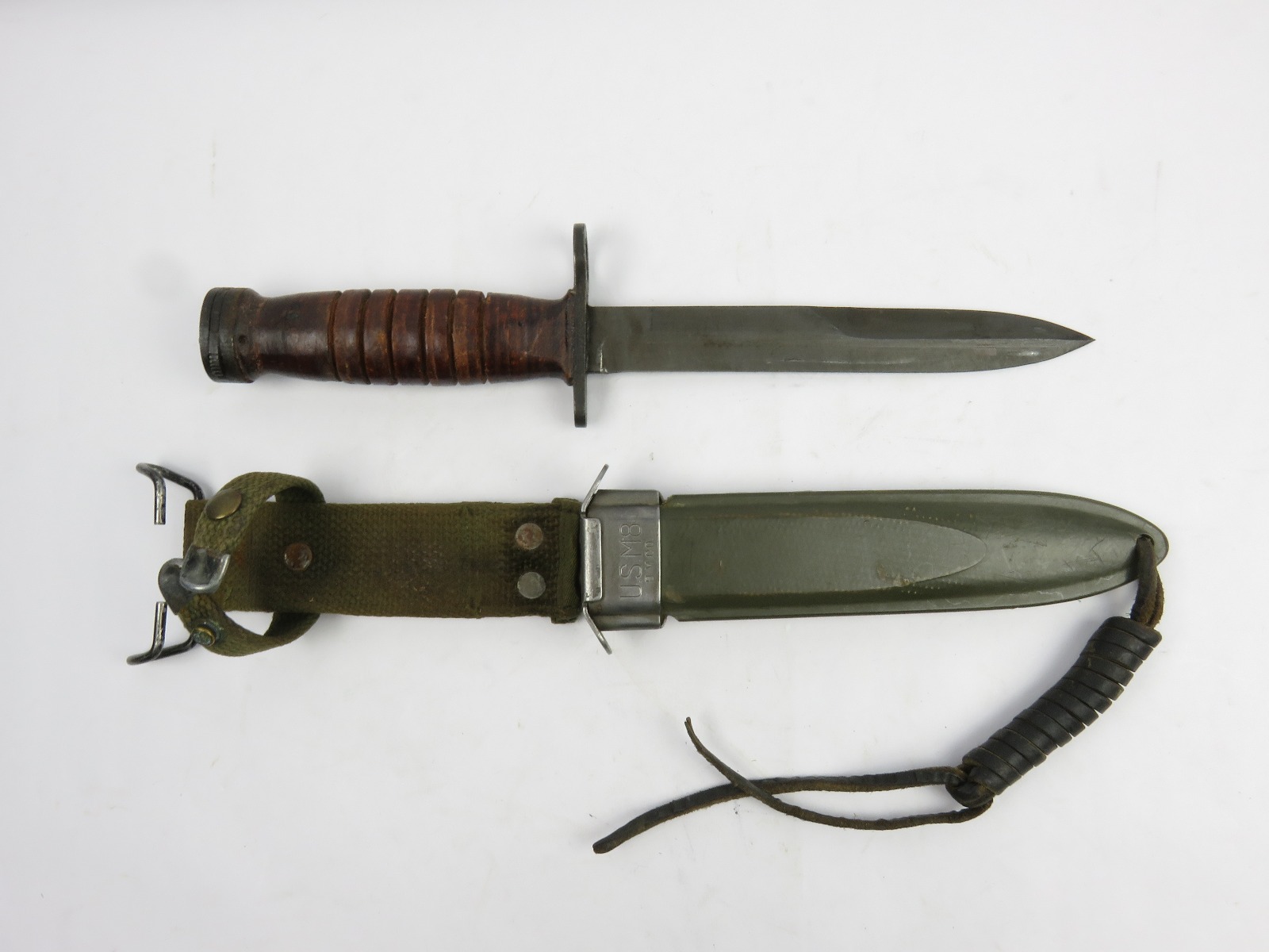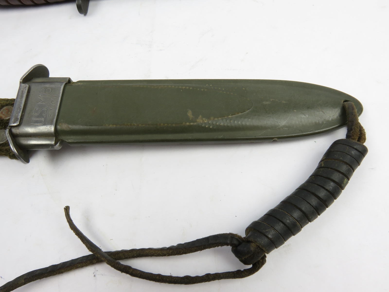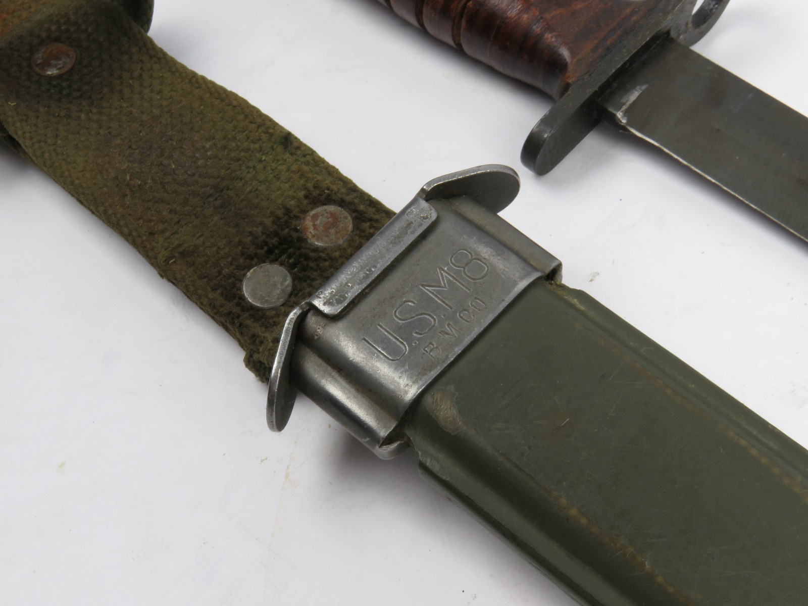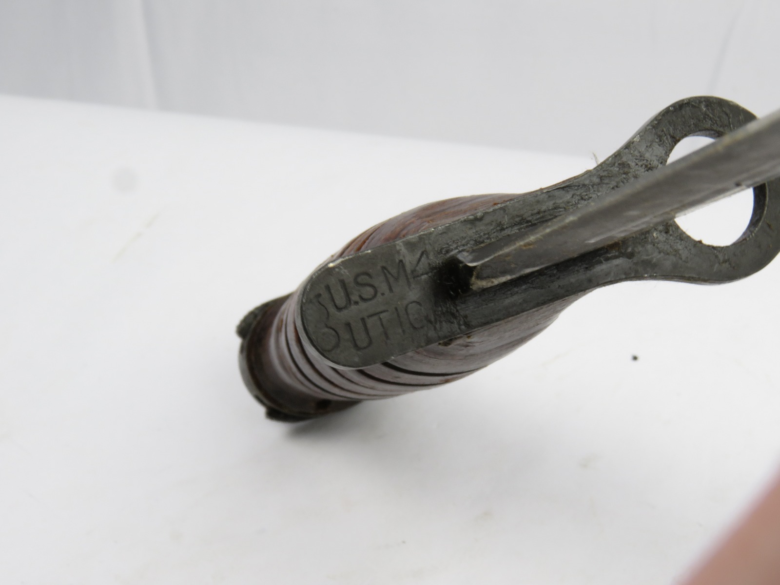 12/13/17 – This is an original US M1 Carbine bayonet. The bayonet hand guard is maker stamped “UTICA” with a US flaming bomb ordnance stamp, and “USM4”. The leather handle is excellent, and the blade is unsharpened with only minor/normal discoloration (from oils). The scabbard is marked “USM8” and made by “B.M. Co.”. Guaranteed original and authentic.