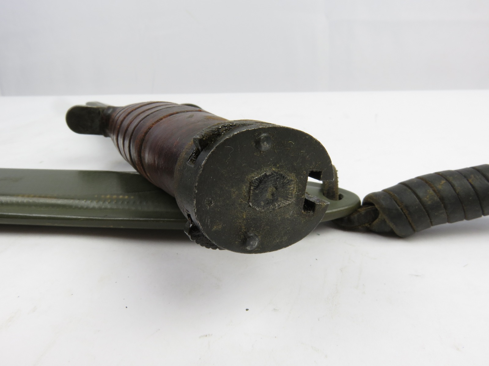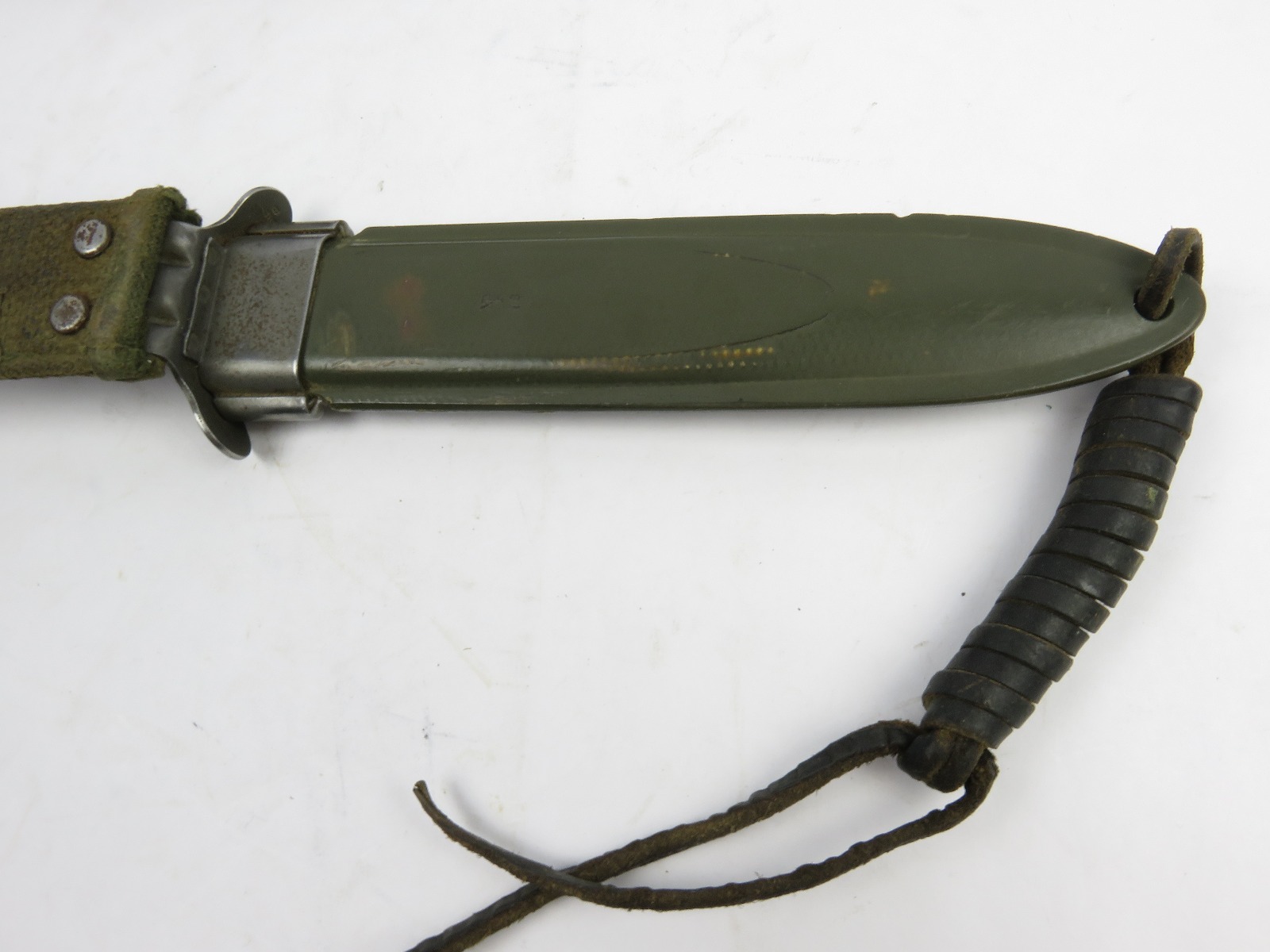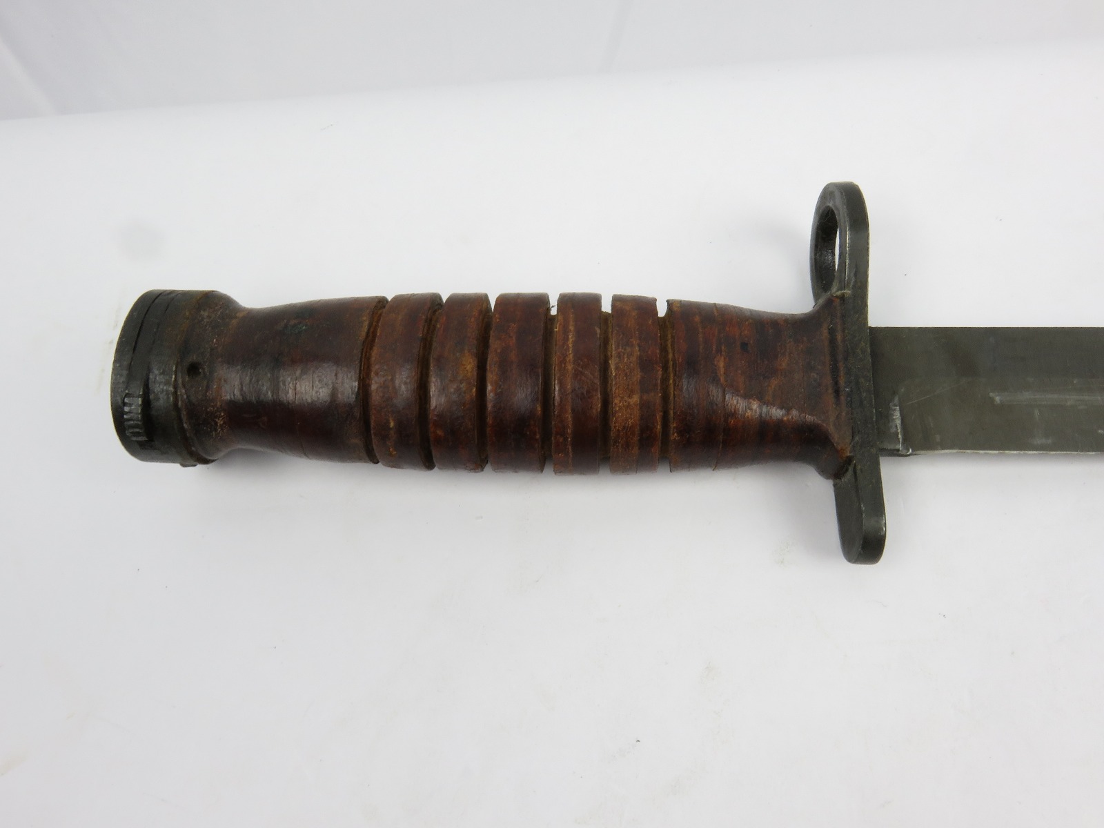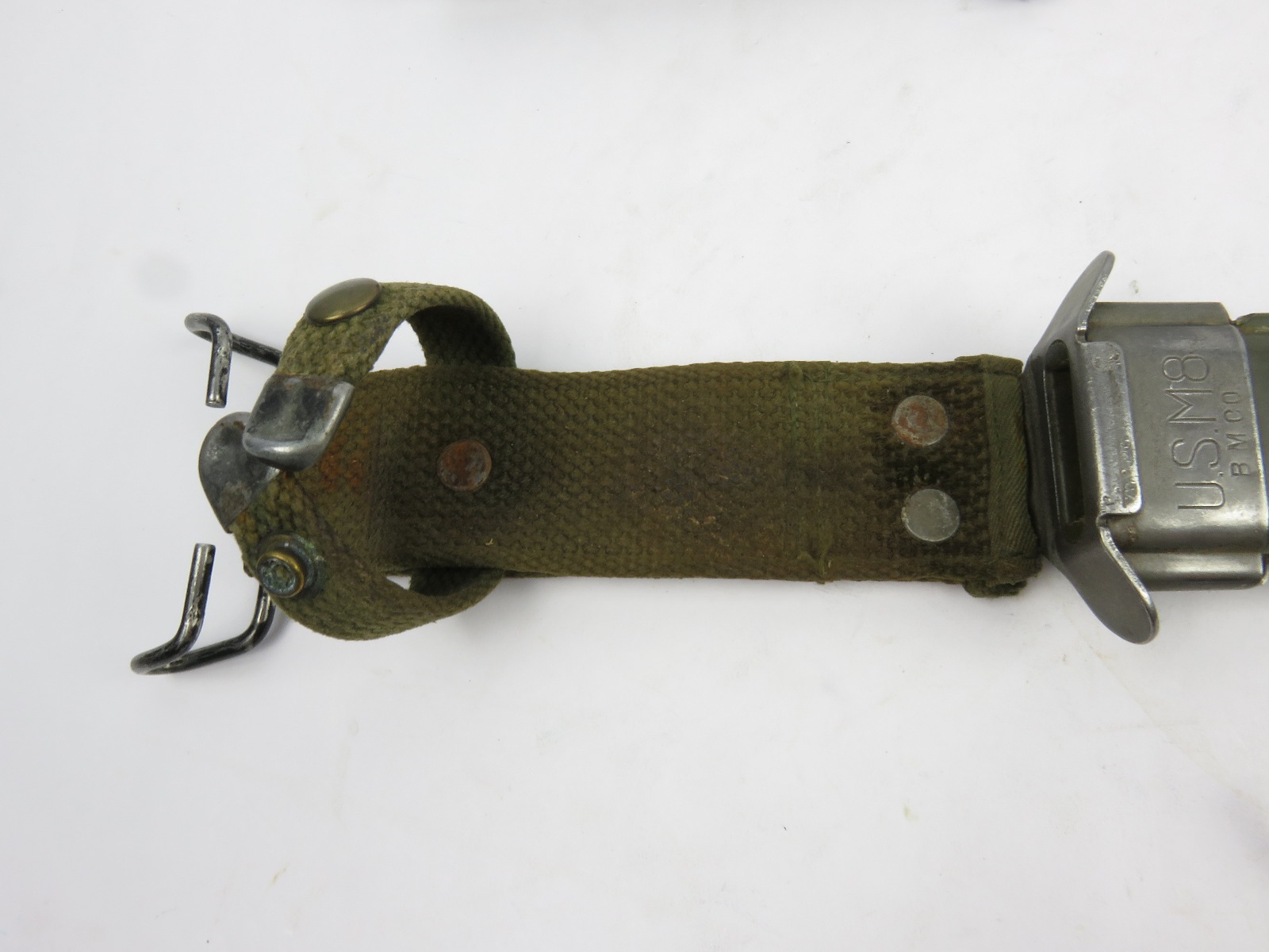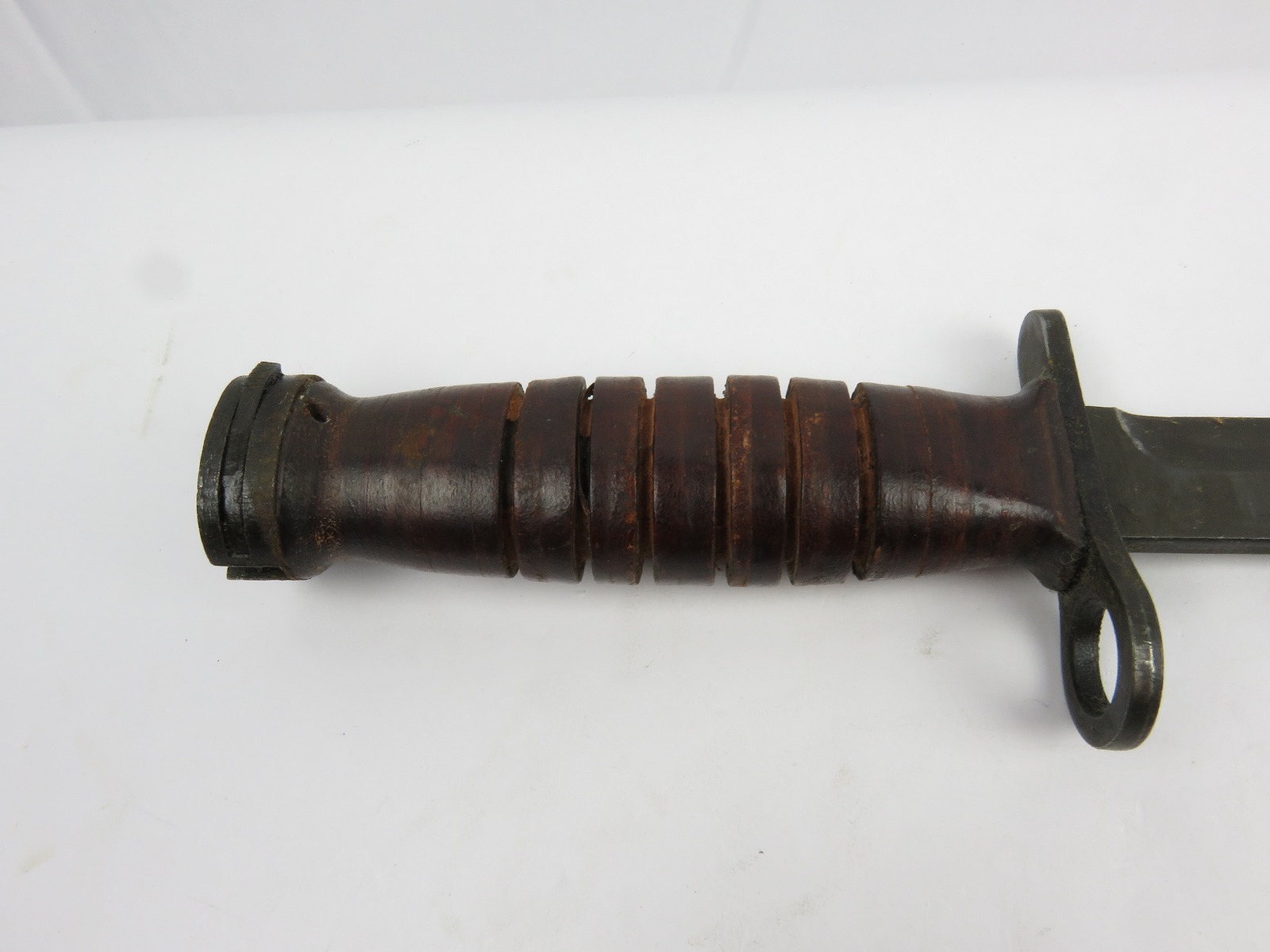 12/13/17 – This is an original US M1 Carbine bayonet. The bayonet hand guard is maker stamped “UTICA” with a US flaming bomb ordnance stamp, and “USM4”. The leather handle is excellent, and the blade is unsharpened with only minor/normal discoloration (from oils). The scabbard is marked “USM8” and made by “B.M. Co.”. Guaranteed original and authentic.