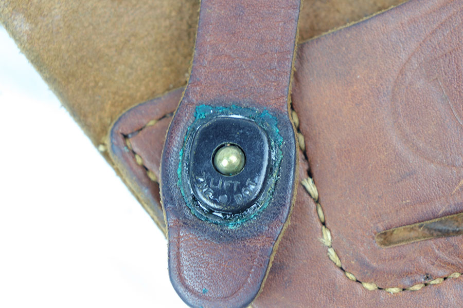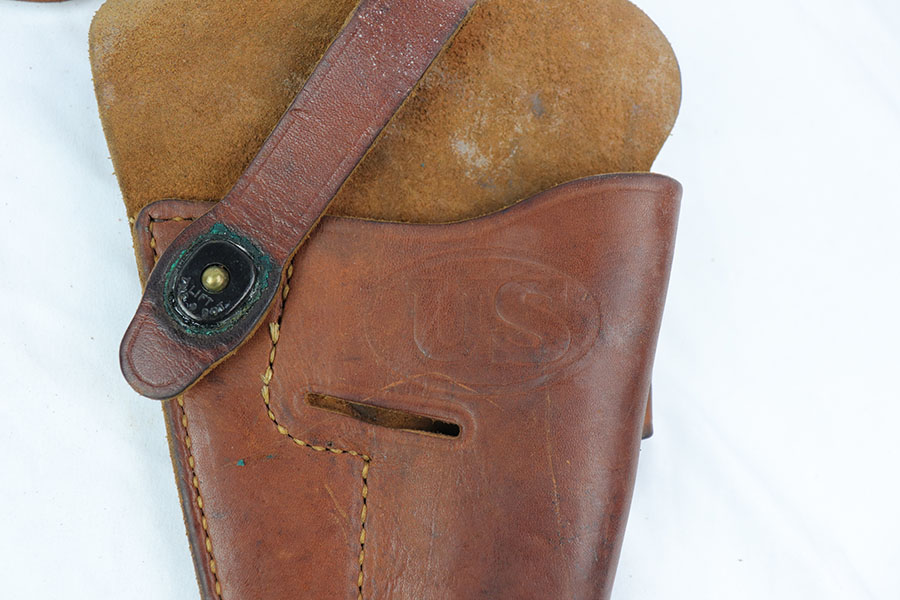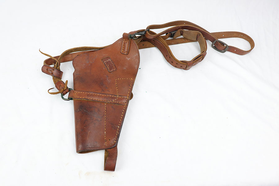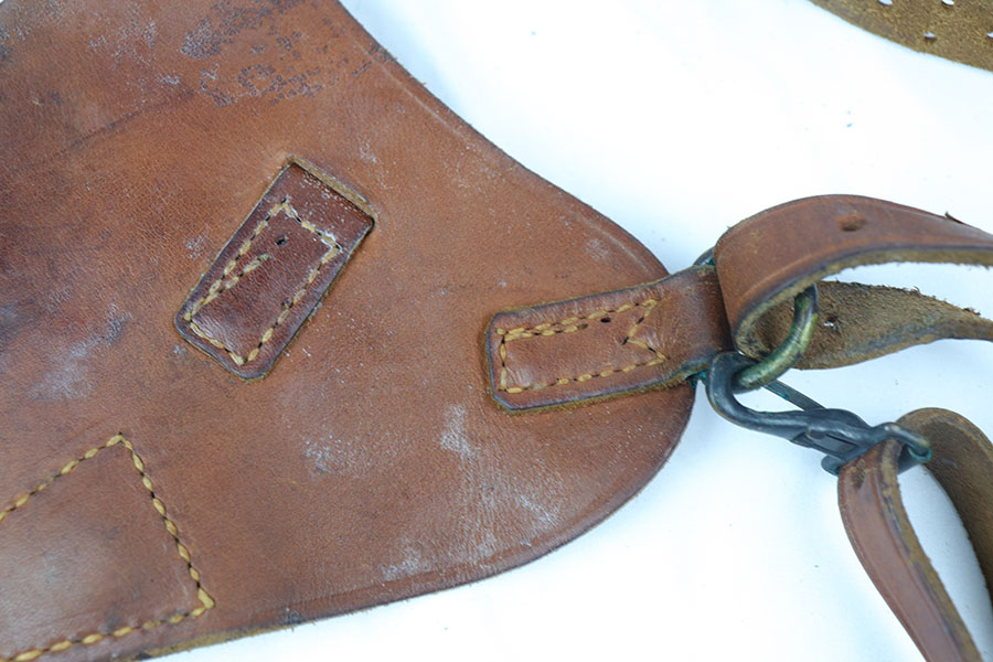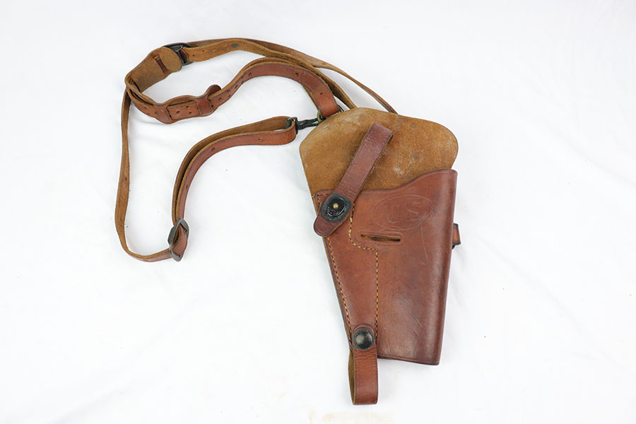8/10/20 – This is an end-of-ww2 production USMC shoulder holster for the 1911A1 pistol. The holster is stamped USMC BOYT ’45 on the back leather. The leather is soft and pliable but still completely in tact with no major issues. All original stitching in tact as well. Shoulder strap has strong leather and minimal surface wear. A highly desirable piece of WW2 US history.