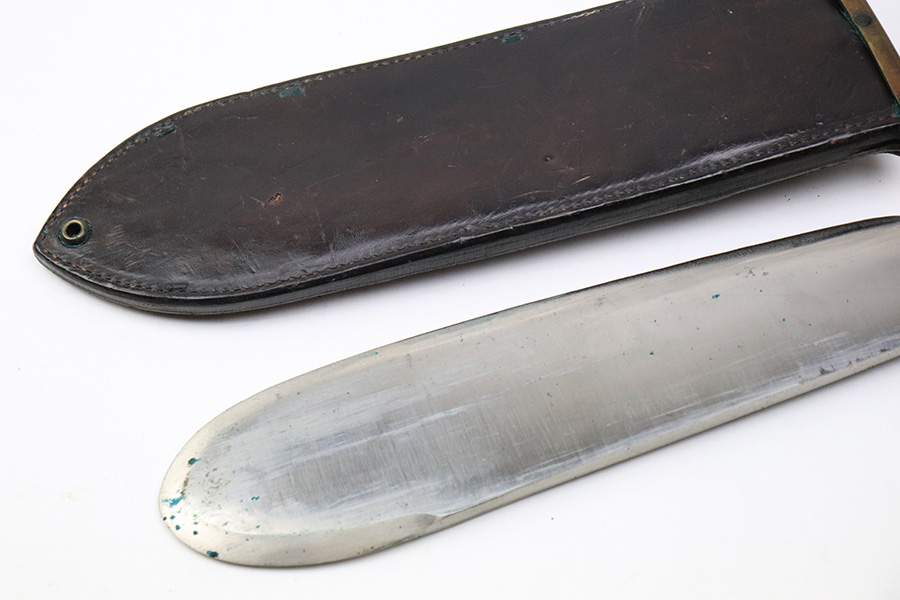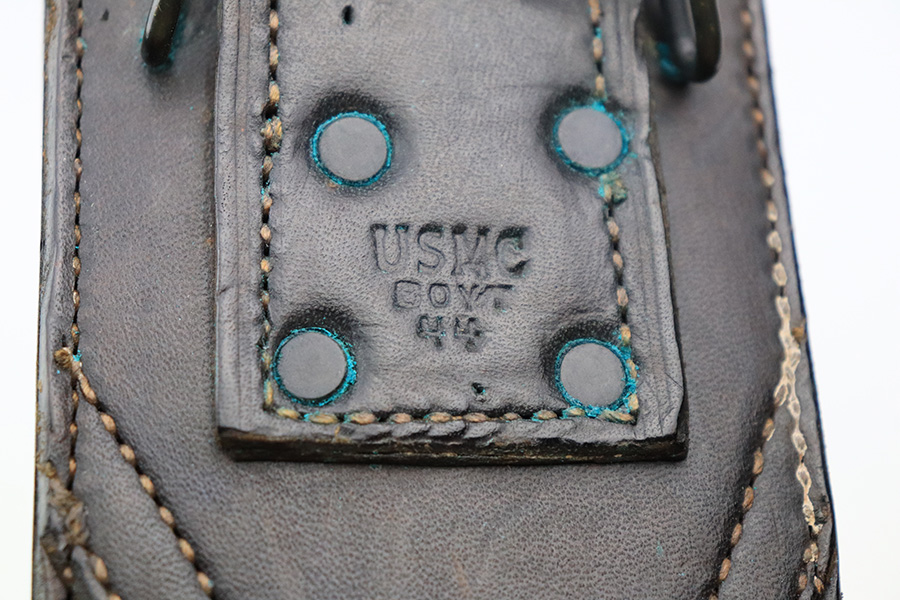 6/8/22 – This is an original WW2 production USMC bolo knife with the original scabbard. The blade is USMC stamped on one side, with a faint Clyde Cutlery maker marking found on the same side of the blade. There is some mild surface wear and spots of dark oxidation on the blade but overall the blade is clean. The wood handle has no cracks or chips, and 4 rivets all intact. The leather scabbard is in great condition with excellent stitching and a brass metal mouth. The backside is maker stamped and 1944 dated.