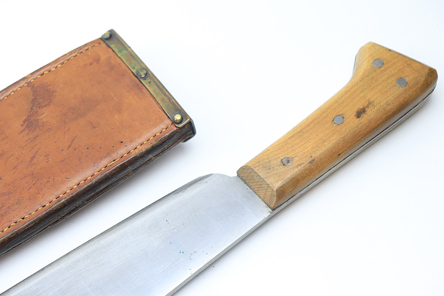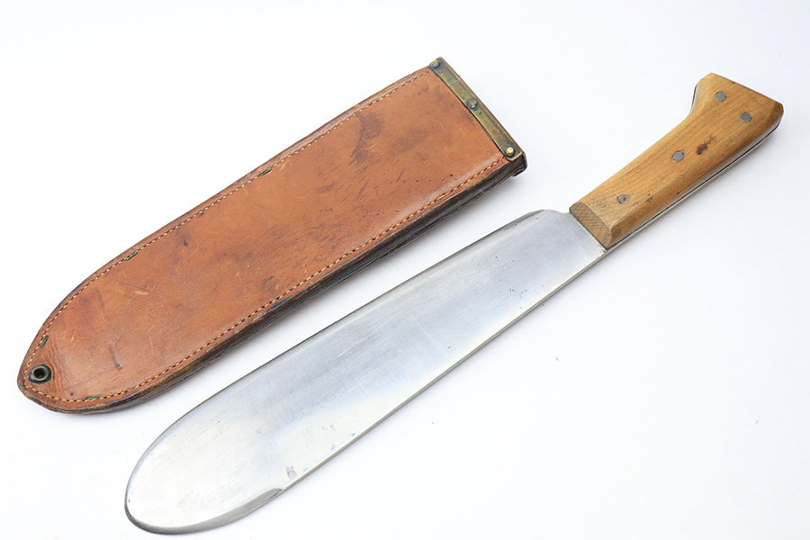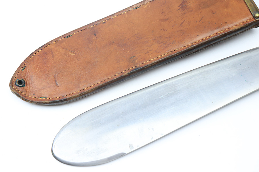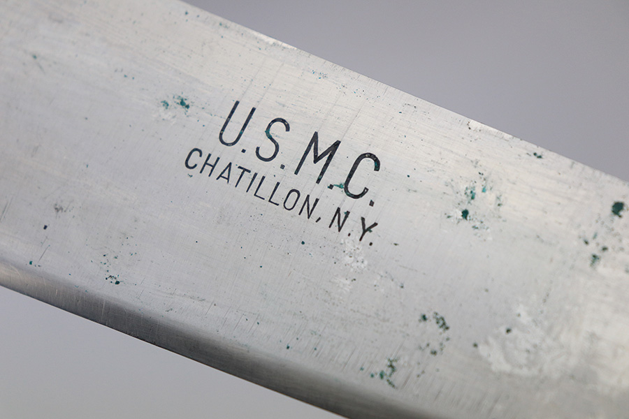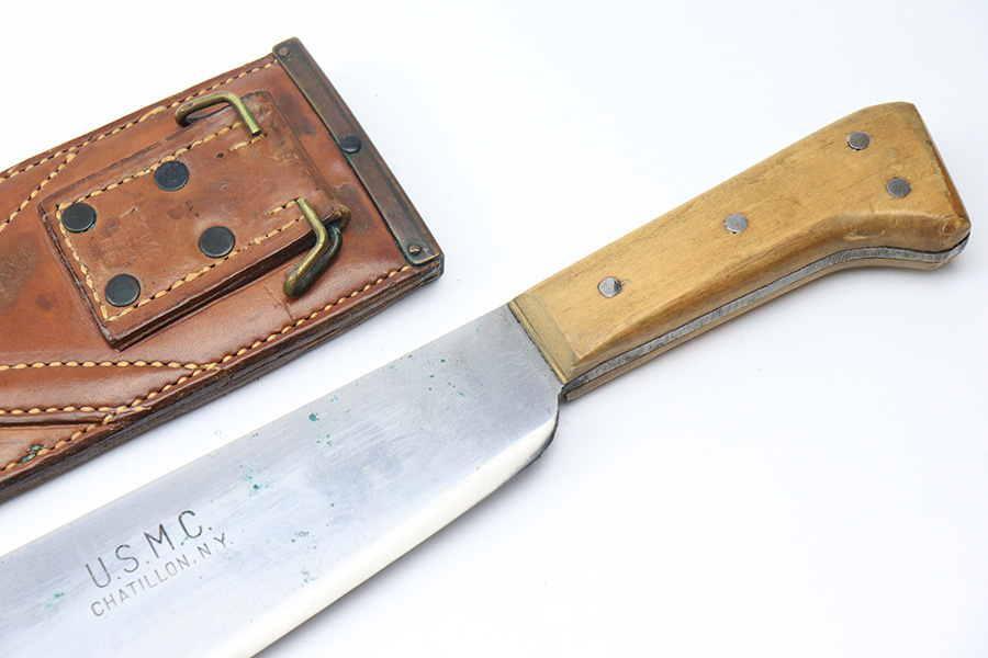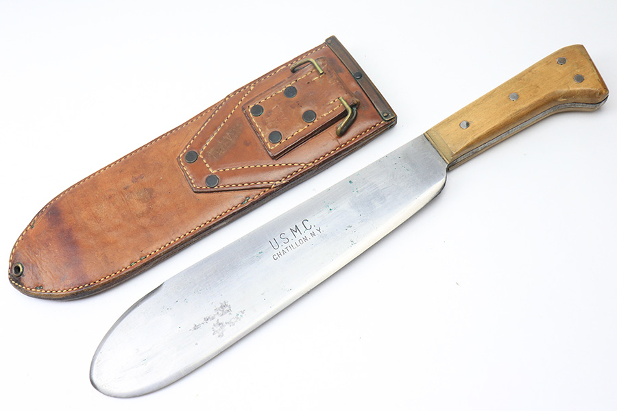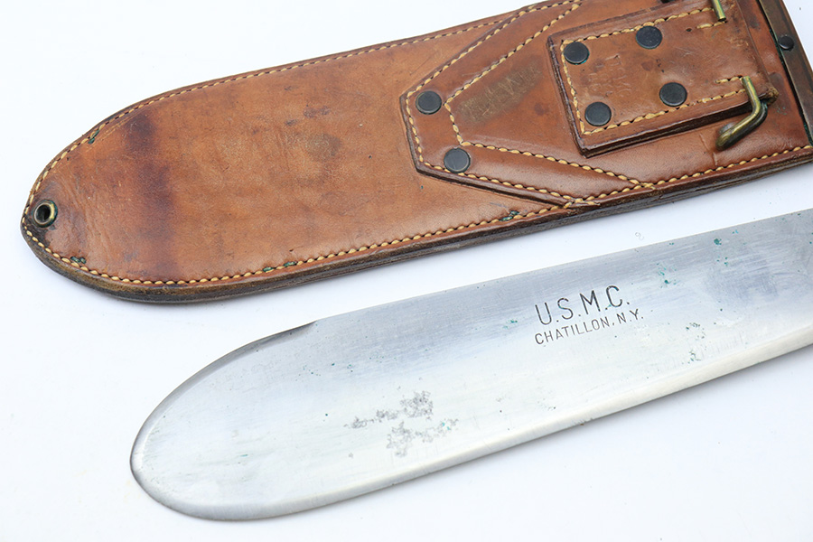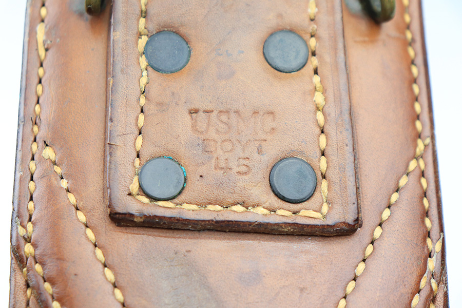 5/31/22 – This is a USMC issued bolo utility knife / machete from WW2. The blade is USMC stamped from Chatillon, NY. There is some mild surface wear from the scabbard, as well as light verdigris and a few small spots of dark oxidation / discoloration. No signs of sharpening nor any issues along the edge. The wood handle is in great condition. Comes with a leather scabbard that’s in great shape with no stitching issues and some mild leather wear. Maker stamped “USMC BOYT” with a 1945 date on the back of the sheath.