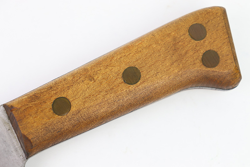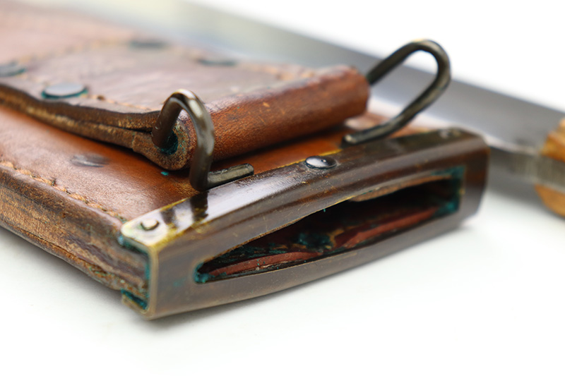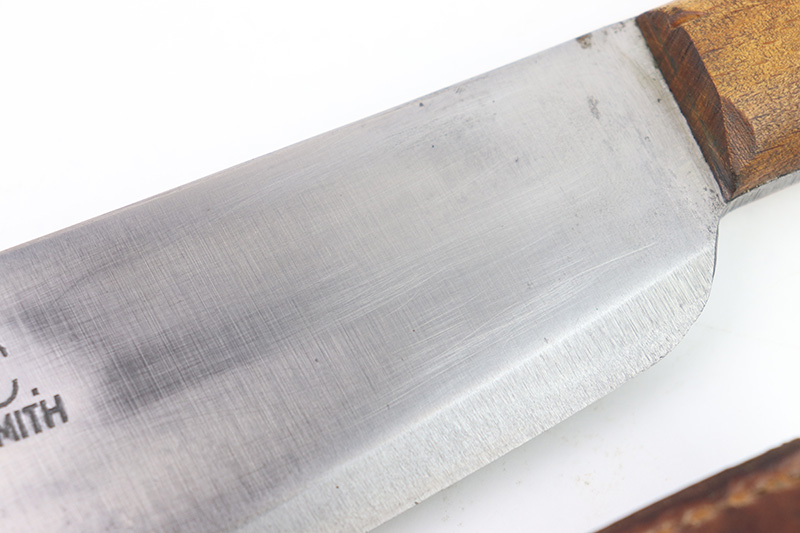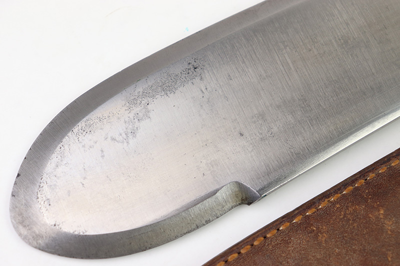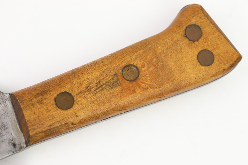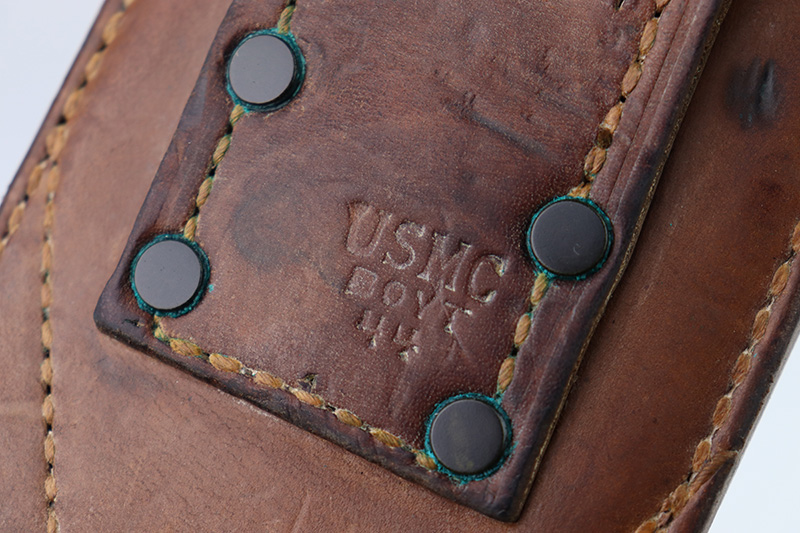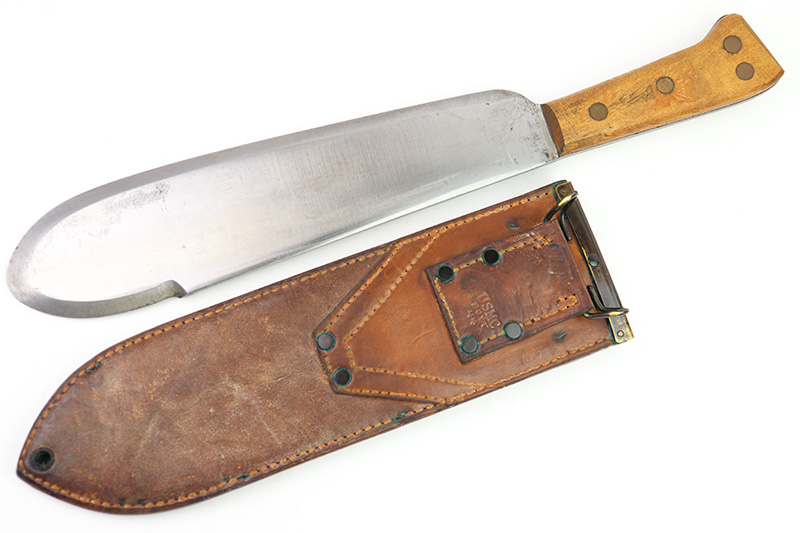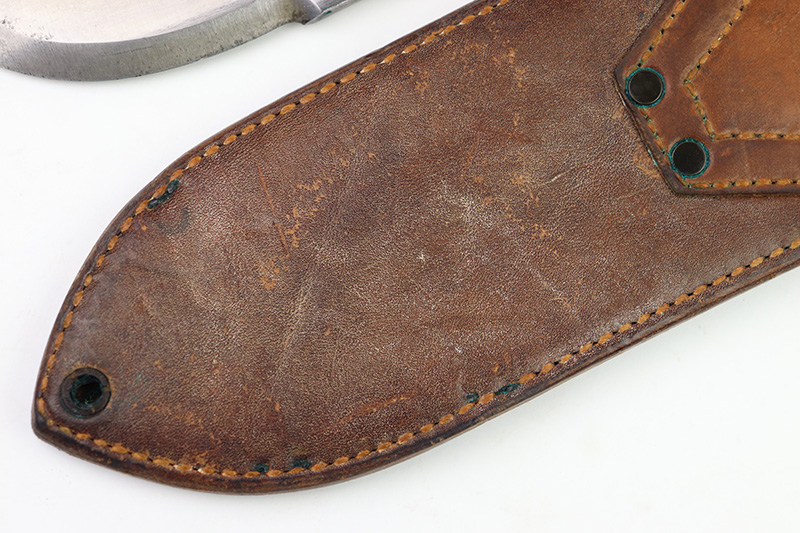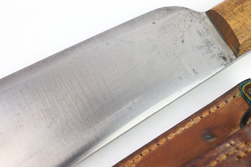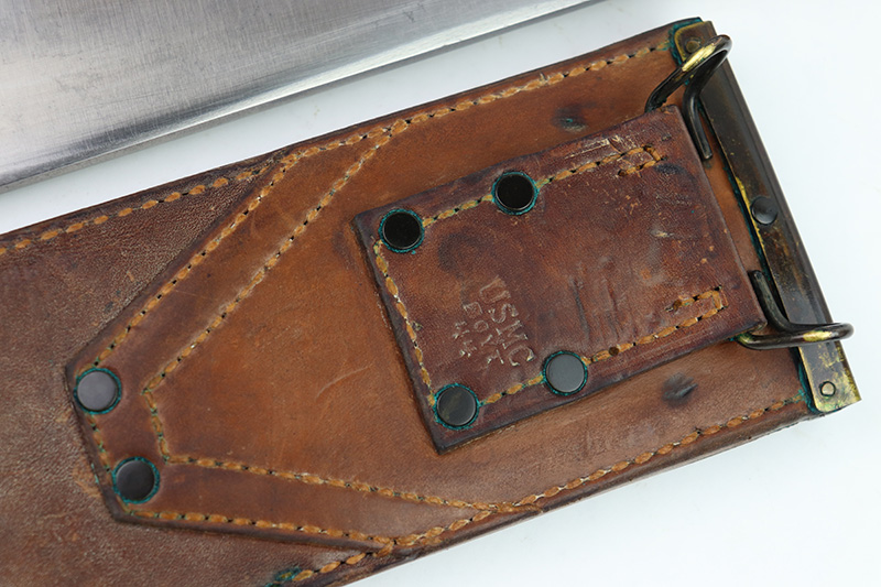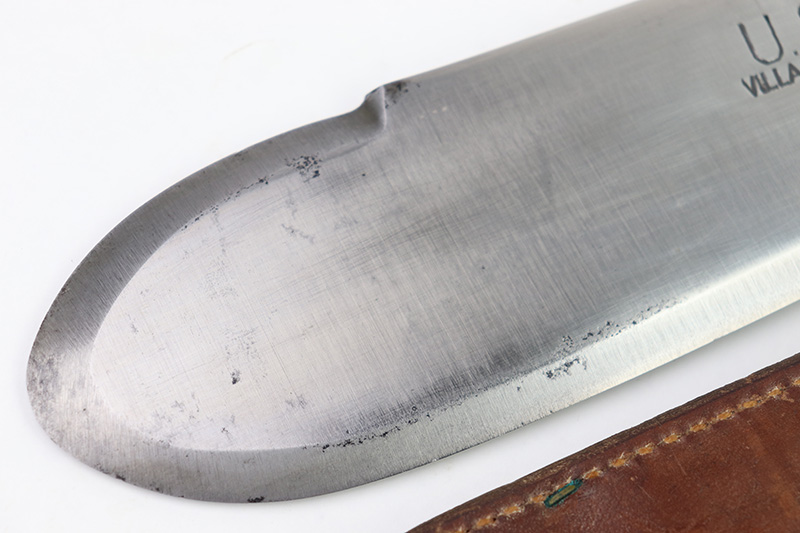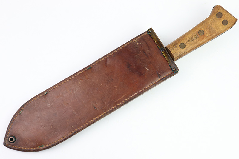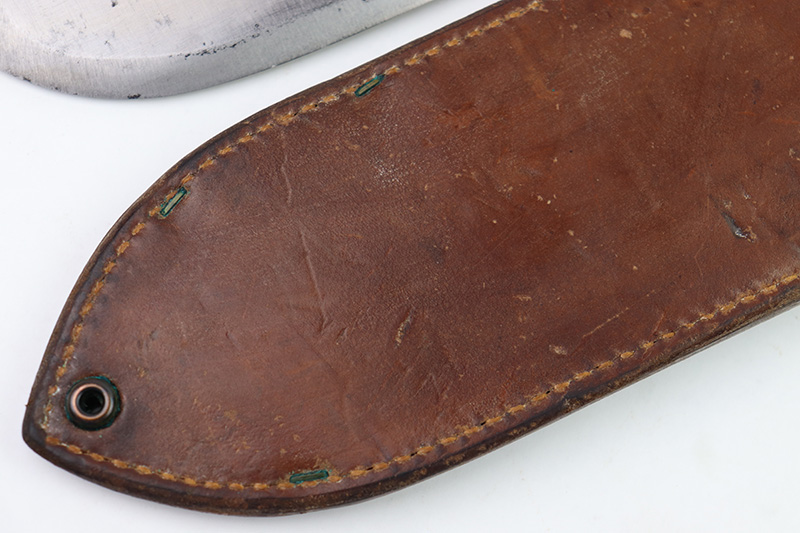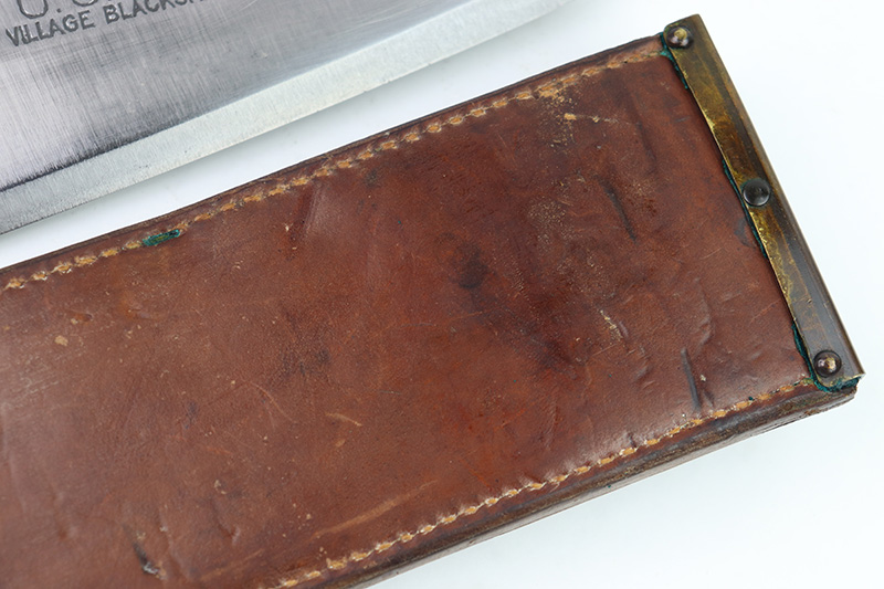 8/24/22 – This is an original WW2 production USMC Bolo knife made by Village Blacksmith. The bolo comes with an original leather sheath which is in great overall condition. The back of the sheath is maker stamped “USMC BOYT 44”. The bolo blade is in excellent condition with no signs of sharpening or abuse. There’s a few small spots of oxidation and surface wear but no major issues. Excellent wood handle with 4 rivets. A very nice example overall.