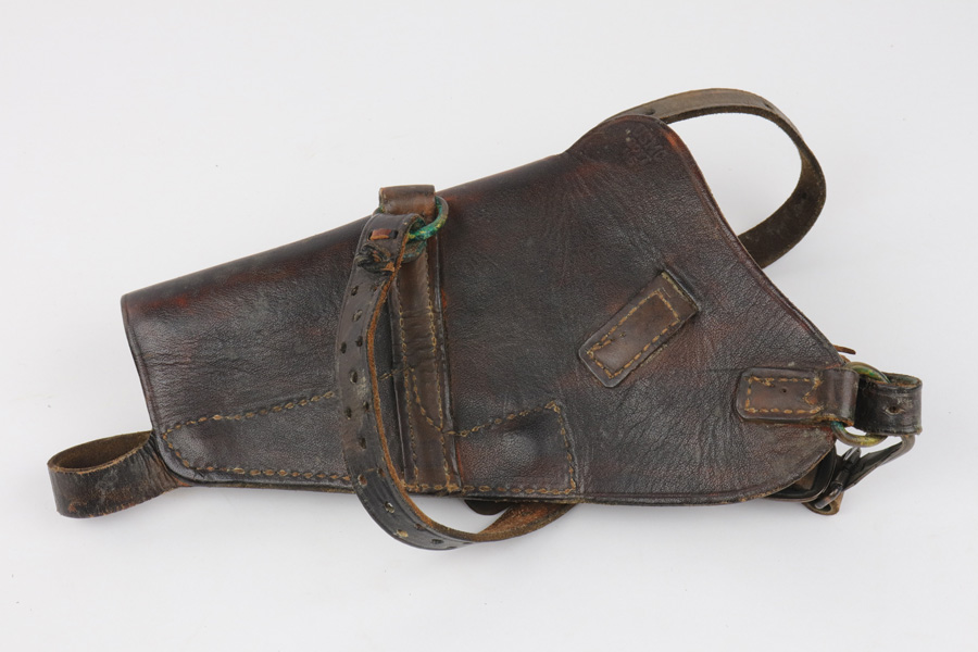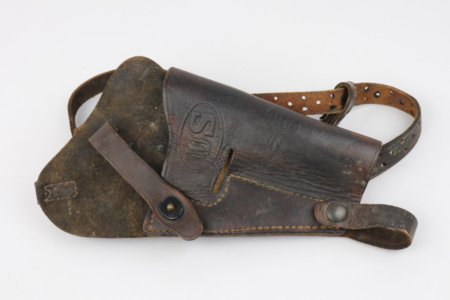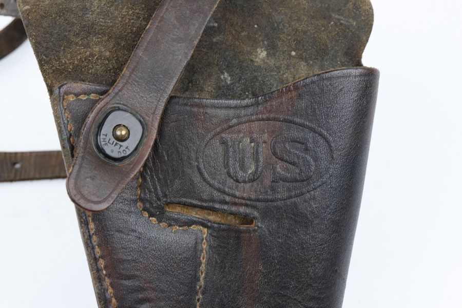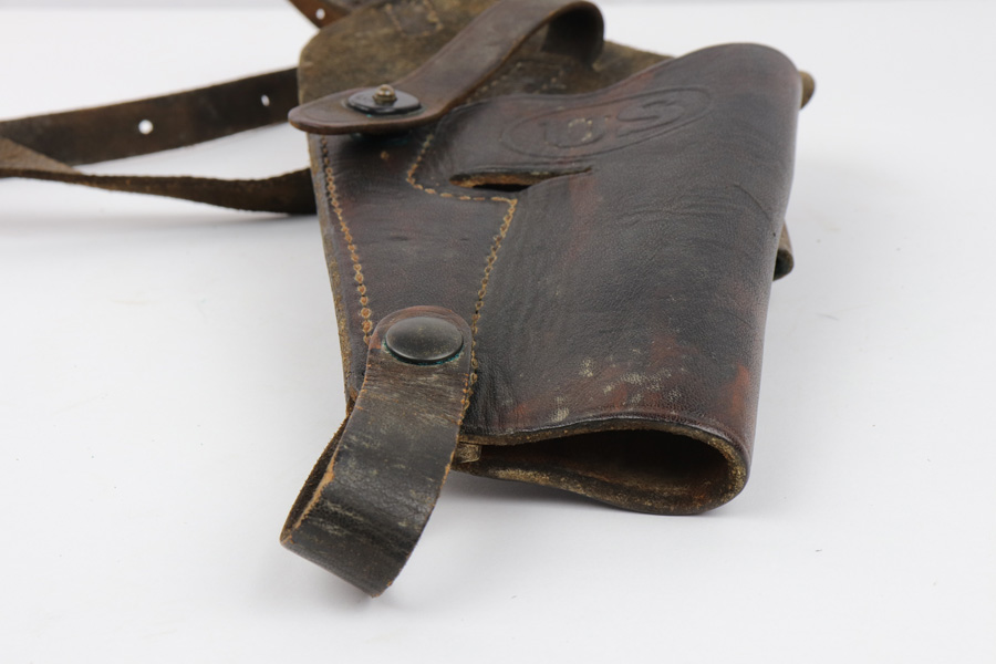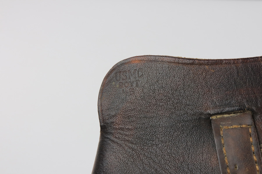 6/11/19 – This is an original 1911A1 USMC stamped holster. The holster was made at the end of WWII , and is dated 1945. The holster is in great condition overall but there are some signs of aging and normal use wear. The leather strap has minor wrinkling but overall is strong and in tact. All stitching is in tact and original. Stamped on the back leather for maker, year, and USMC.