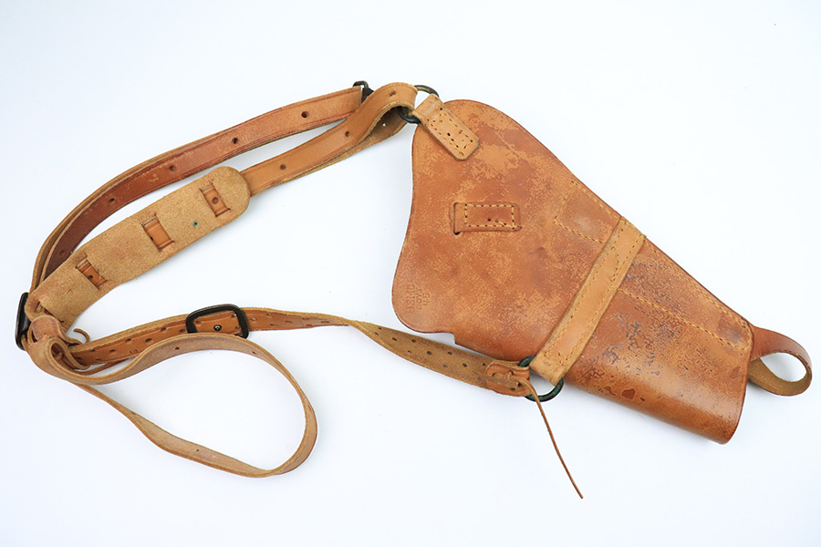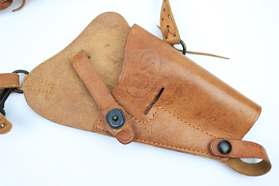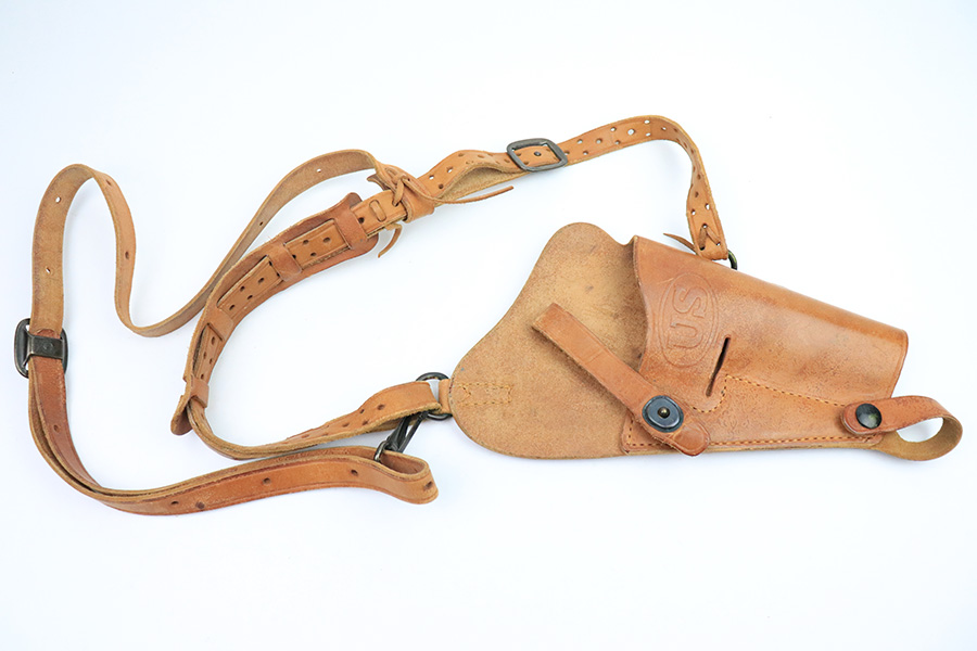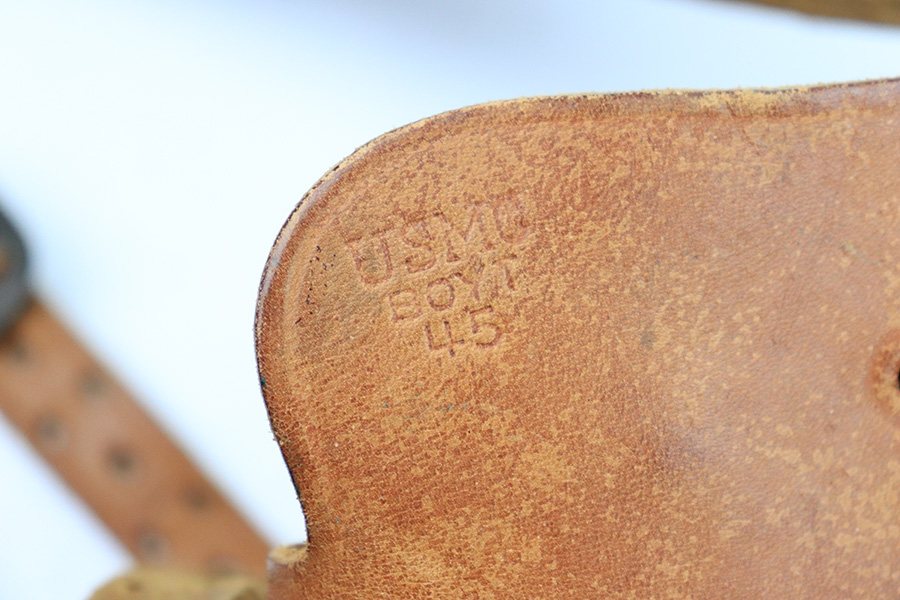 12/15/22 – This is a late WW2 production USMC M7 Shoulder Holster for a M1911A1 Pistol. The holster is in excellent overall condition with very clean leather and completely in tact shoulder straps. There is some mild surface staining on the leather as shown. No stitching issues and all original metal fixtures as well. Maker stamped, dated, and USMC stamped on the back leather.