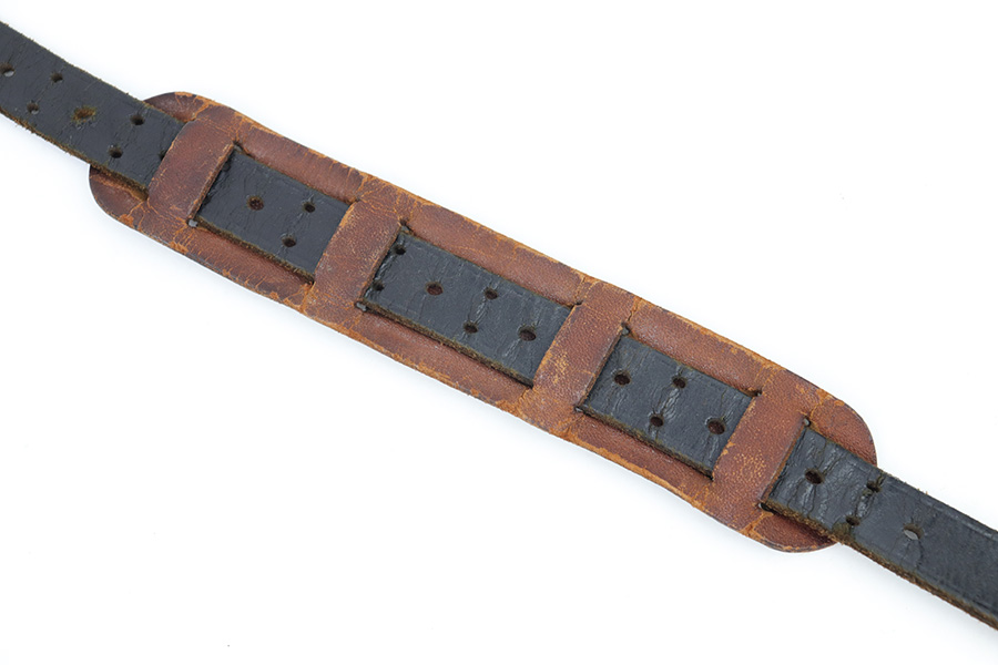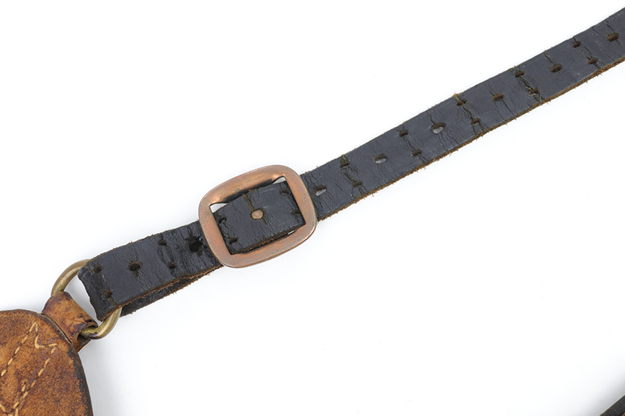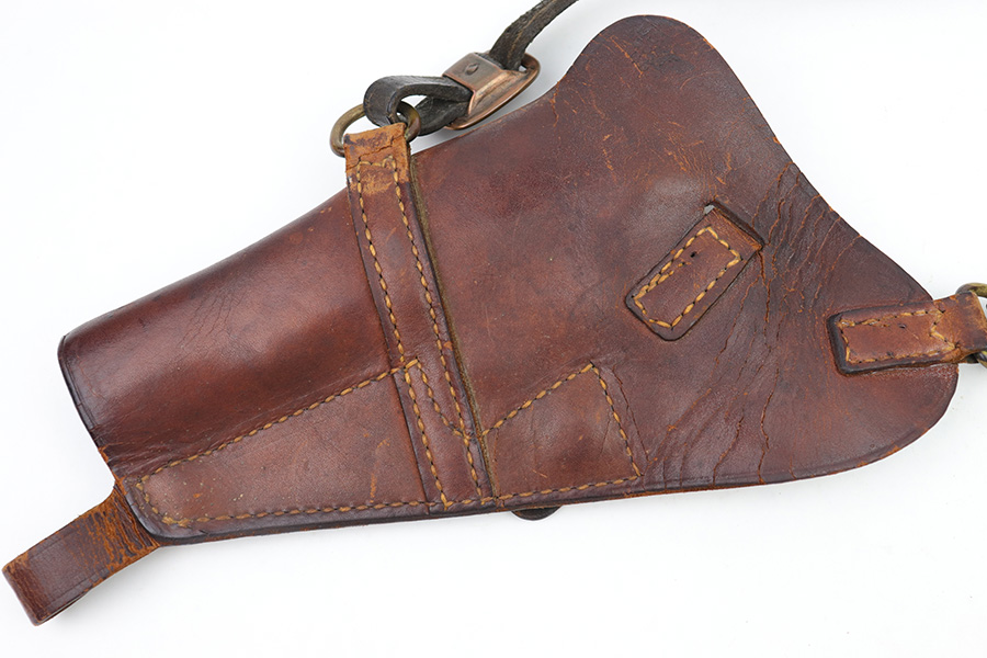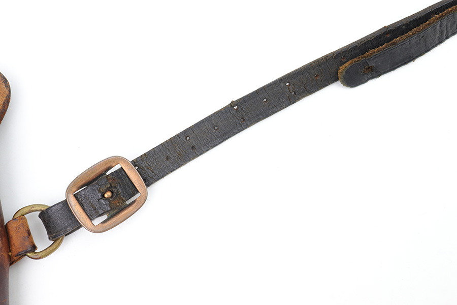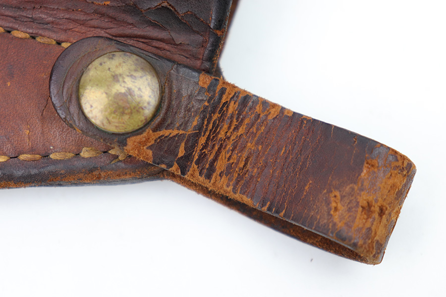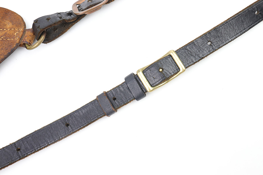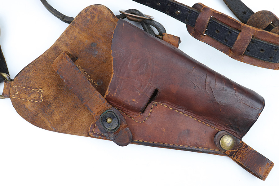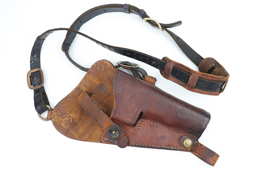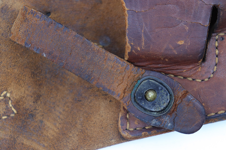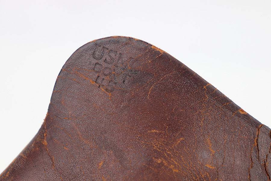 3/7/23 – This is an original late-WW2 production USMC issued shoulder holster by BOYT. The holster is maker stamped, dated ’45, and USMC stamped on the back leather as shown. The leather is in good condition with surface wrinkling and mild cracking, but none of the cracking is deep and the leather is completely intact. All original stitching intact as well. The shoulder strap is black leather and is good condition as well with no rips or tares.