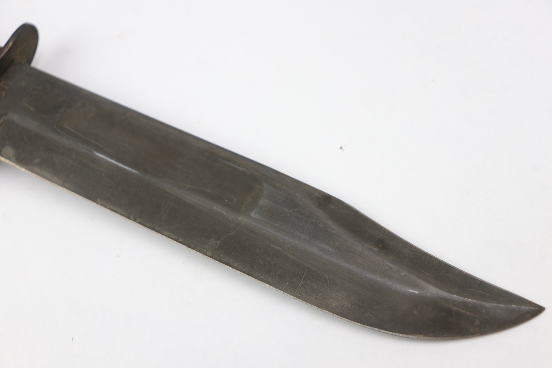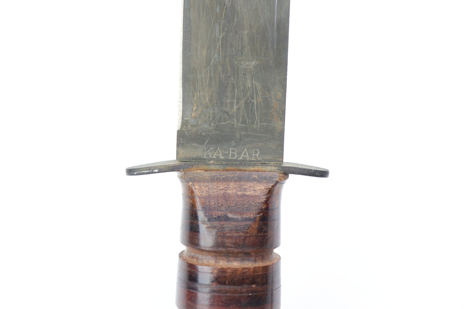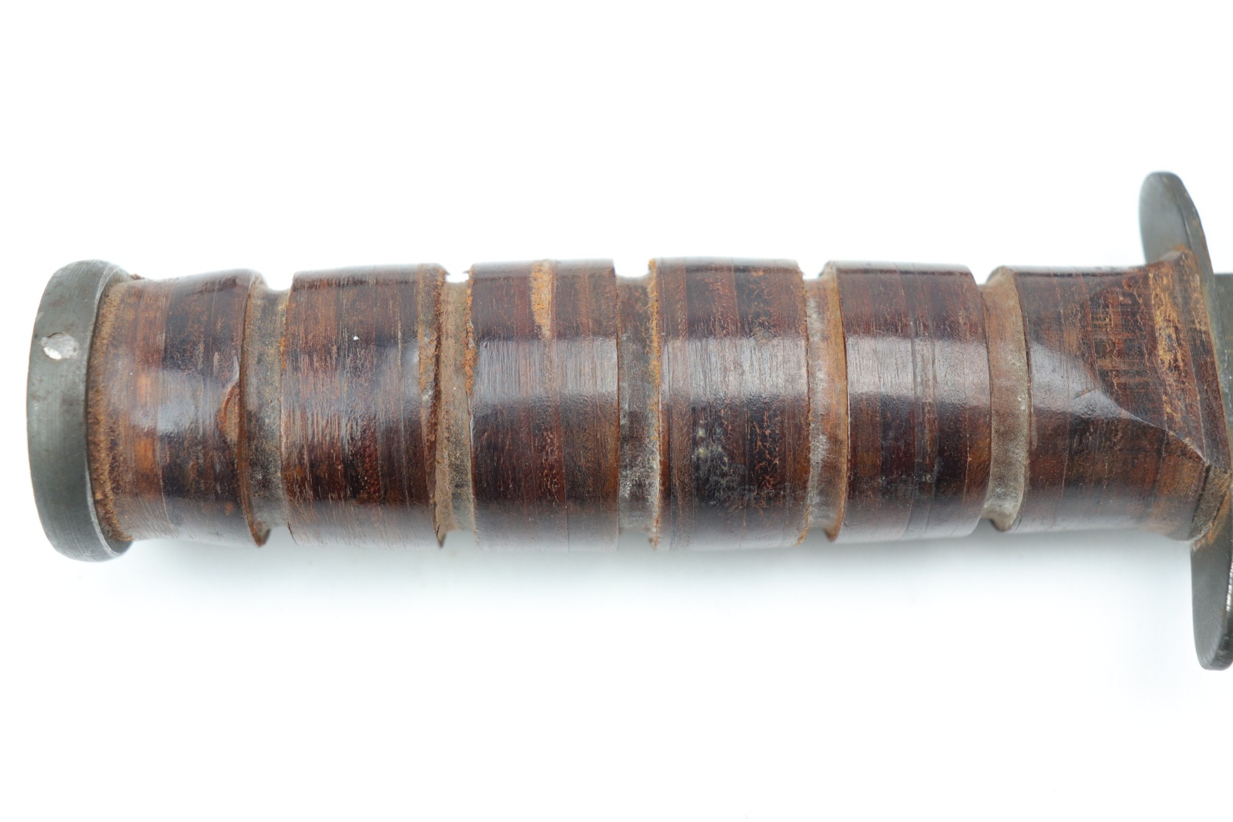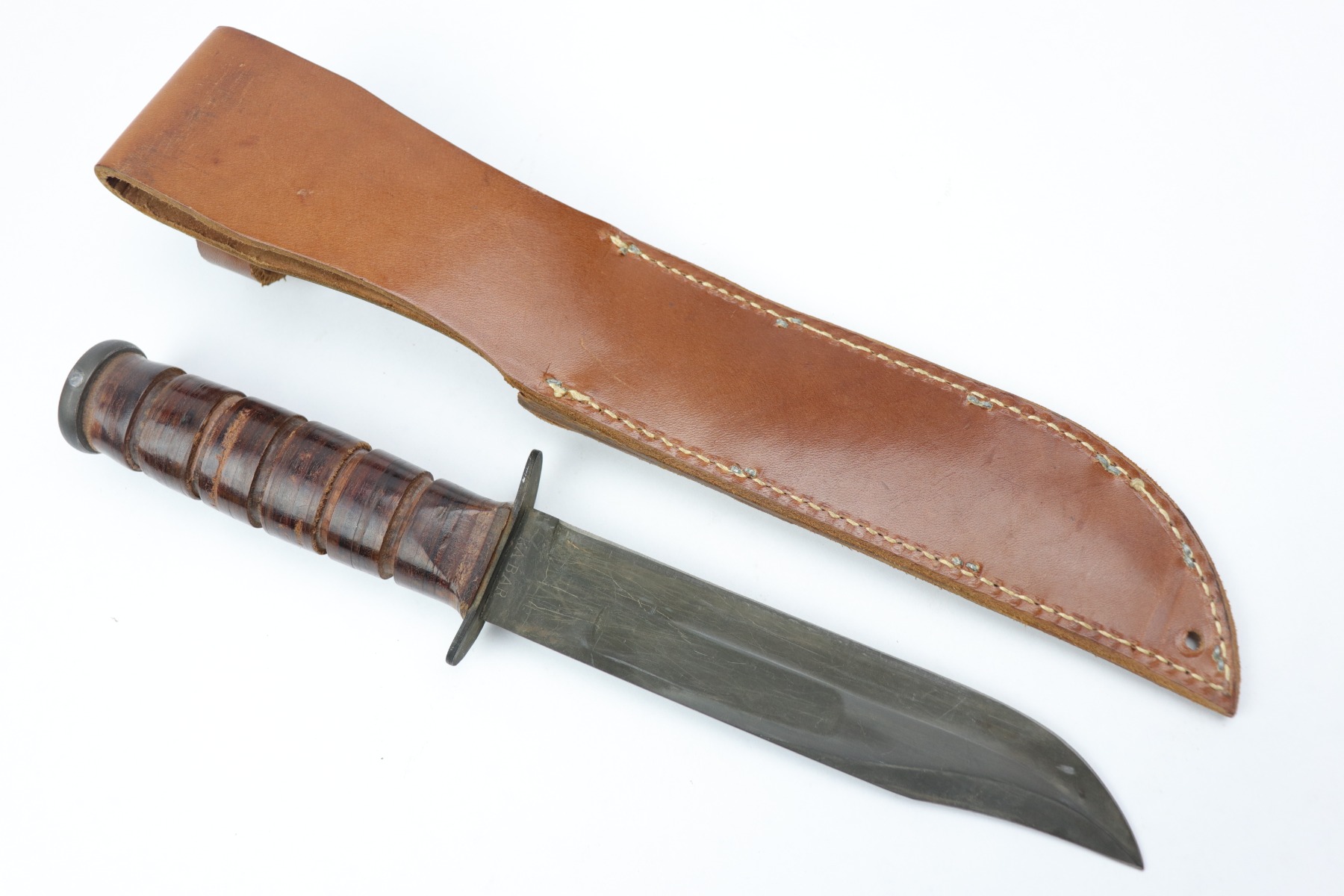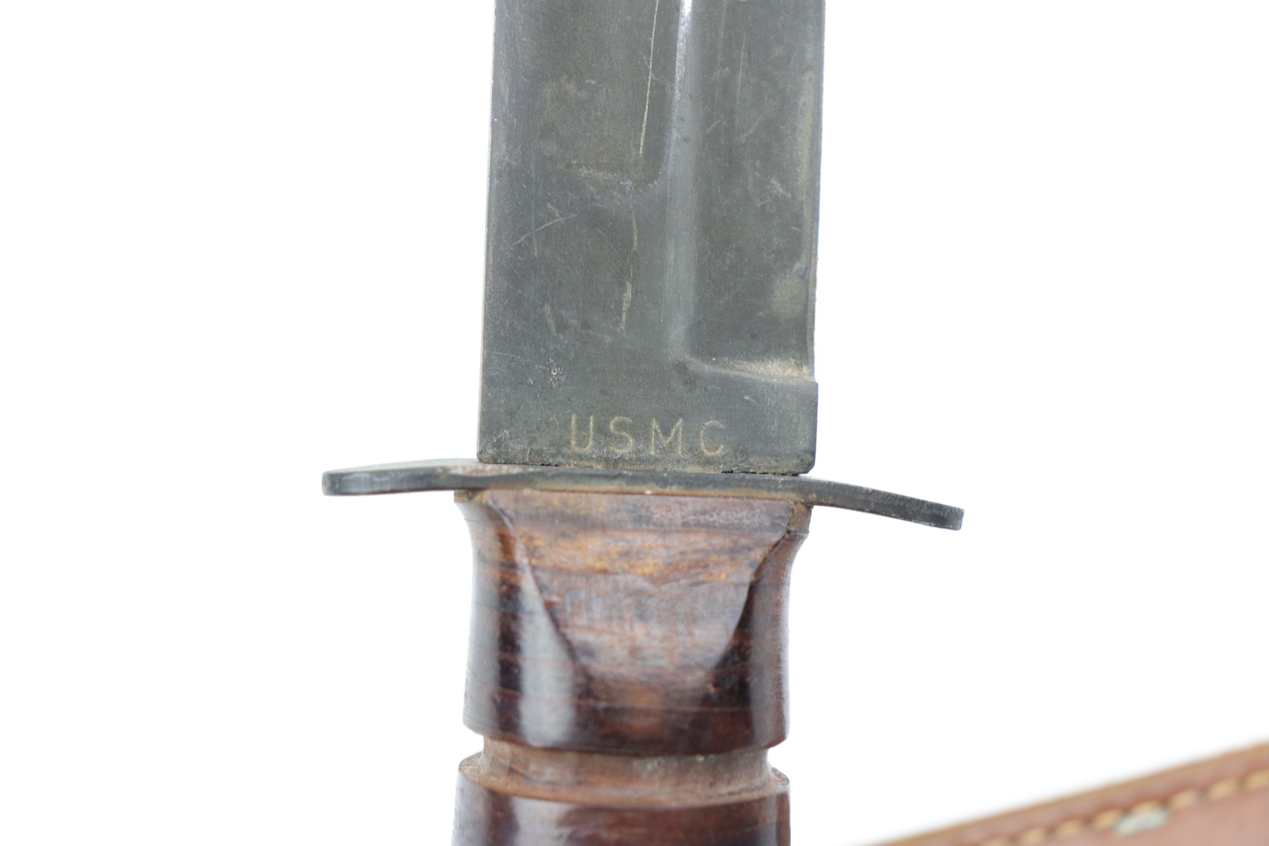 8/26/20 – This is an original World War Two United States Marine Corps KA-BAR fighting knife with sheath. The knife is stamped USMC and KABAR where the blade meets the hilt. The blade has heavy scratching and has been resharpened. The handle is wood and the sheath is made of leather with belt loop and clasping-button. This knife would have most likely been carried by a Marine during the Pacific campaign.