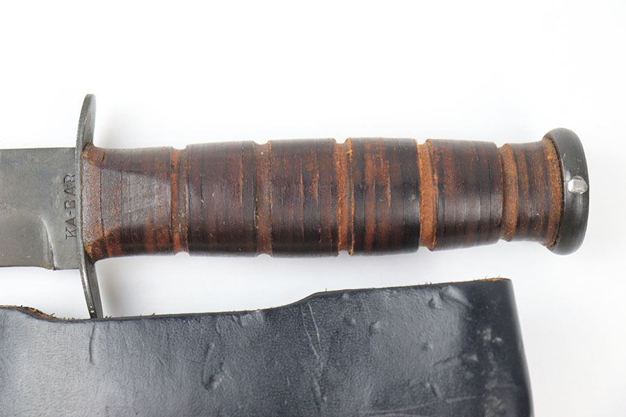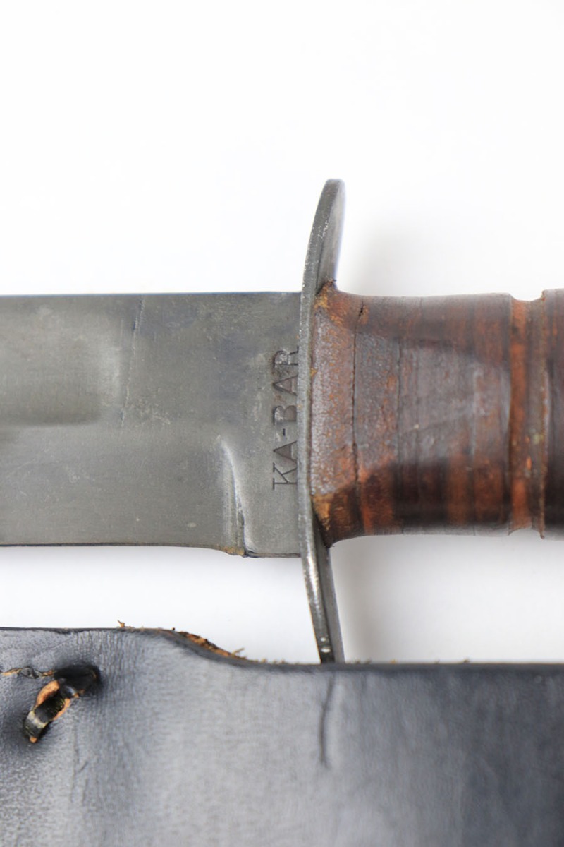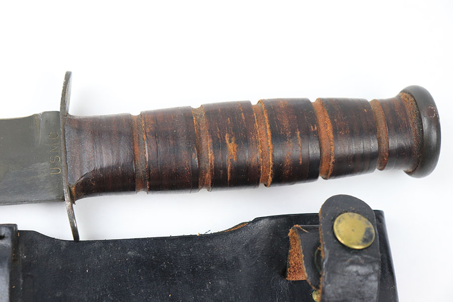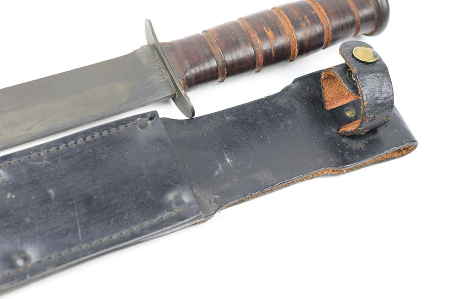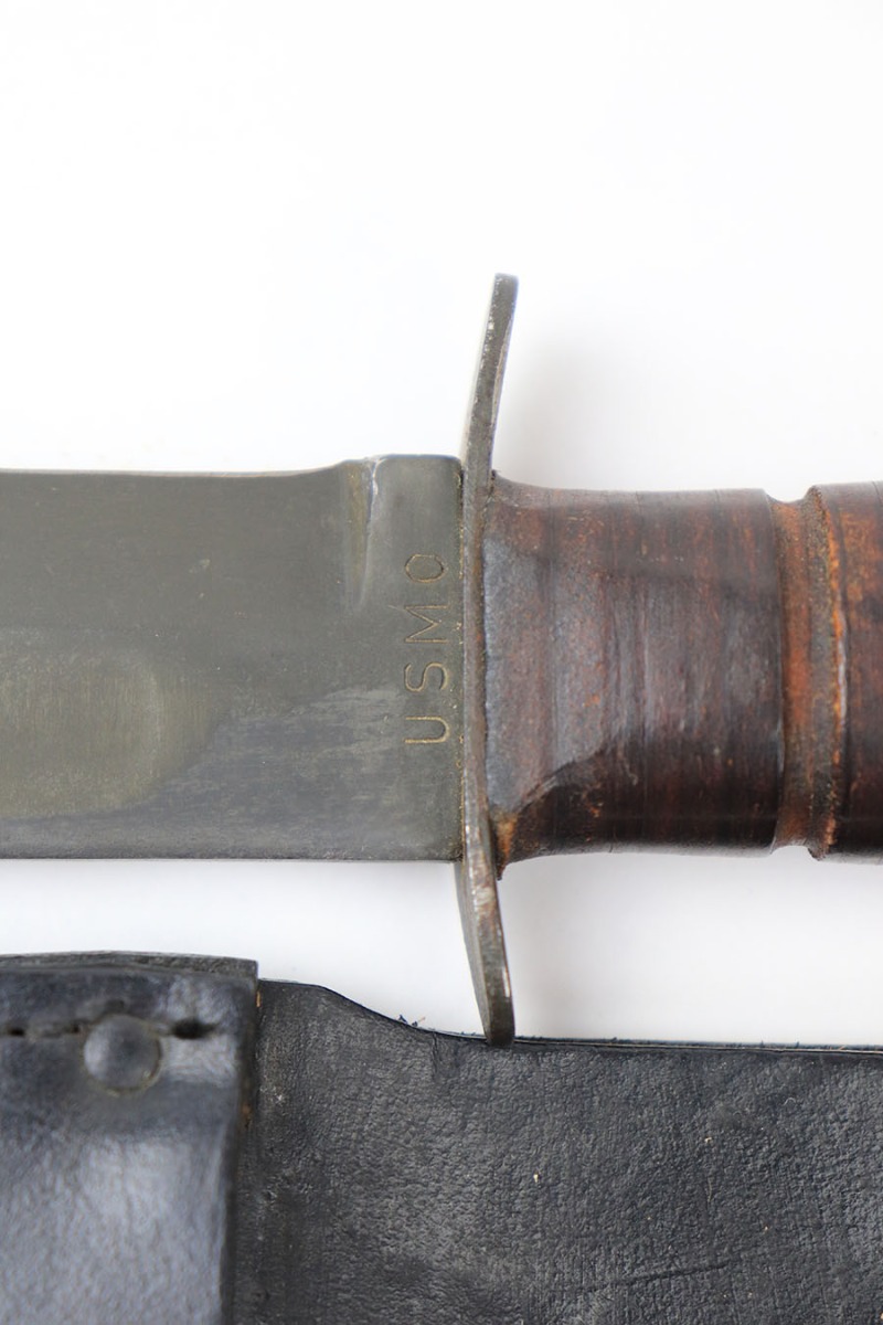 8/18/21 – This is an original USMC KA-BAR fighting knife from WW2. The blade is both maker stamped and USMC stamped. The leather handle is in great condition, as is the blade. No signs of sharpening. There’s some mild patina on the blade, but this is normal signs of aging. Comes with an unmarked black leather sheath.