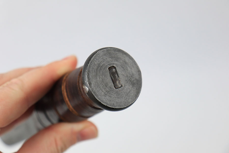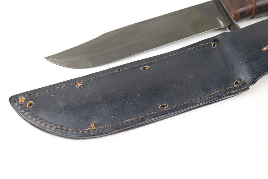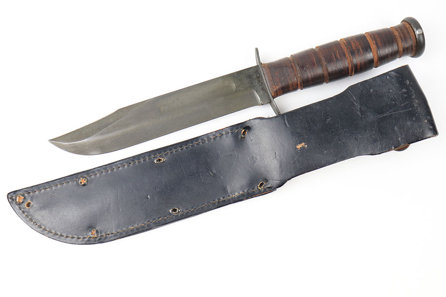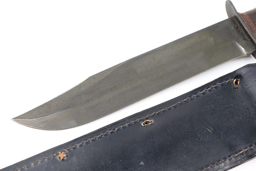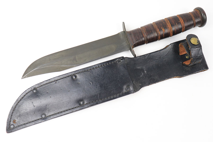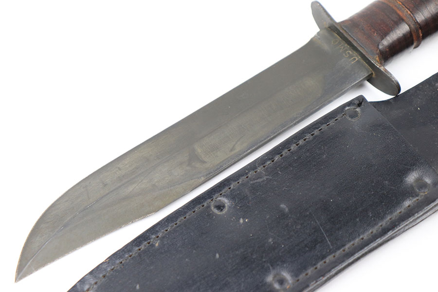 8/18/21 – This is an original USMC KA-BAR fighting knife from WW2. The blade is both maker stamped and USMC stamped. The leather handle is in great condition, as is the blade. No signs of sharpening. There’s some mild patina on the blade, but this is normal signs of aging. Comes with an unmarked black leather sheath.