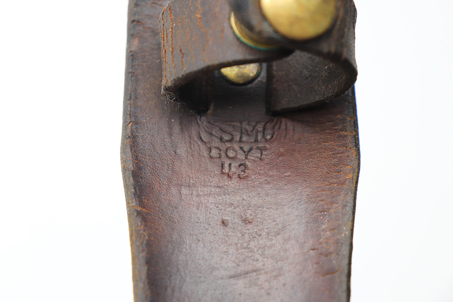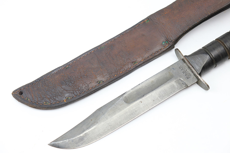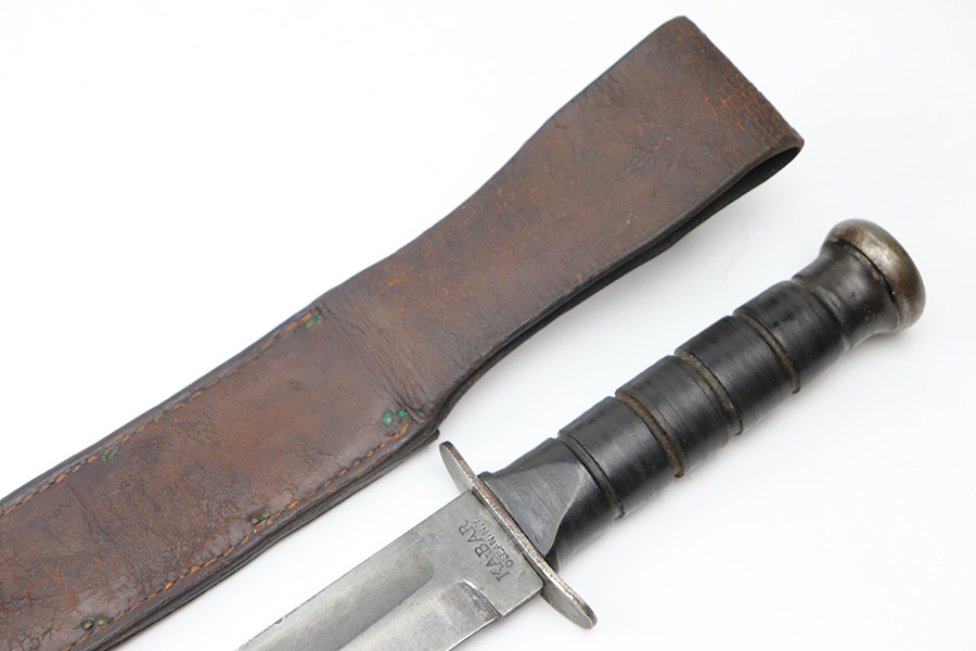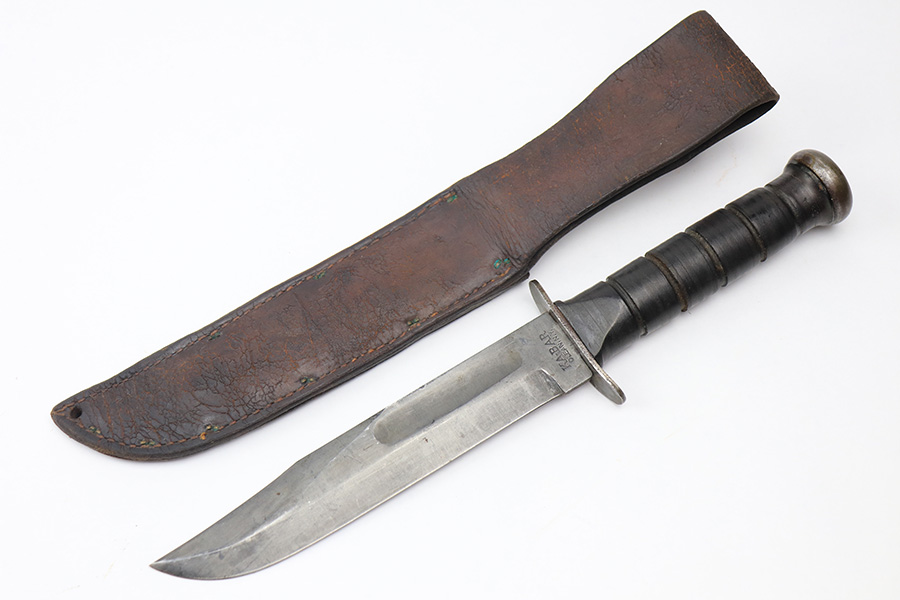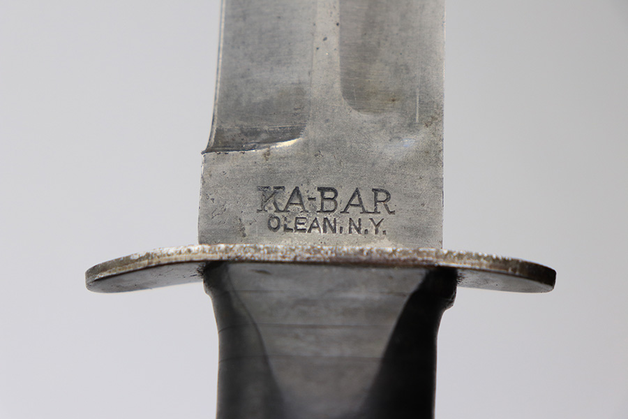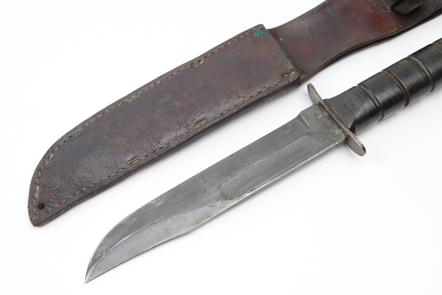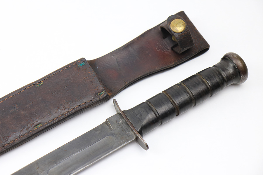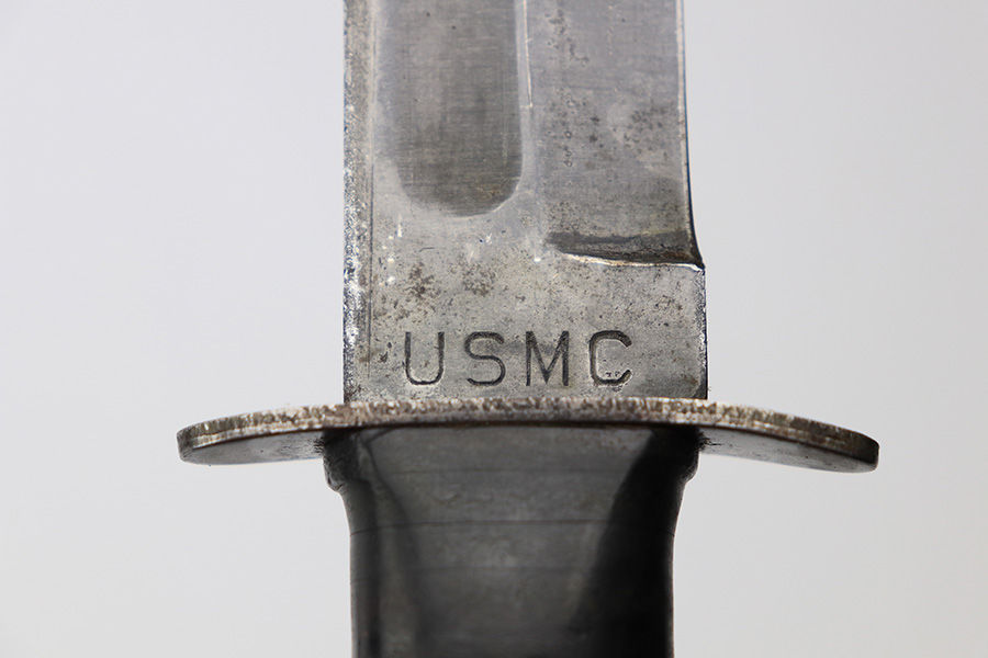 1/14/22 – This is a WW2 original USMC issued KA-BAR fighting knife. The knife comes with a leather sheath that’s in good condition. The knife is stamped “USMC” on one side and maker stamped on the other. The blade has some light surface scratches from use as well as some normal dark patina discoloration in various areas. The blued finish is thinning throughout. The leather handle is in great shape with no notable issues.