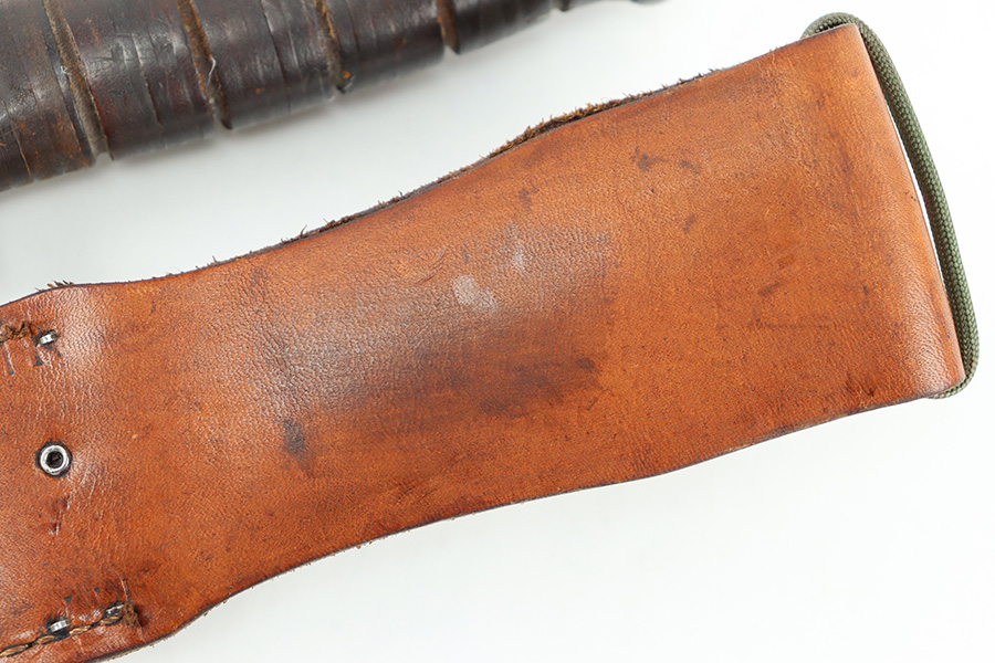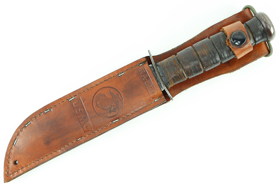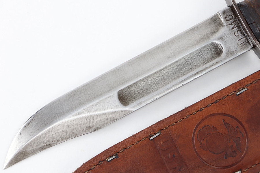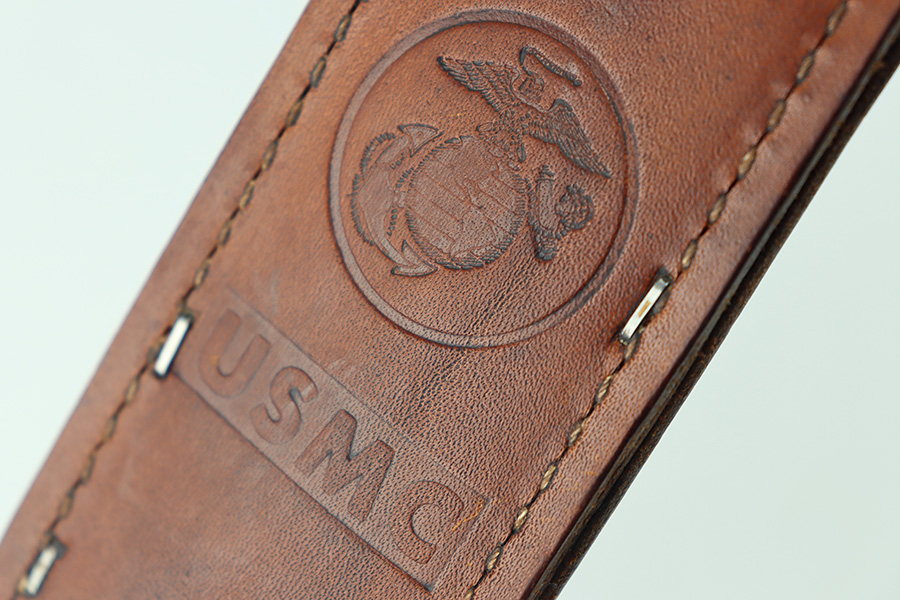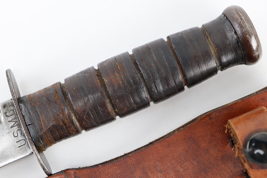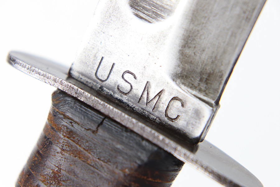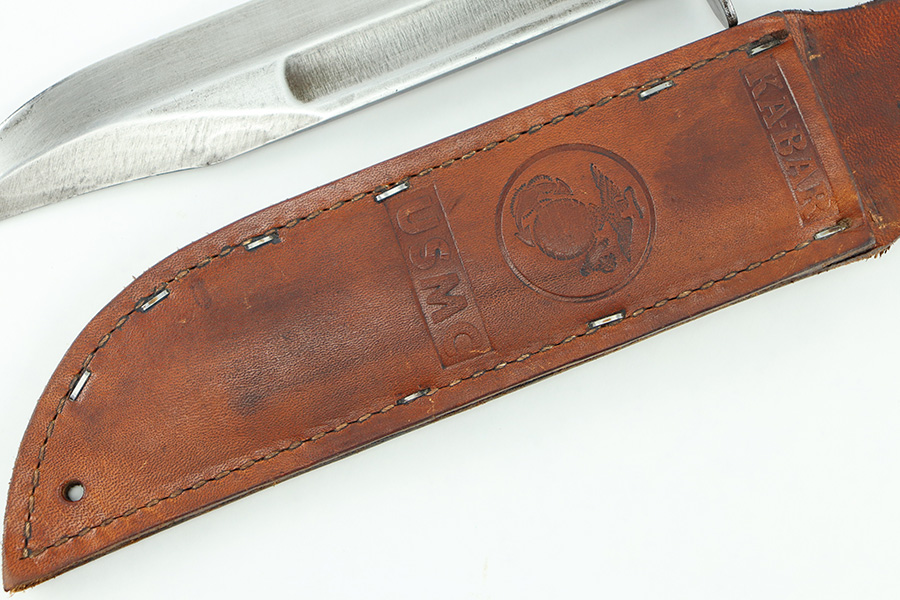 8/31/23 – This is a desirable USMC issued KA-BAR fighting and utility knife. The blade is missing most of the finish, and has mild surface patina throughout. The edge has one small nick from use, and shows signs of sharpening / honest use wear. “USMC” marked on one side of the ricassio, and KA-BAR maker marked on the other. The leather handle is in great shape with mild signs of handling and some very mild wiggle on a small area of the lower portion of the grip. Comes with a postwar USMC leather scabbard. A nice example with honest use wear.