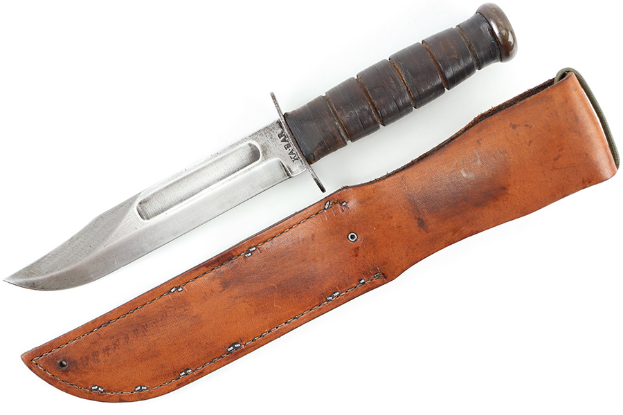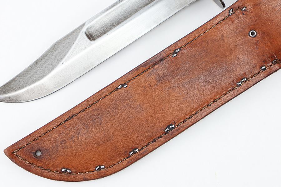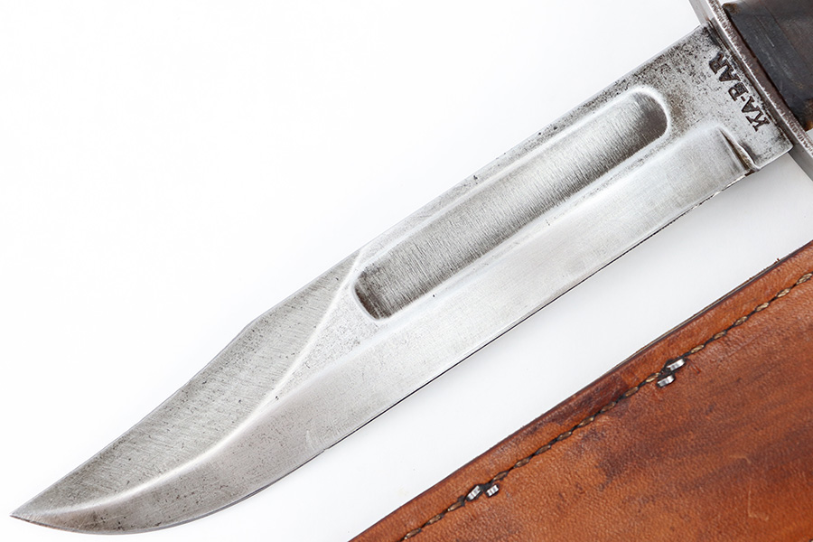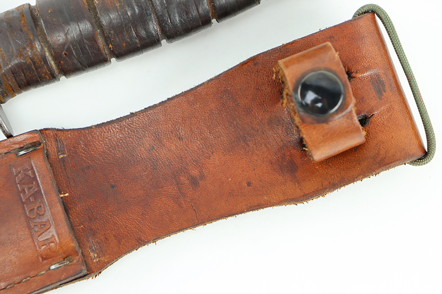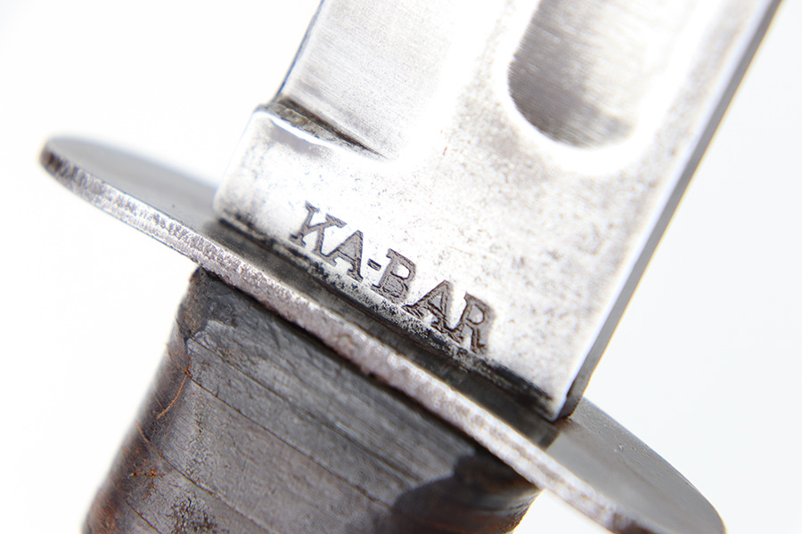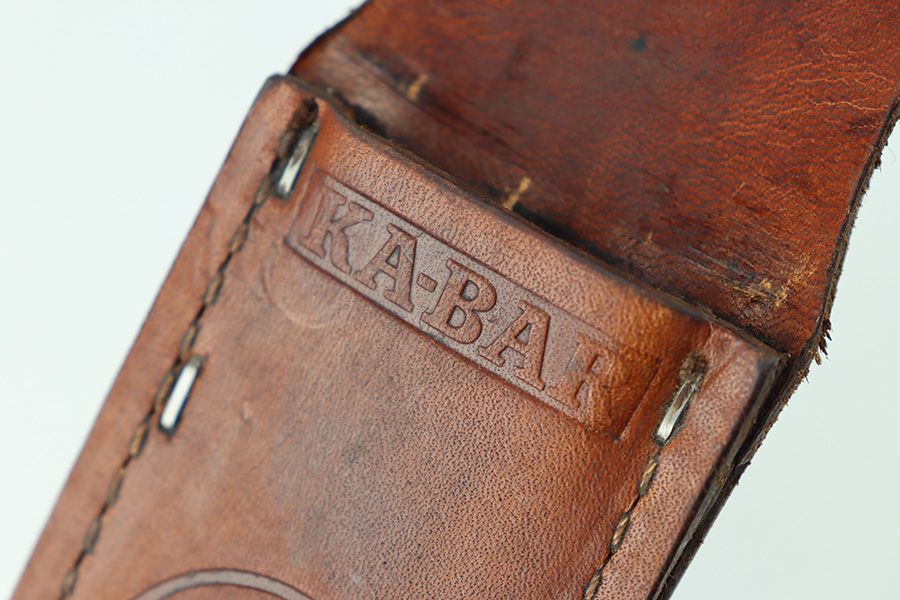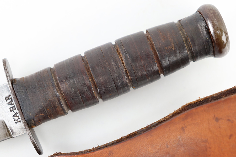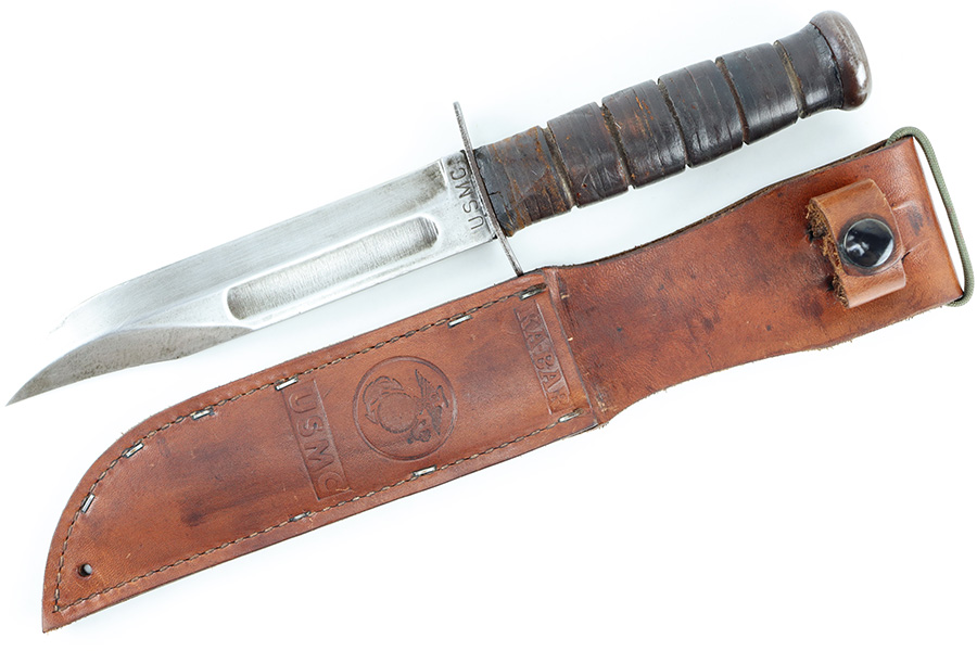 8/31/23 – This is a desirable USMC issued KA-BAR fighting and utility knife. The blade is missing most of the finish, and has mild surface patina throughout. The edge has one small nick from use, and shows signs of sharpening / honest use wear. “USMC” marked on one side of the ricassio, and KA-BAR maker marked on the other. The leather handle is in great shape with mild signs of handling and some very mild wiggle on a small area of the lower portion of the grip. Comes with a postwar USMC leather scabbard. A nice example with honest use wear.