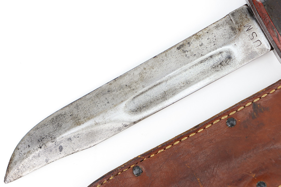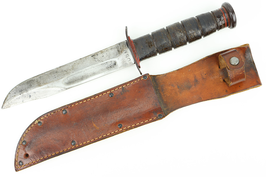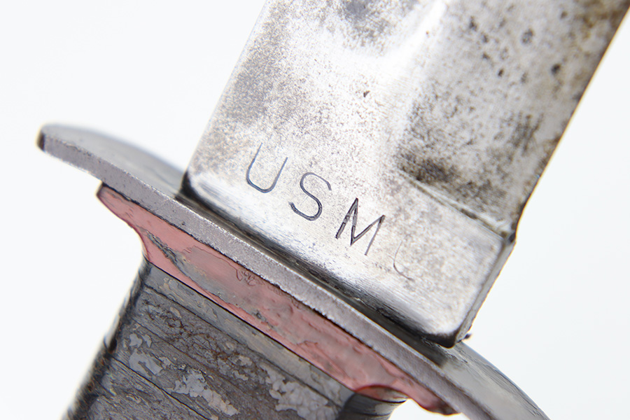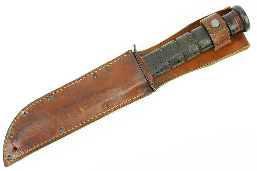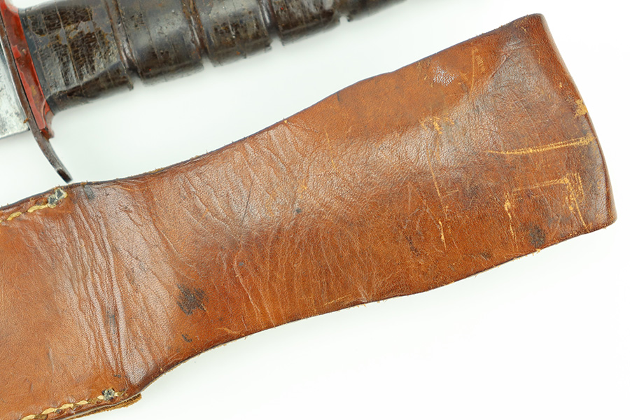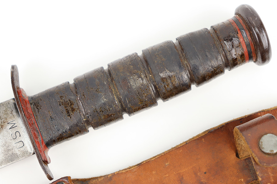 12/27/23 – This is an original WW2 production KA-BAR fighting / utility knife issued to the US Marine Corps. The knife features red and black spacers, which indicates earlier WW2 production. The blade shows signs of use and age with almost all of the finish missing, and light patina throughout. There’s some light pitting near the tip of the blade as well. The handle is in great condition with normal handling wear. Comes with an original period-correct leather scabbard.
