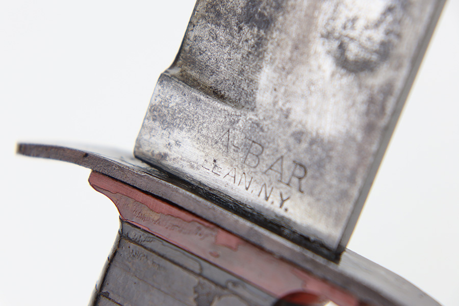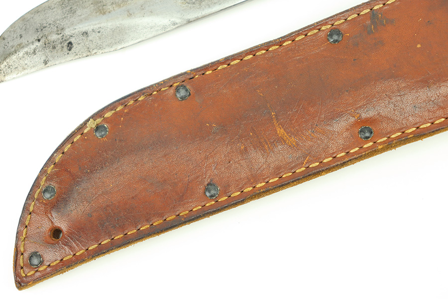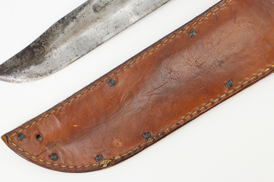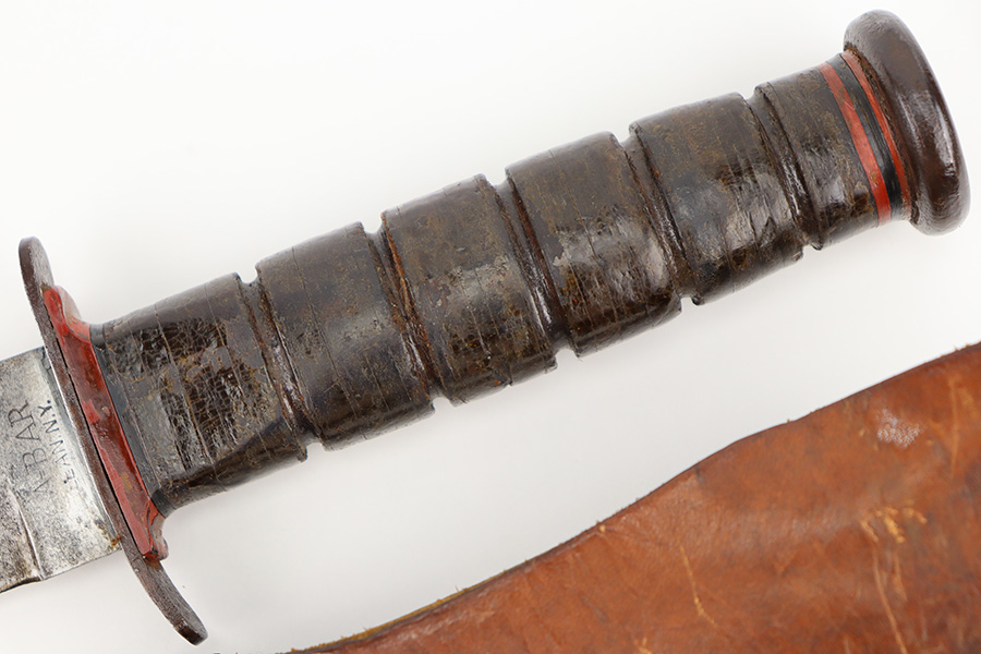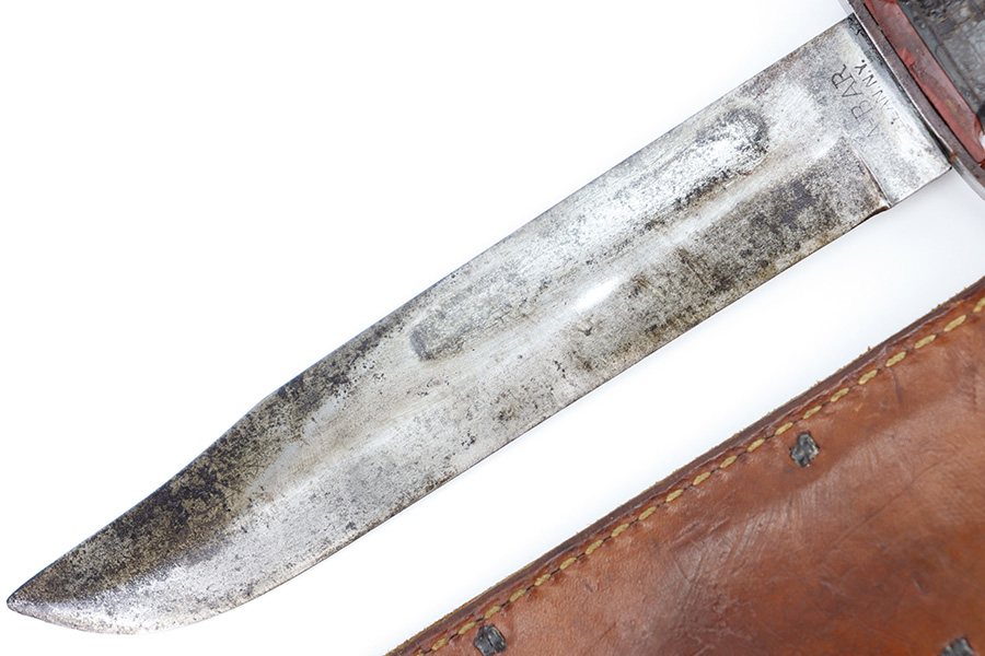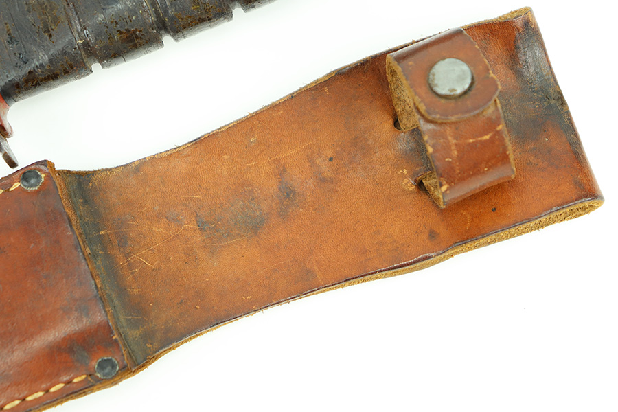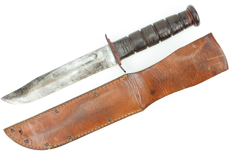 12/27/23 – This is an original WW2 production KA-BAR fighting / utility knife issued to the US Marine Corps. The knife features red and black spacers, which indicates earlier WW2 production. The blade shows signs of use and age with almost all of the finish missing, and light patina throughout. There’s some light pitting near the tip of the blade as well. The handle is in great condition with normal handling wear. Comes with an original period-correct leather scabbard.