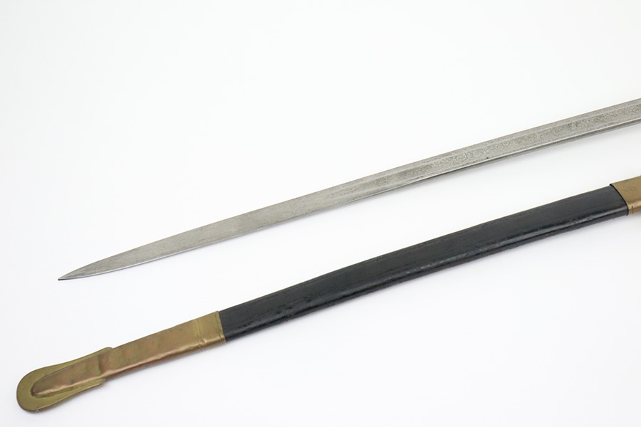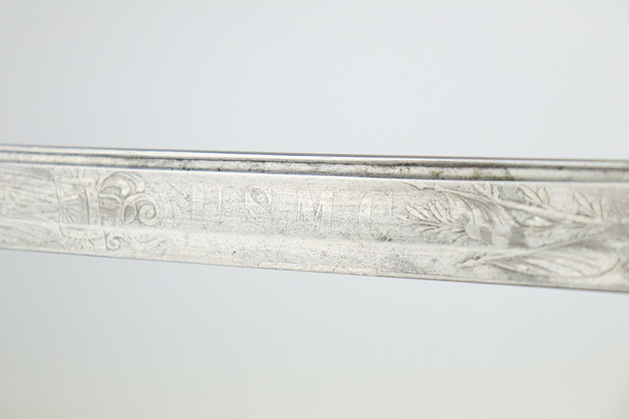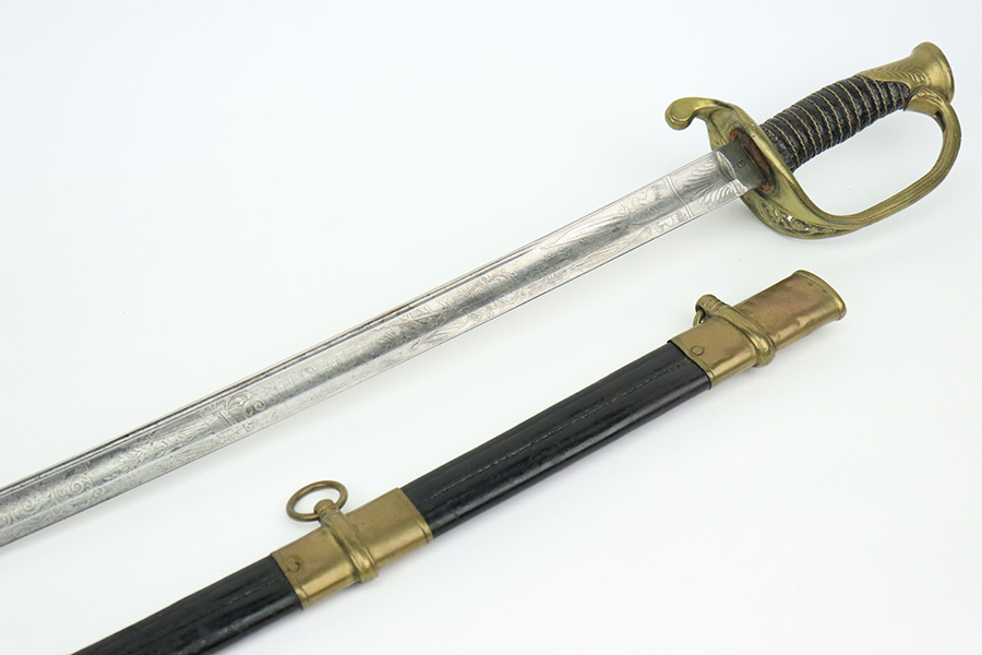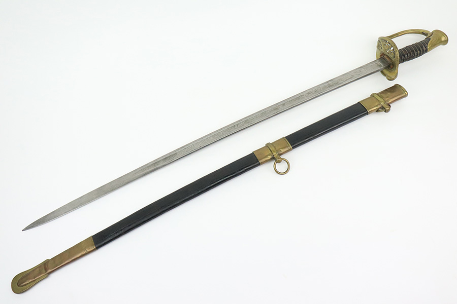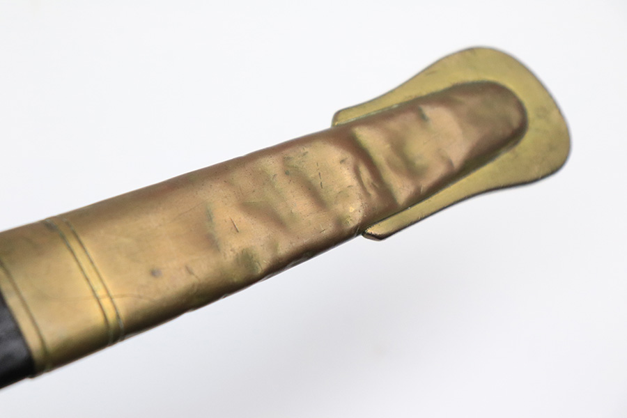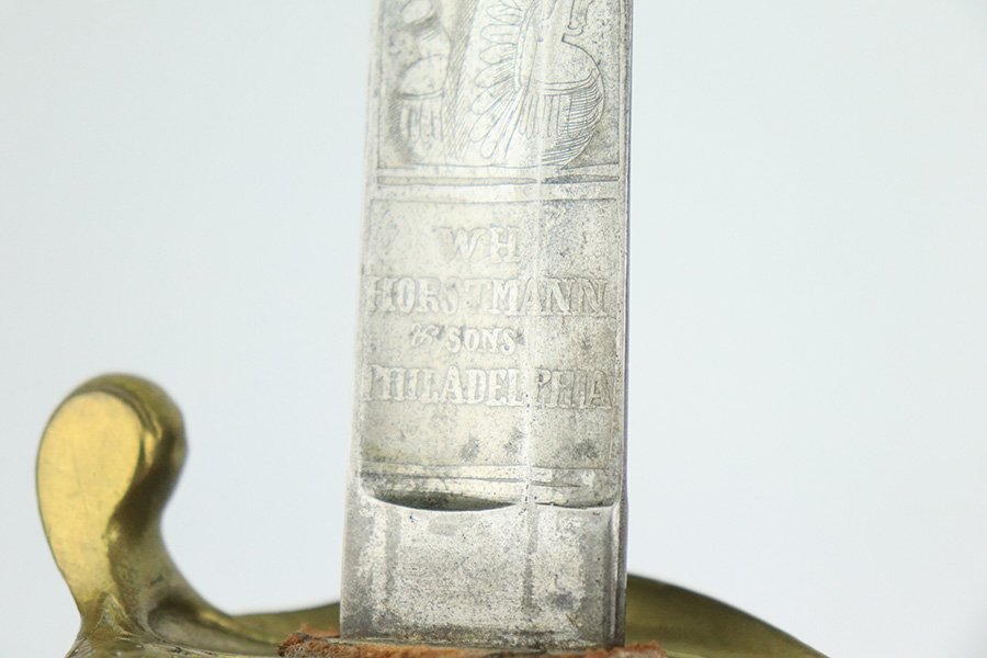 7/28/22 – This is a post Civil War production US Marine Corp. M1850 NCO Sword. Made in the 1870s, this blade was modified post Civil War with the etchings we see today. One side of the blade is USMC marked with flags, shields, and a floral pattern. The ricasso on this side of the blade has a small logo proof / manufacture stamp. The other side of the blade has an American Eagle and floral pattern with a maker “WH Horstmann & Sons, Philadelphia” etched near the base of the blade. The etchings are still crisp and have texture, but they show evidence of scabbard wear, aging, and surface patina throughout. There’s no excessive wear or discoloration however, and the edge is unsharpened. The leather stopper is still in place but somewhat tattered. The leather handle has surface wear throughout but is completely intact. The hand guard has typical patina. Comes with an original scabbard that has multiple small dents on the metal mouth and tip, as shown. The stretched leather body of the scabbard is in great condition however with some mild surface wear.