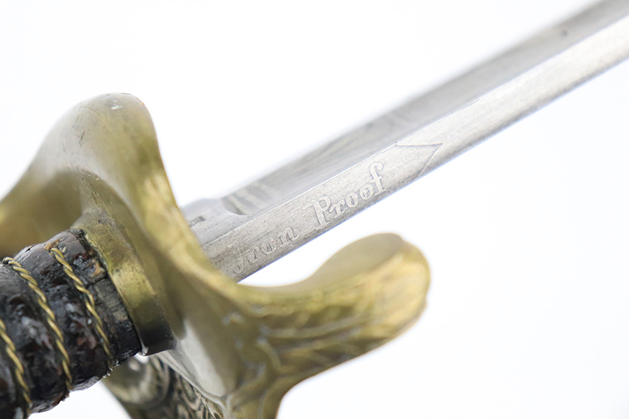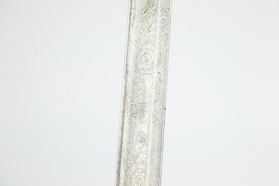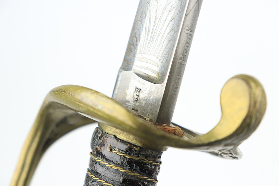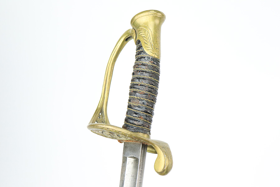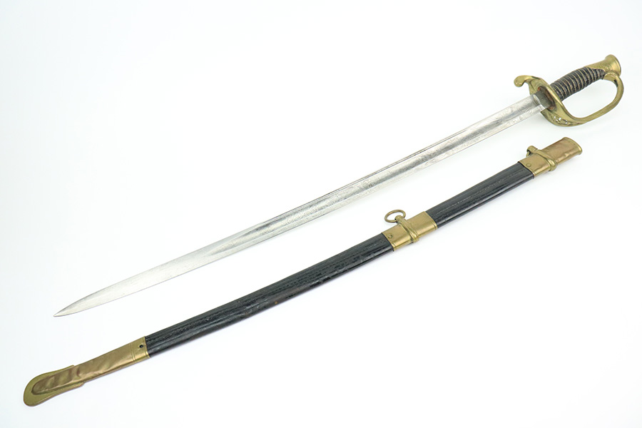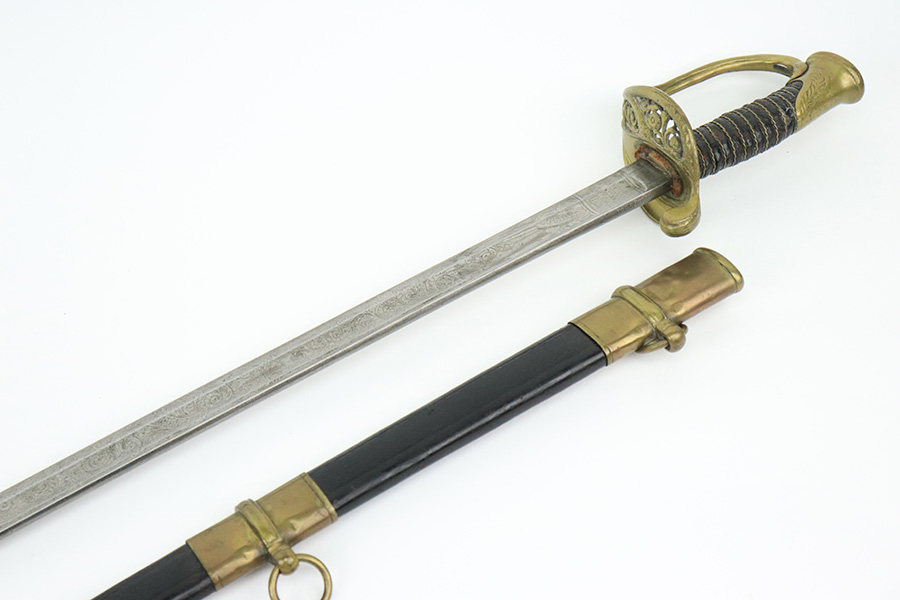 7/28/22 – This is a post Civil War production US Marine Corp. M1850 NCO Sword. Made in the 1870s, this blade was modified post Civil War with the etchings we see today. One side of the blade is USMC marked with flags, shields, and a floral pattern. The ricasso on this side of the blade has a small logo proof / manufacture stamp. The other side of the blade has an American Eagle and floral pattern with a maker “WH Horstmann & Sons, Philadelphia” etched near the base of the blade. The etchings are still crisp and have texture, but they show evidence of scabbard wear, aging, and surface patina throughout. There’s no excessive wear or discoloration however, and the edge is unsharpened. The leather stopper is still in place but somewhat tattered. The leather handle has surface wear throughout but is completely intact. The hand guard has typical patina. Comes with an original scabbard that has multiple small dents on the metal mouth and tip, as shown. The stretched leather body of the scabbard is in great condition however with some mild surface wear.