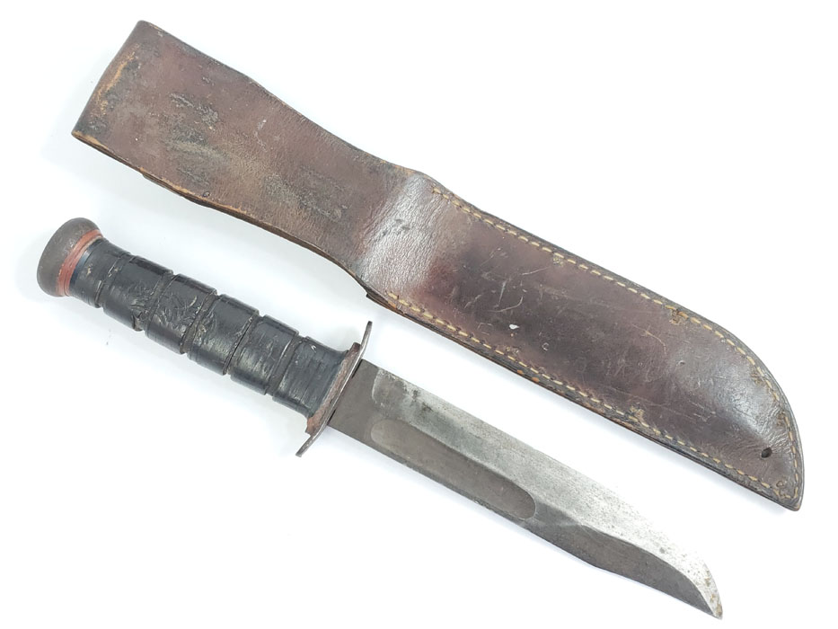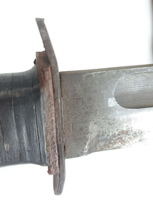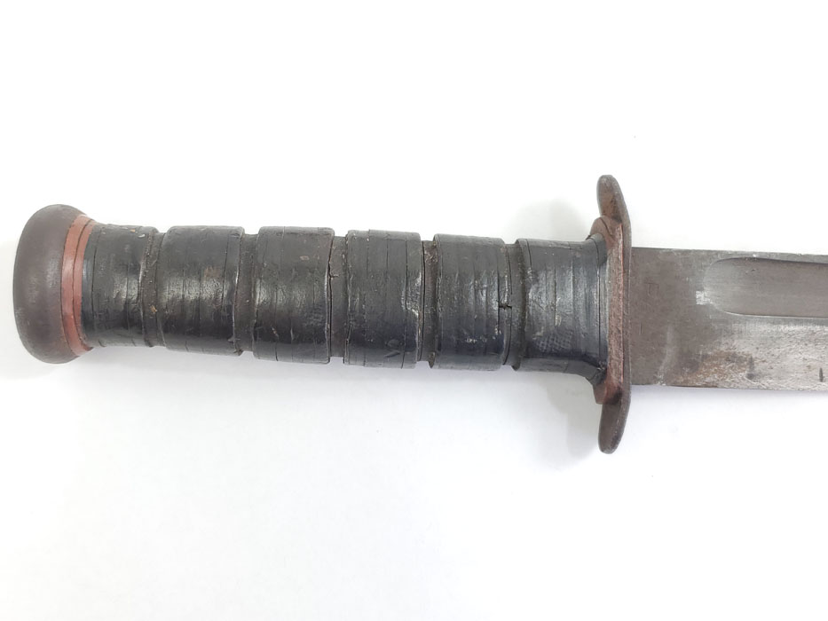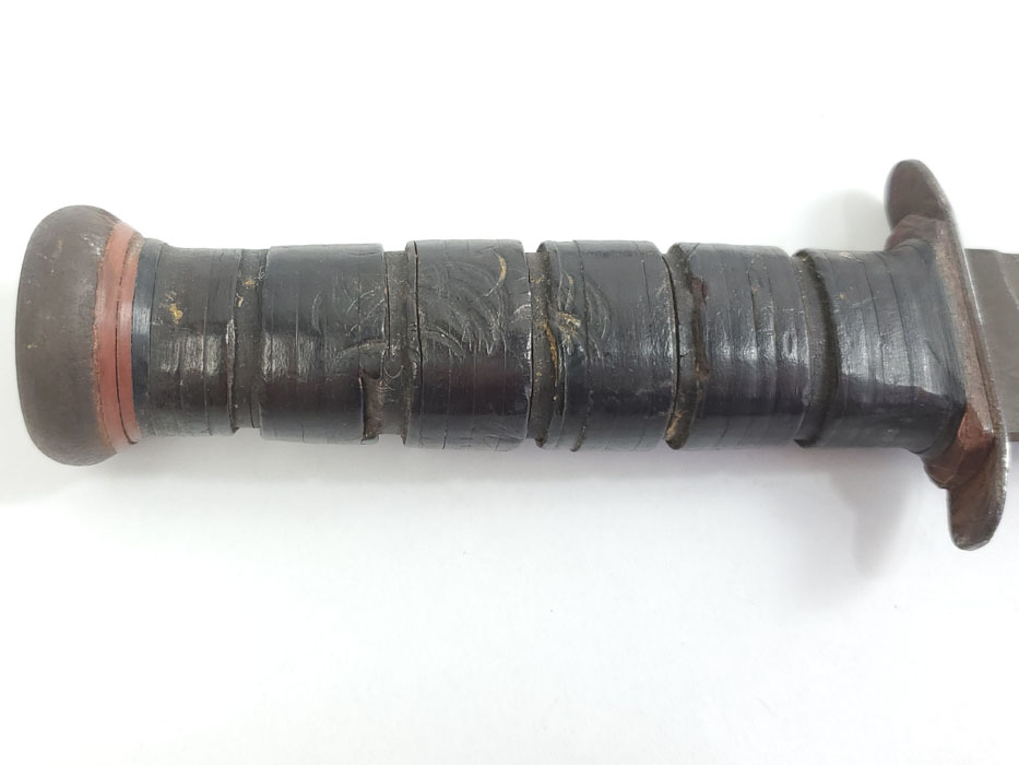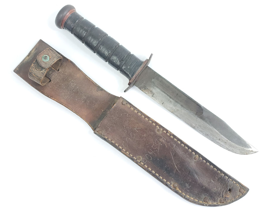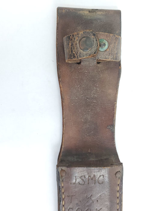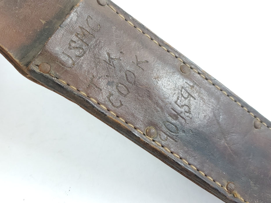 5/22/20 – This is an original USMC KA-BAR made by PAL for use during WW2. The blade comes with the original leather scabbard, which is inscribed on the front with the original owner’s name and service number. This KA-BAR has the earlier production red spacers on the handle. The blade is in fair condition with some surface wear throughout, but the markings are still visible near the hilt. The leather sheath is completely in tact with all original rivets and stitching.