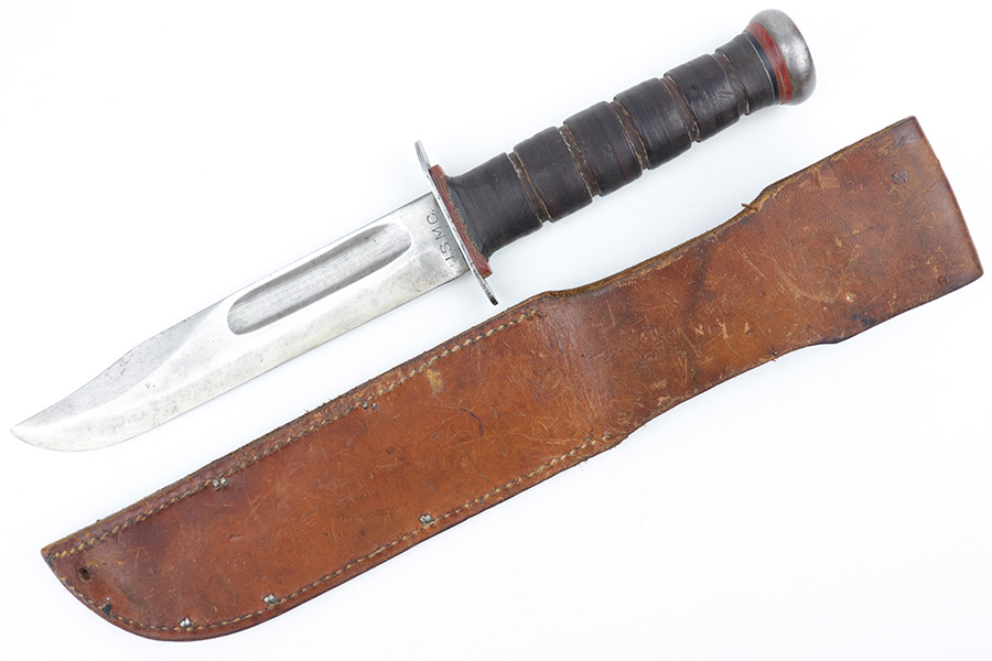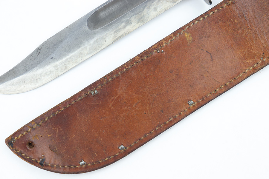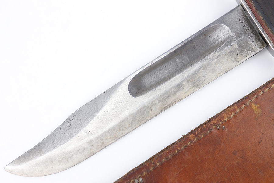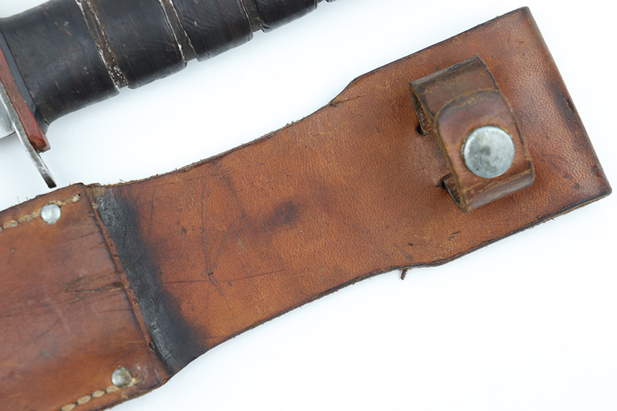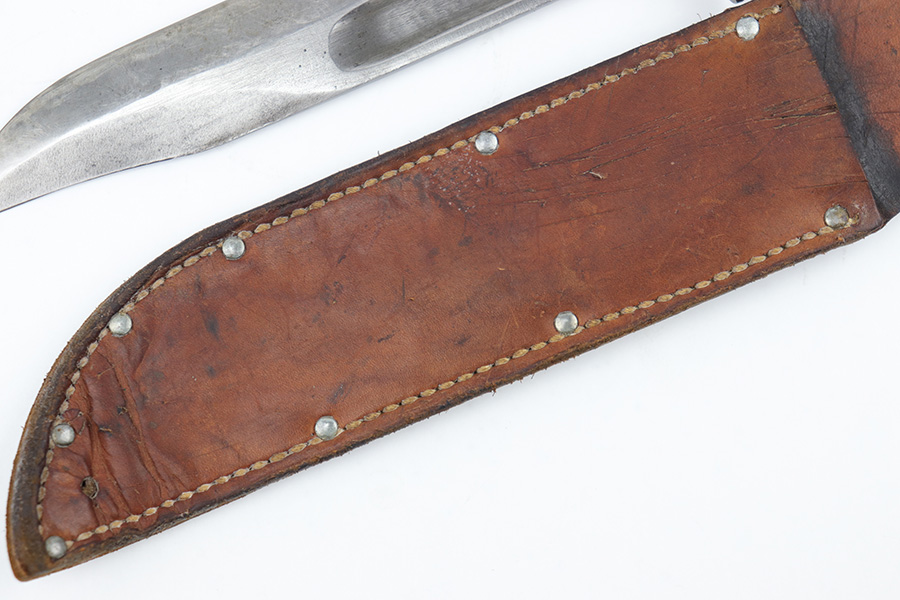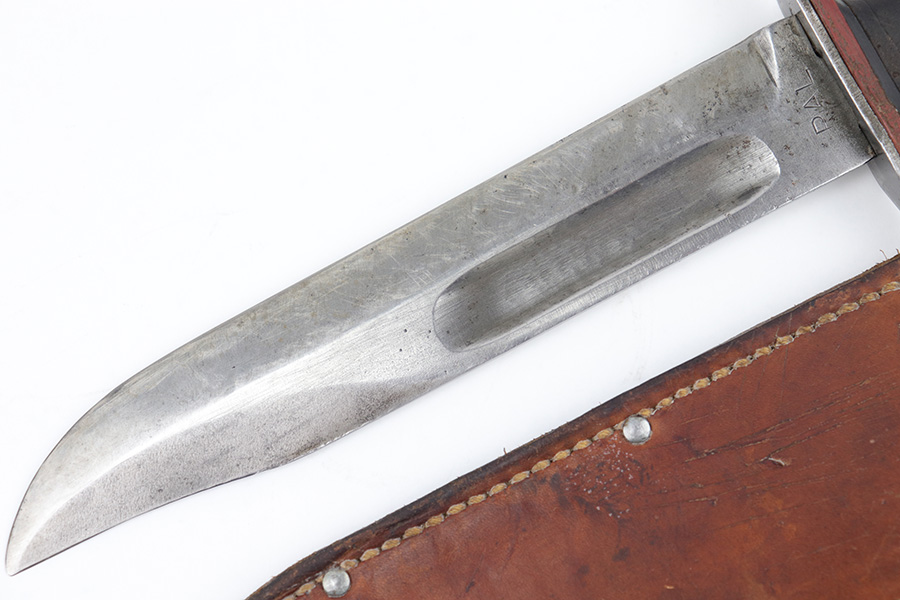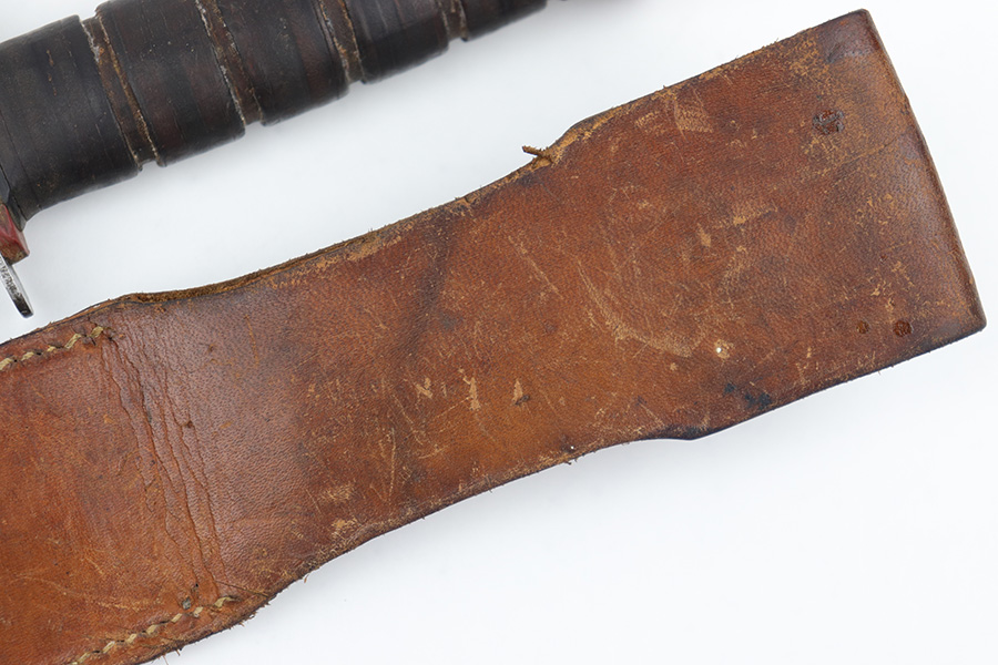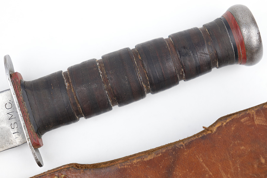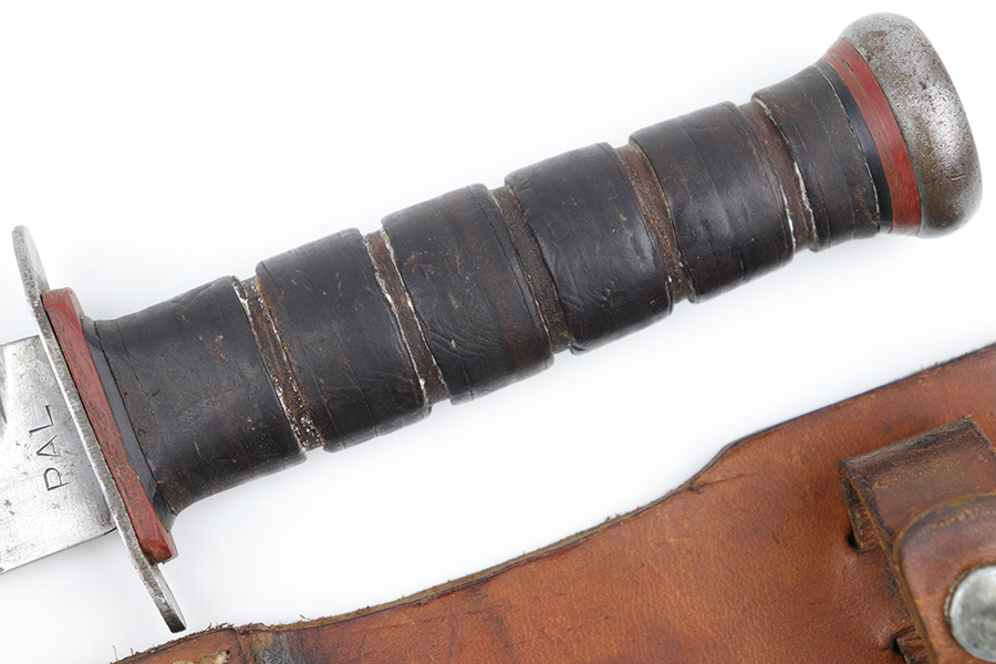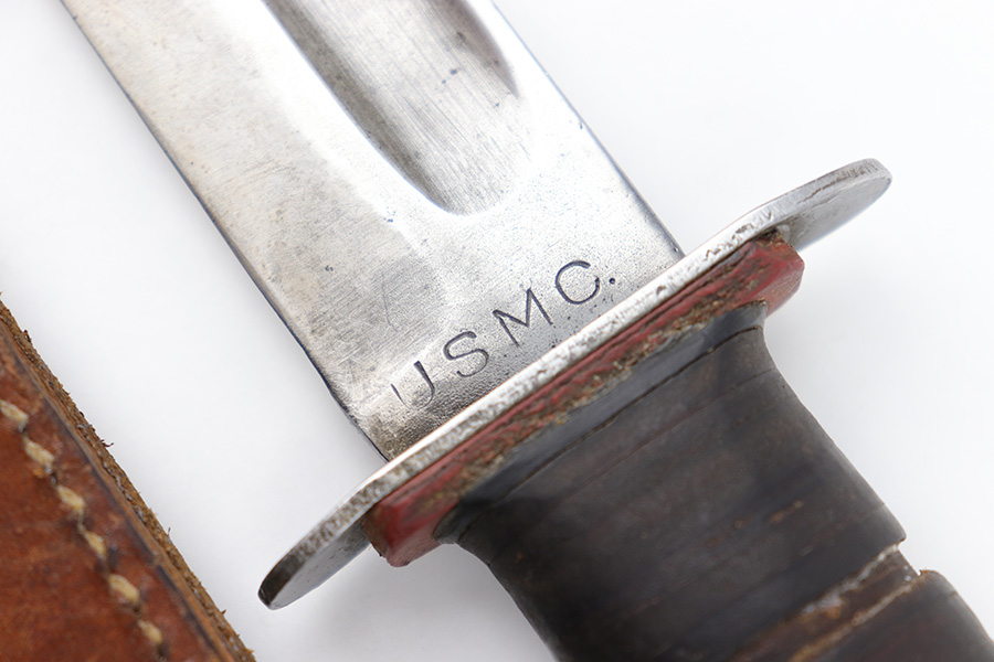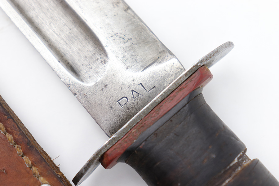 3/29/23 – This is an original US Marine Corps. issued PAL Mk 2 fighting / utility knife from WW2. The knife features early WW2 production red and black spacers on the handle. The leather grip shows mild aging and use wear but is still tight and the metal fittings are tight as well. The blade has no finish remaining but is in good condition with signs of sharpening along the edge. There’s honest aging without excessive damage throughout the blade, which is nice for an early battle-used example like this. Comes with an original unmarked leather scabbard.