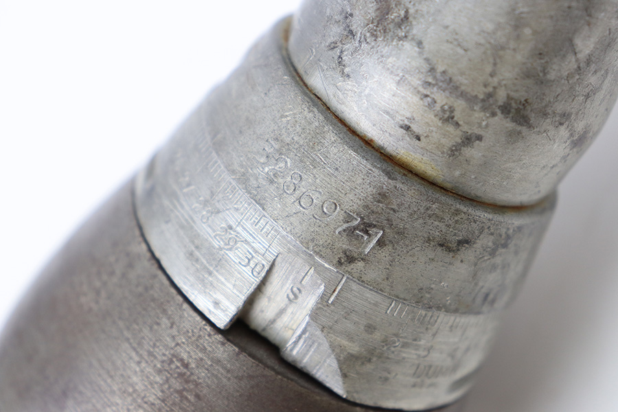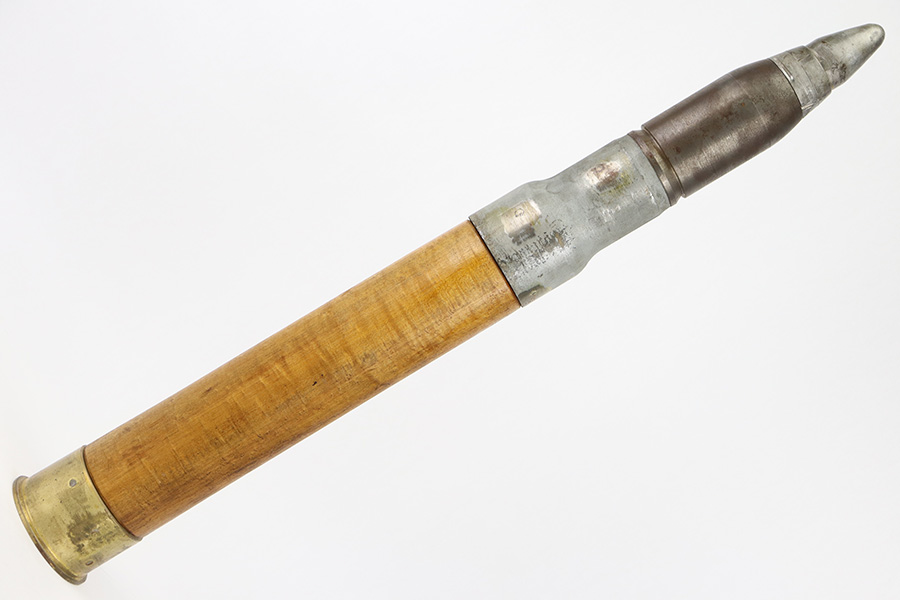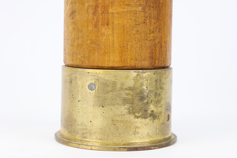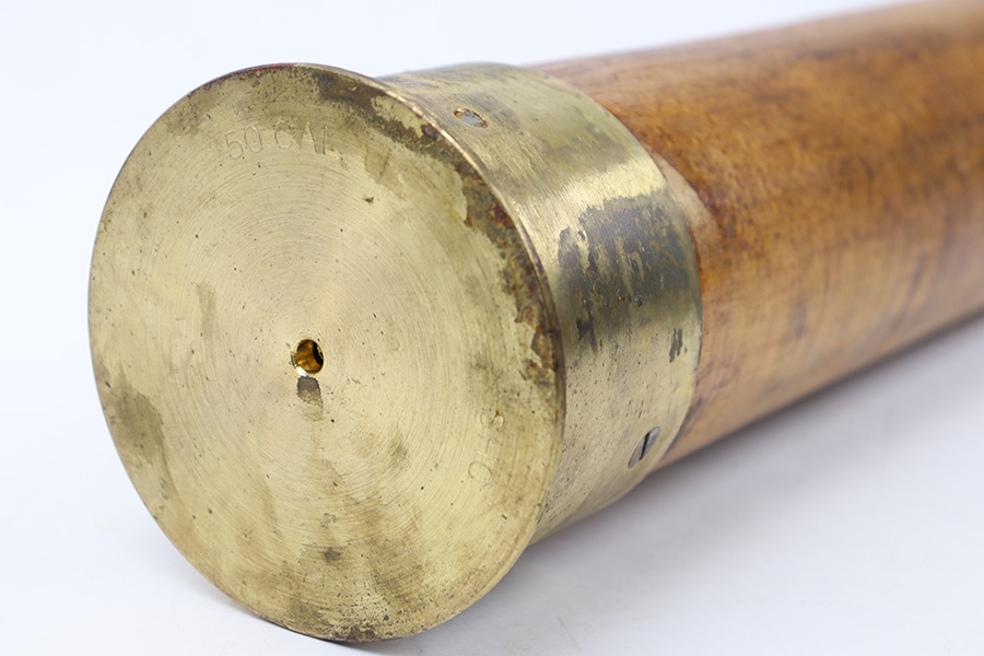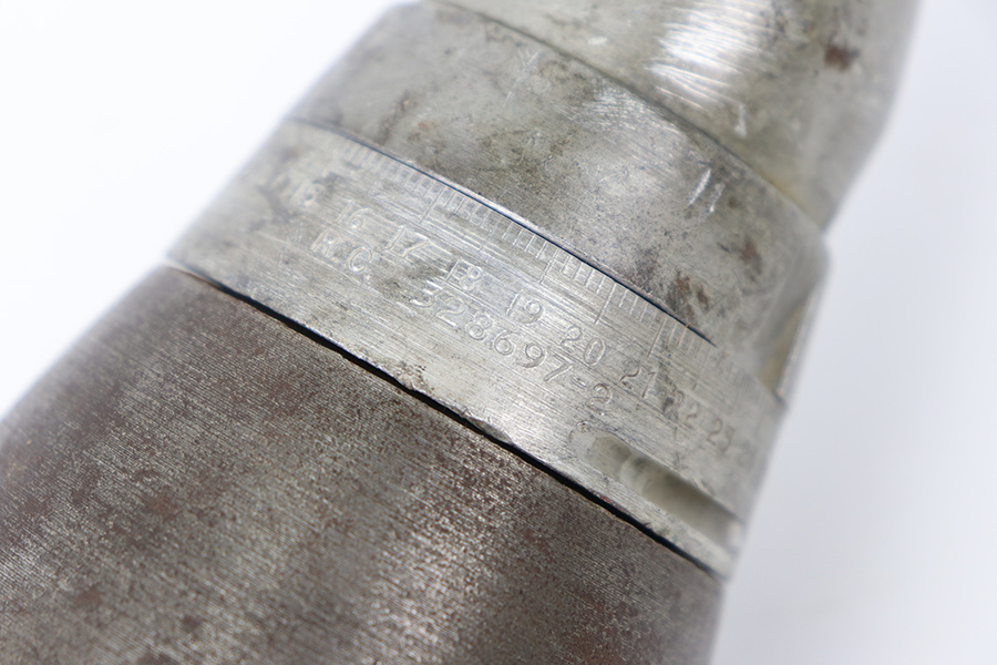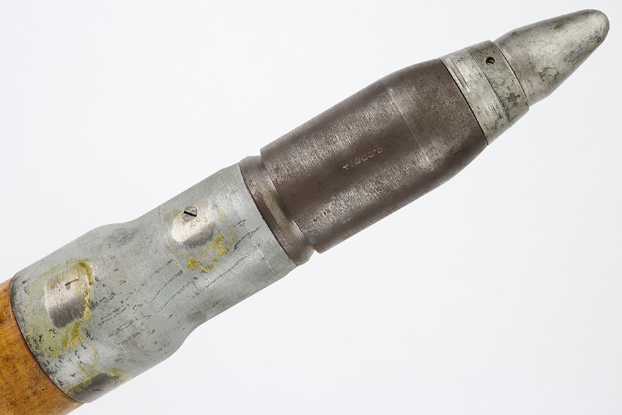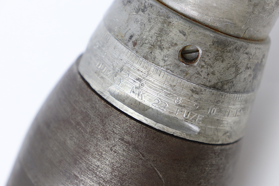 11/6/23 – This is a WW2 era inert dummy round from the US Navy, complete with a practice fuse timer top. These were used for training purposes as crews needed to get used to handling and loading these heavy rounds (and setting the fuse timer) within tight quarters aboard ships. This example is in great overall condition with a wood “casing” and brass base. The base is maker stamped and model / caliber designation stamped. Measures 33.5 inches long.