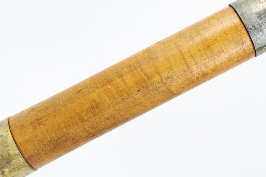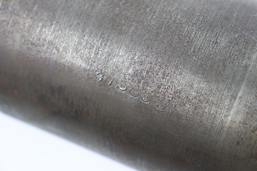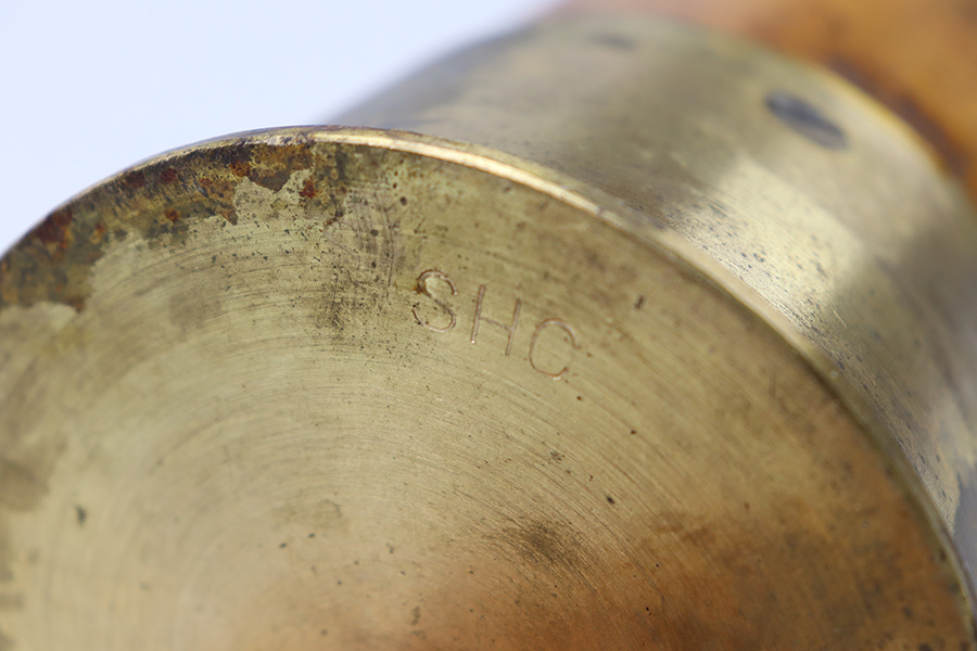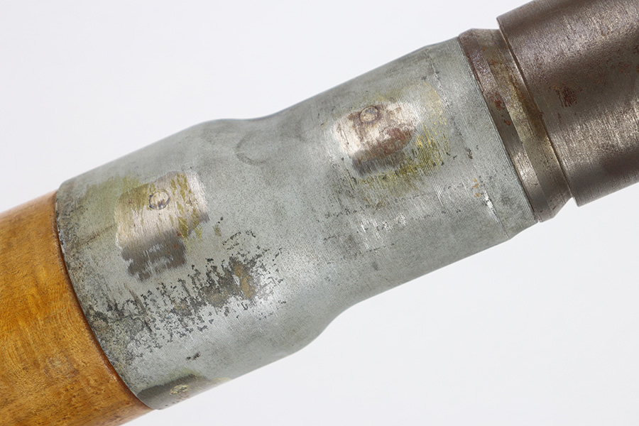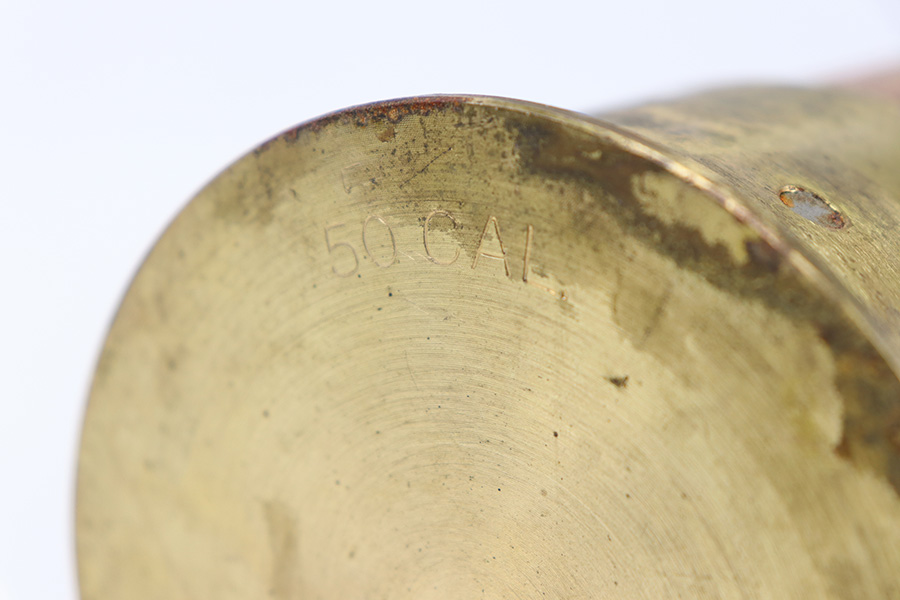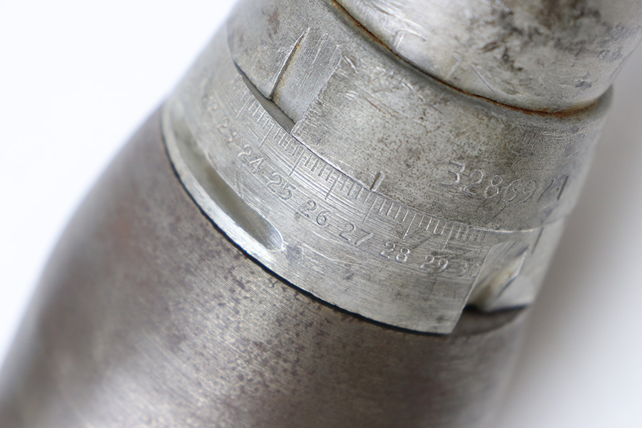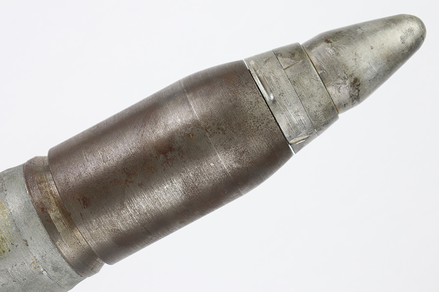 11/6/23 – This is a WW2 era inert dummy round from the US Navy, complete with a practice fuse timer top. These were used for training purposes as crews needed to get used to handling and loading these heavy rounds (and setting the fuse timer) within tight quarters aboard ships. This example is in great overall condition with a wood “casing” and brass base. The base is maker stamped and model / caliber designation stamped. Measures 33.5 inches long.