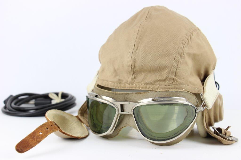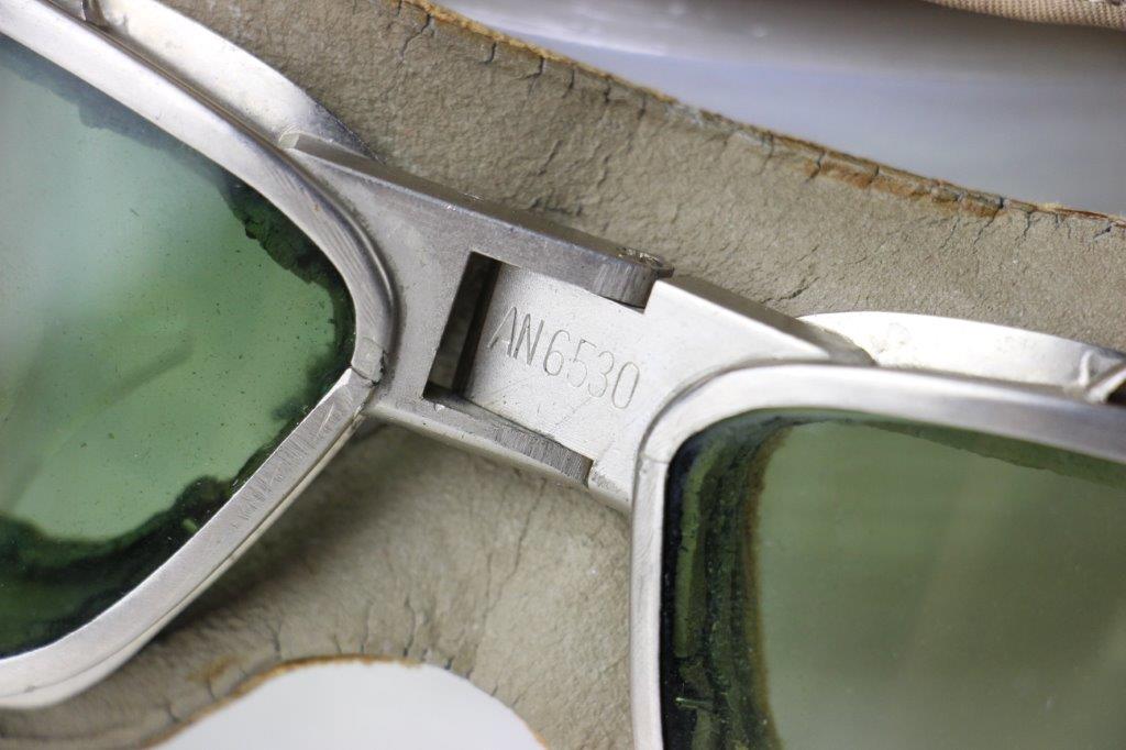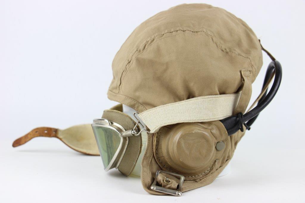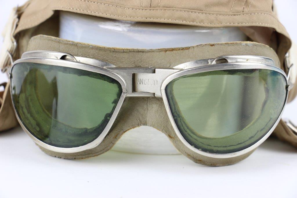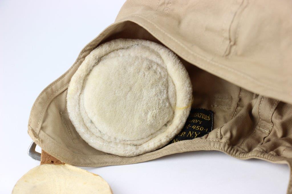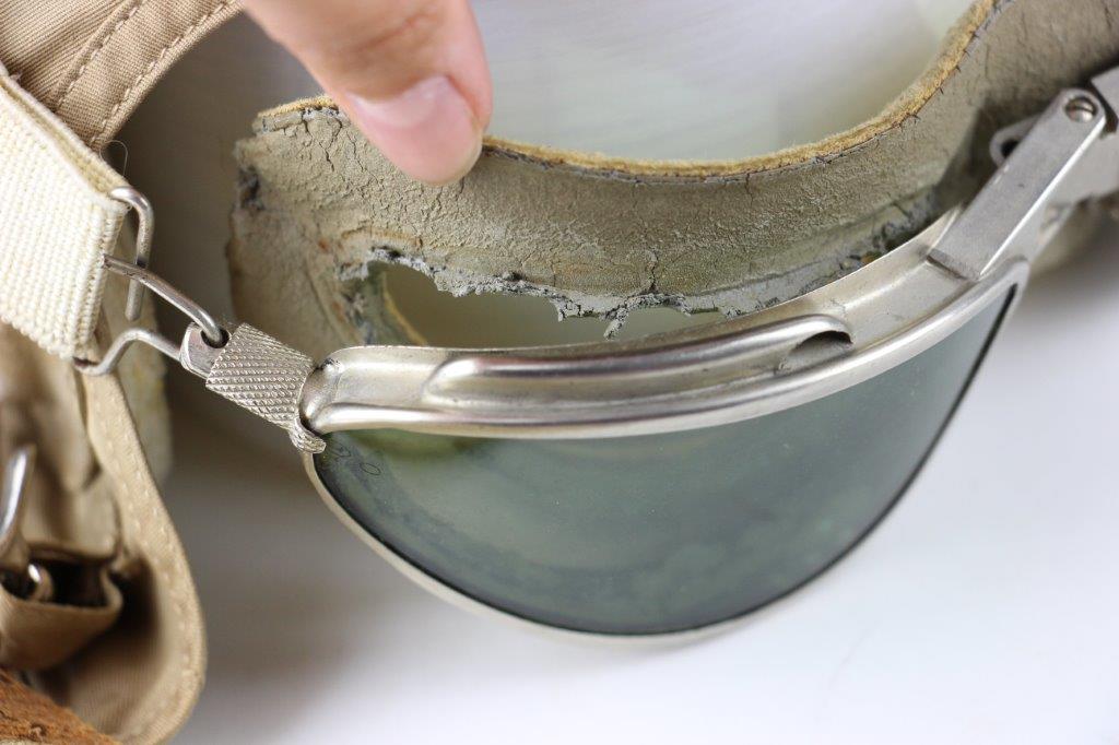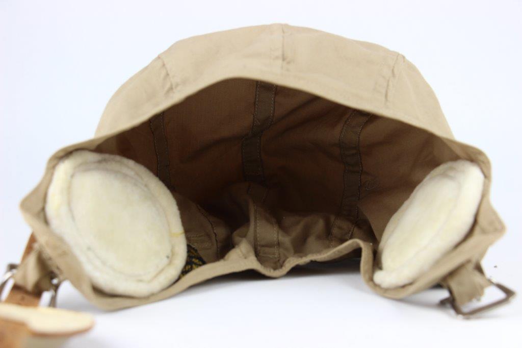 7/19/24 – This is an original, early WW2 Pacific Theatre M-450 US Navy Flight Cap. This example features added communications headgear, which is shown by the sewn-on ear caps and wiring harness. The interior of the ear caps show crude lines of stitching, as these were hastily added for war use, and this example being no exception. The right ear cap slightly covers the original label found on the interior of the cap, which is by H.L.B. Corp. The cap is lightweight “summer” style and in excellent condition. All original stitching throughout is excellent as well. Original leather chinstrap has light wrinkling and mild surface cracking on the exterior but is clean and excellent overall. Also includes flight goggles, marked “AN 6530” on the nose bridge. The lenses are separating from the leather frame, with the right eye missing all of the stitching and being completely detached. The left eye is secure, however. Overall a great example of a WW2 original USN Flight Cap with added comms gear.