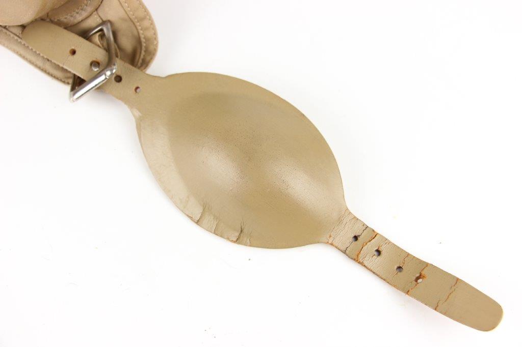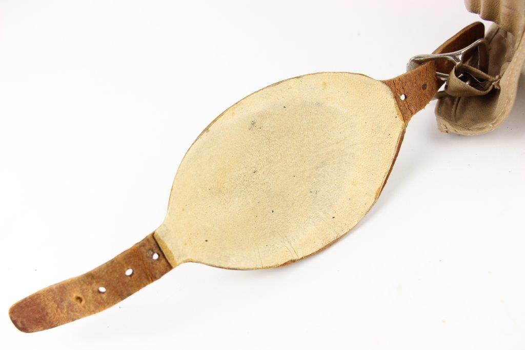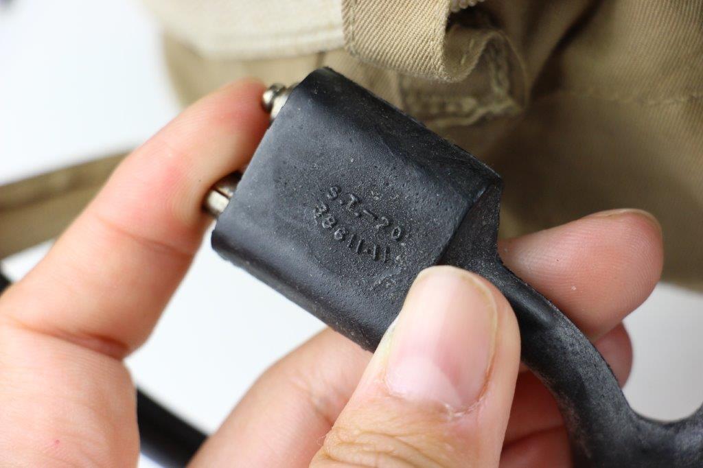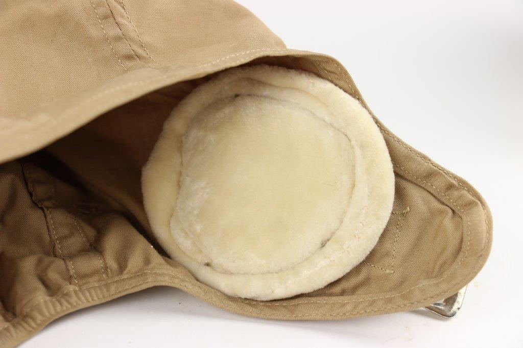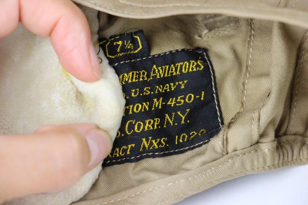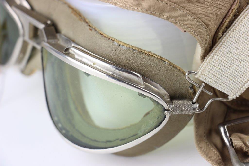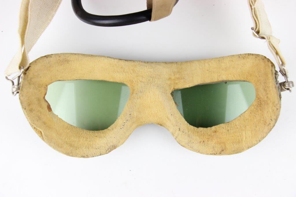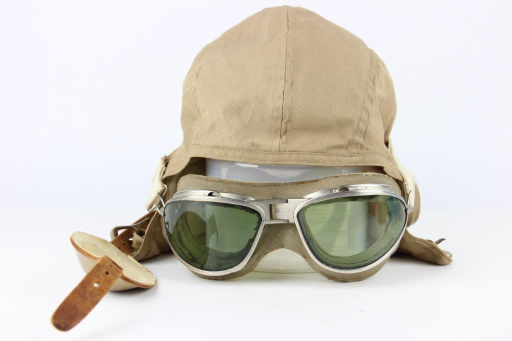 7/19/24 – This is an original, early WW2 Pacific Theatre M-450 US Navy Flight Cap. This example features added communications headgear, which is shown by the sewn-on ear caps and wiring harness. The interior of the ear caps show crude lines of stitching, as these were hastily added for war use, and this example being no exception. The right ear cap slightly covers the original label found on the interior of the cap, which is by H.L.B. Corp. The cap is lightweight “summer” style and in excellent condition. All original stitching throughout is excellent as well. Original leather chinstrap has light wrinkling and mild surface cracking on the exterior but is clean and excellent overall. Also includes flight goggles, marked “AN 6530” on the nose bridge. The lenses are separating from the leather frame, with the right eye missing all of the stitching and being completely detached. The left eye is secure, however. Overall a great example of a WW2 original USN Flight Cap with added comms gear.