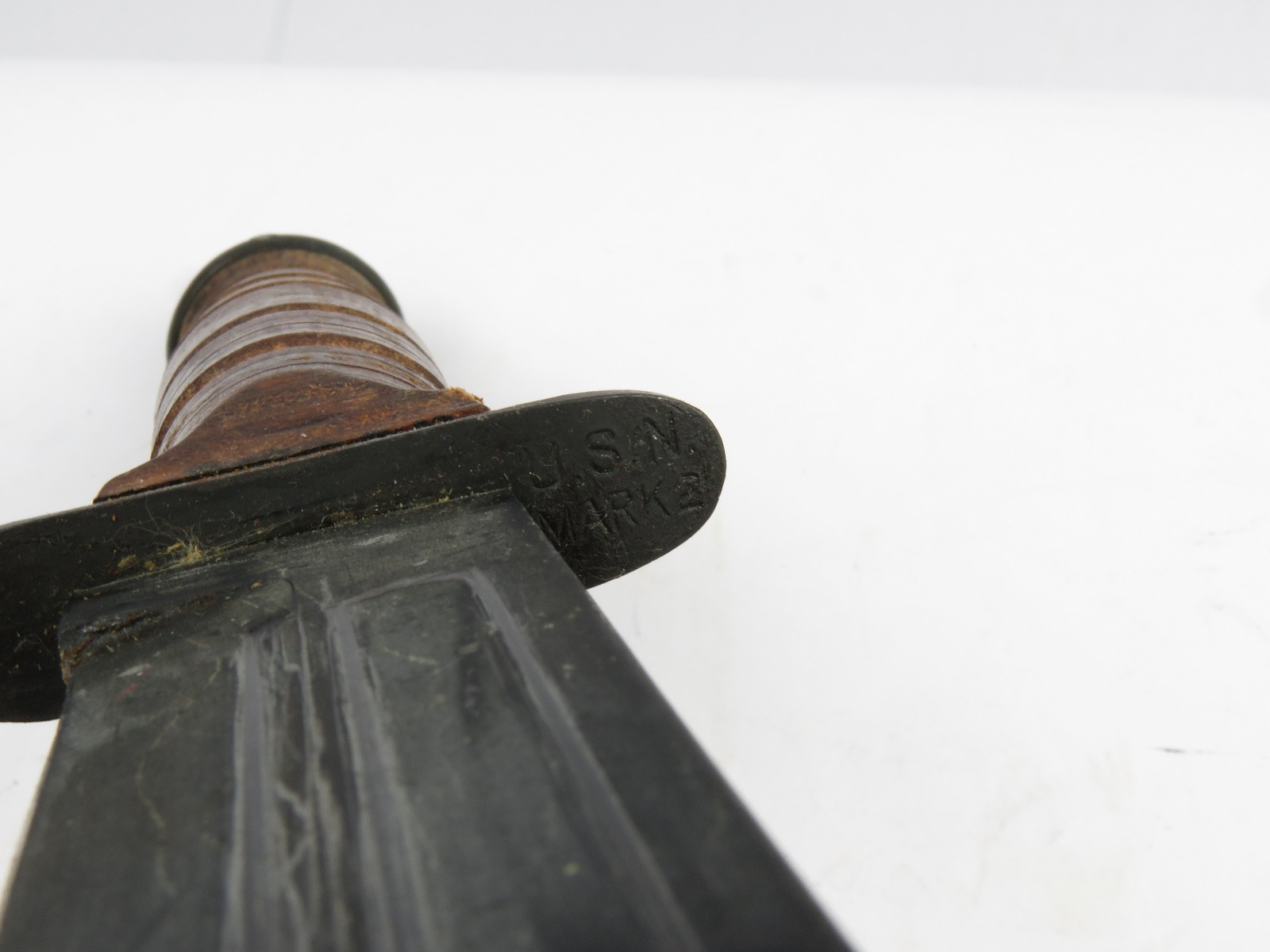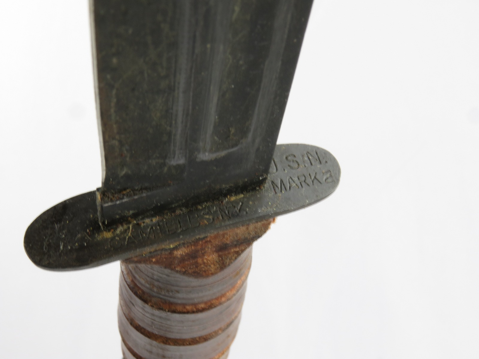 12/15/17 – This is an original WW2 USN fighting knife. The hilt is marked “U.S.N. Mark 2” and “Camillus” maker marked. The blade has some light scratching and discoloration, but overall is in excellent condition. The scabbard is excellent and all original as well with no notable issues.