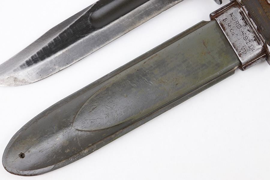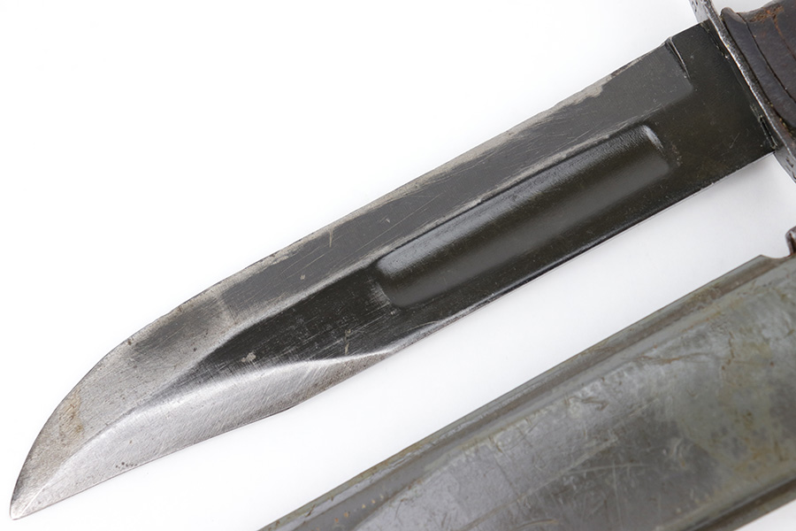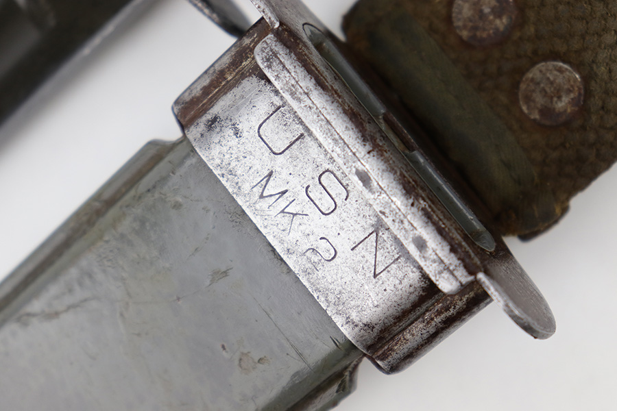 4/5/23 – This is an original WW2 USN Mark 2 knife by KA-BAR. One of the more popular and desirable variations today, the hand guard of this knife is stamped “KA-BAR” and “USN MK 2”. The blade has most of the original finish still intact with some surface wear and finish loss, mostly near the tip of the blade. The edge shows signs of previous use and sharpening. The hand guard has some very minor “play” or wiggle on the handle, but this is mild. Nice, tight leather grip. Comes with a USN MK 2 scabbard in good overall condition.