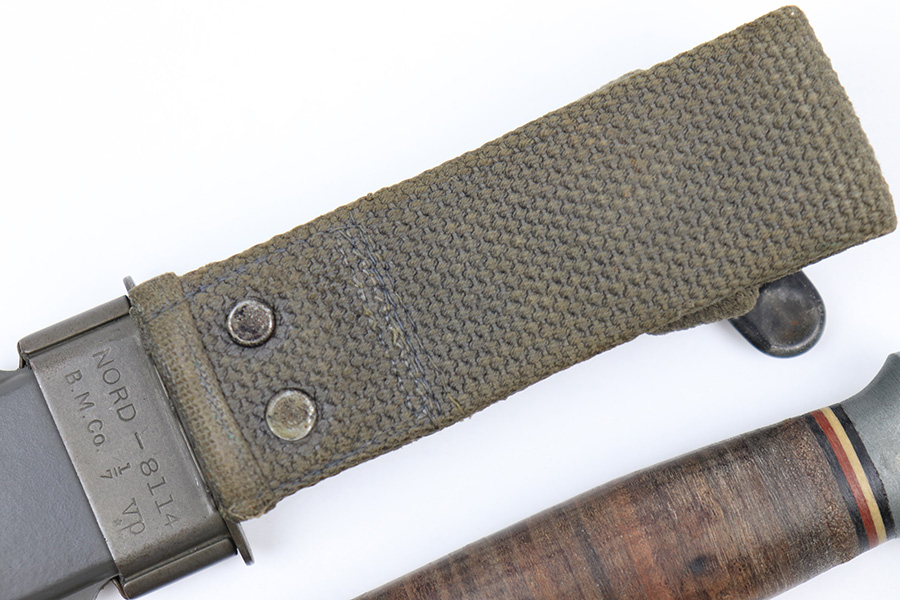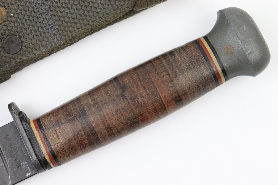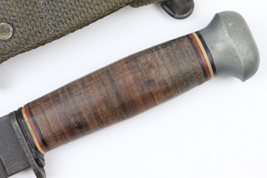7/5/22 – This is an excellent, minty example of a USN MK 1 fighting / utility knife from WW2. The knife features an excellent blade maker stamped “RH 35” by PAL. The blade is in minty condition. The leather handle and multi-colored spacers are in great shape, though they show some mild signs of aging and patina. The original care tag piece of paper is included as shown. Comes with an excellent condition scabbard that has some mild surface wear on the front but no excessive damage. A top tier collector example.