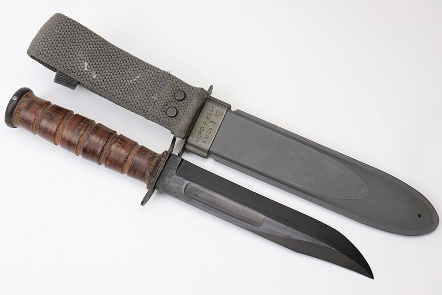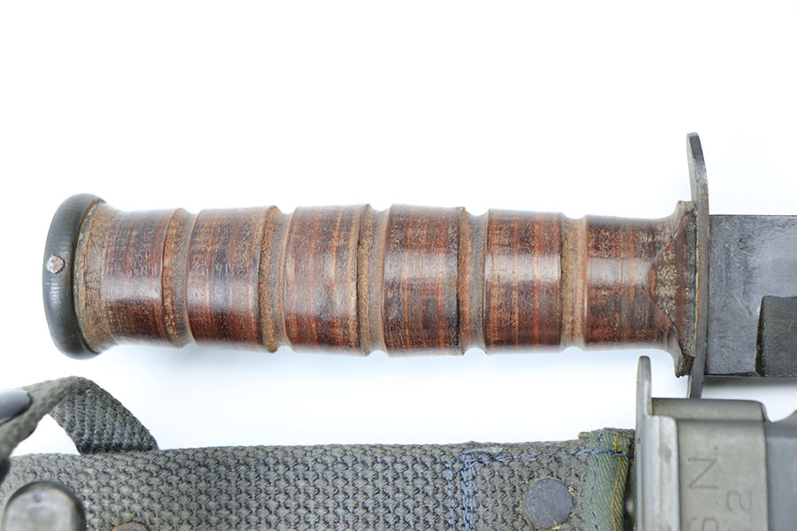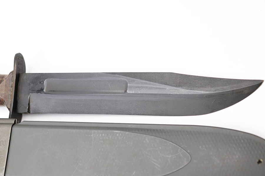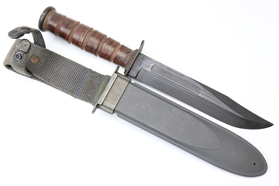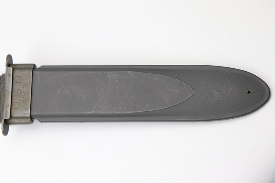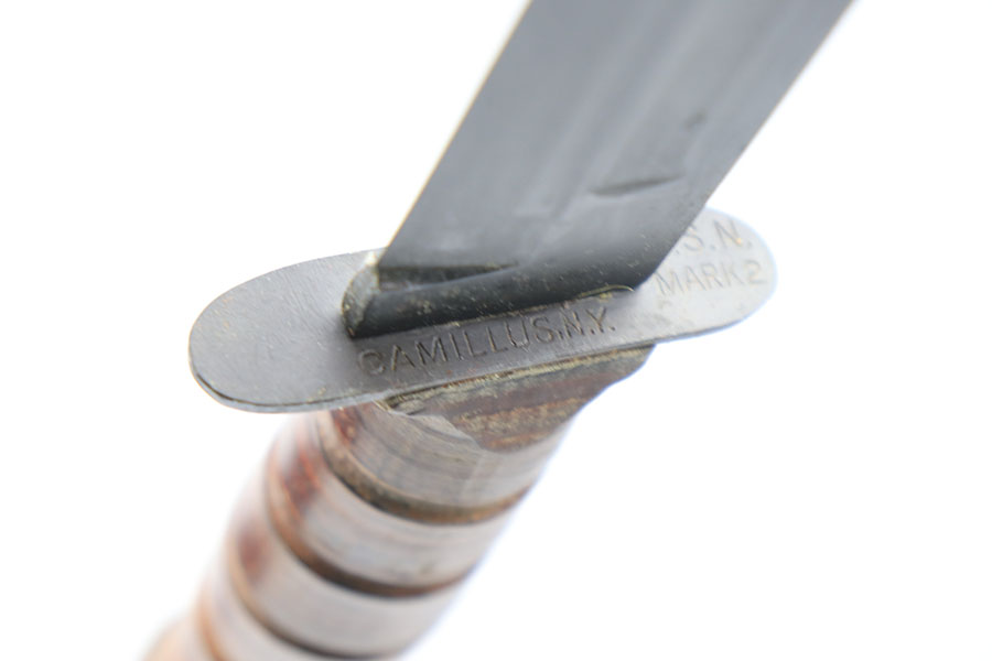 5/13/21 – This is an excellent condition USN MK 2 knife by Camillus. Maker stamped on the hand guard as shown. The blade is excellent and clean with no signs of sharpening. Nice leather handle is tight and has no issues. Comes with an equally excellent scabbard as shown.