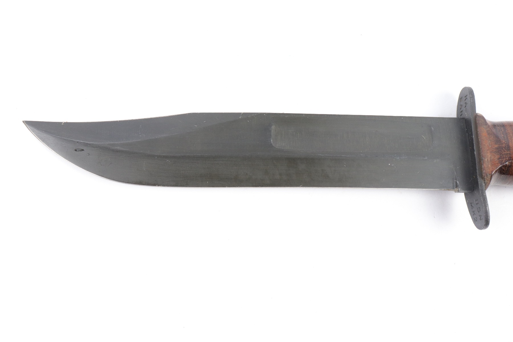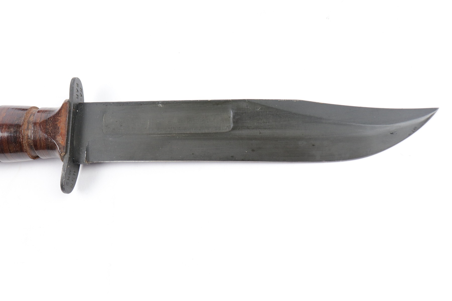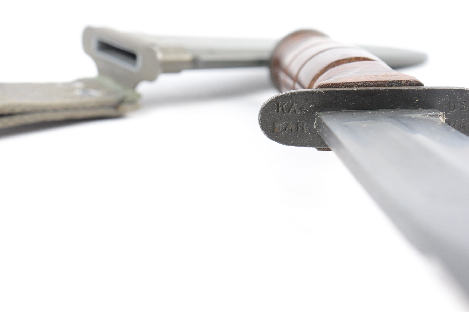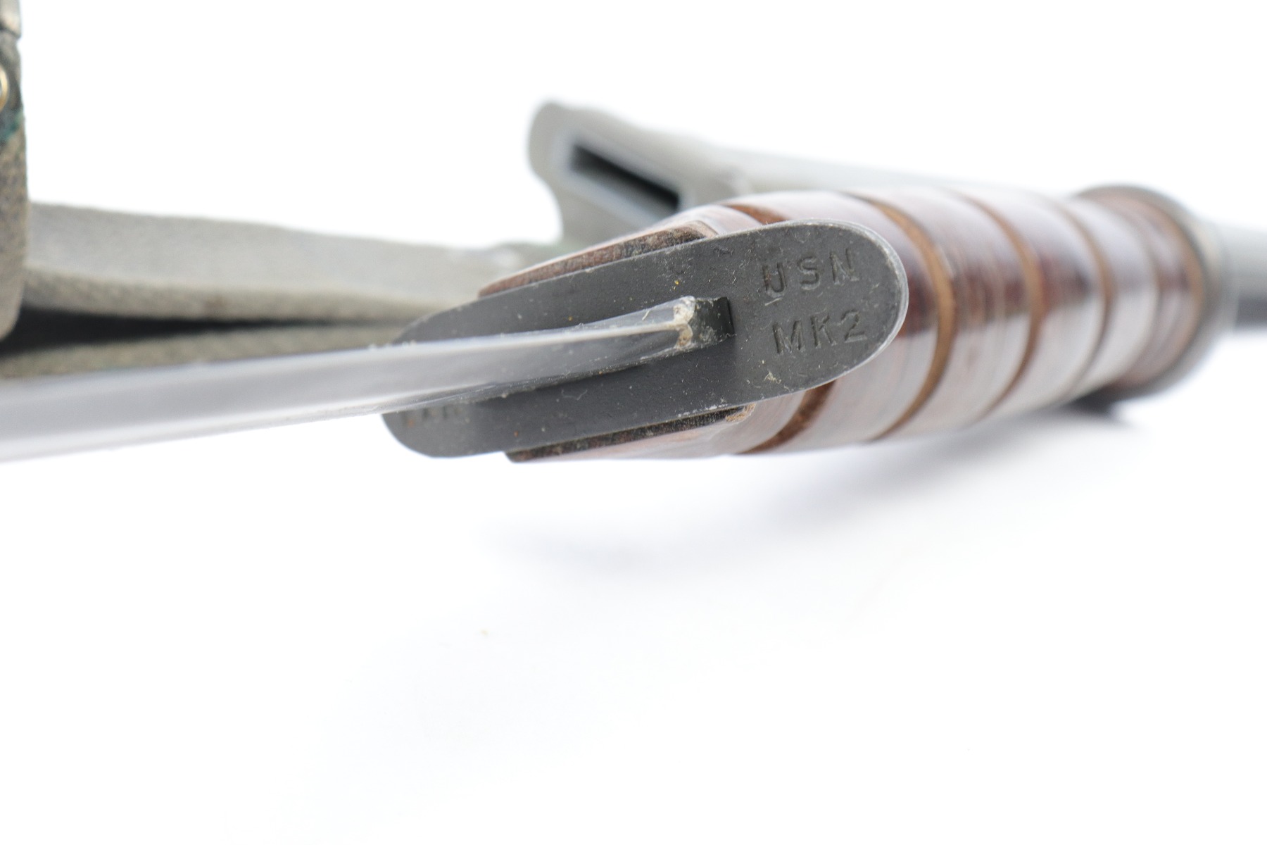 4/2/18 – This is a US Navy issued KA-BAR fighting knife from WW2. The blade is in minty condition with no notable flaws. There are a few oil marks on the blade, but these are removable if desired. The handle is excellent, clean pressed leather. The hilt is KA-BAR maker stamped as well as “USN MK2”. The scabbard is similarly in minty condition. Guaranteed original.