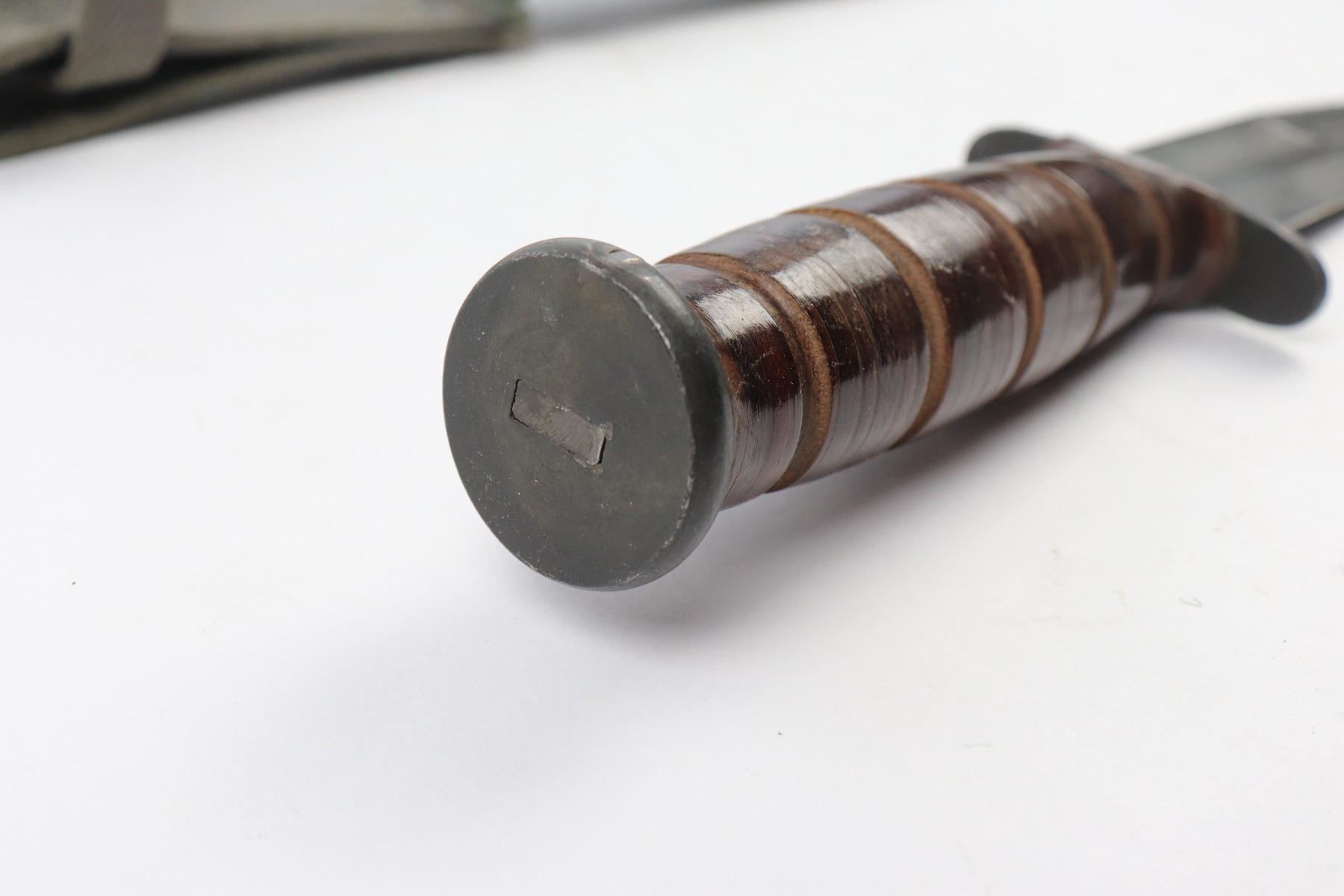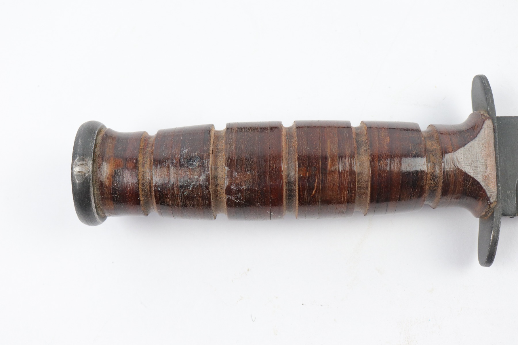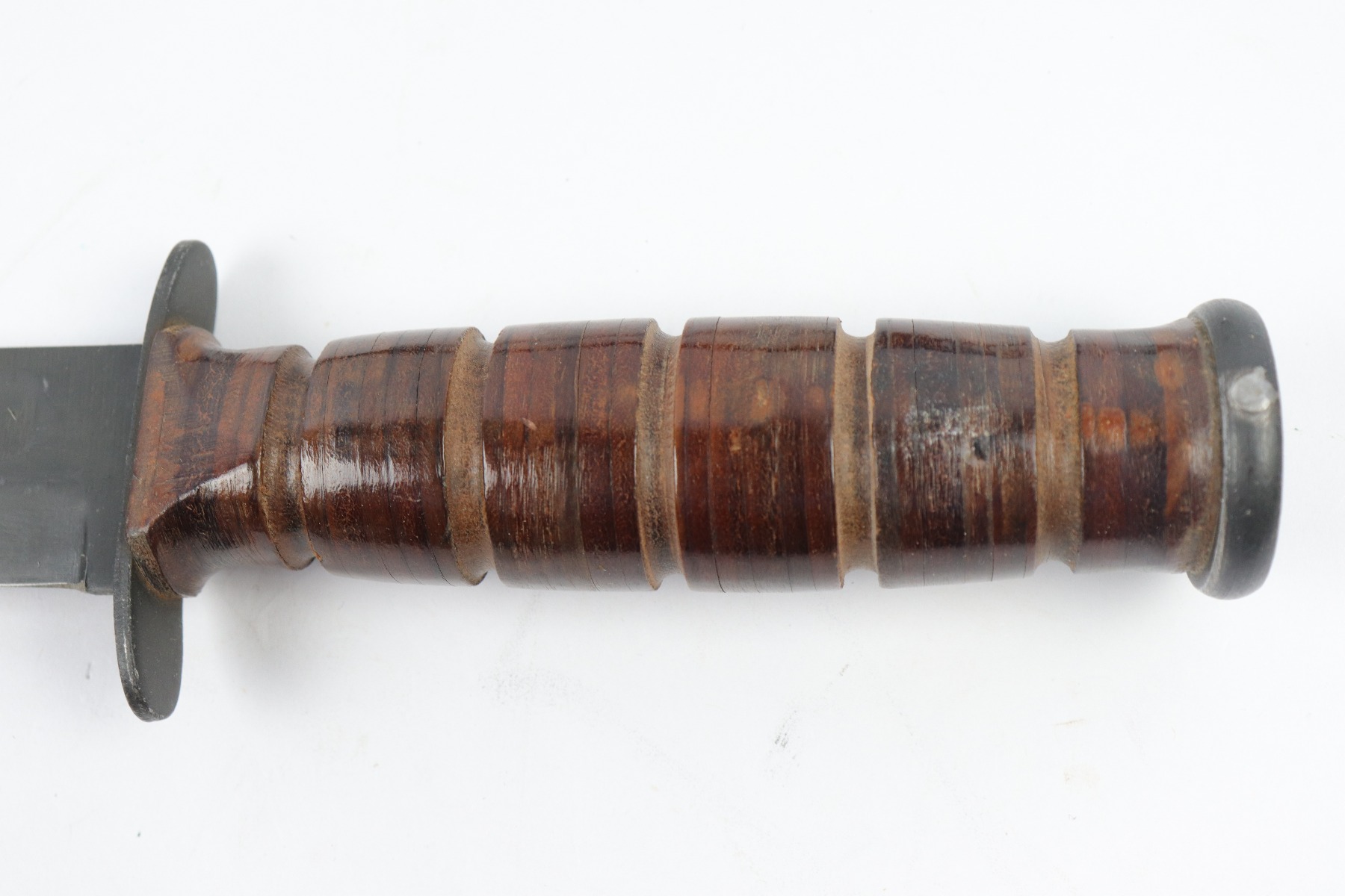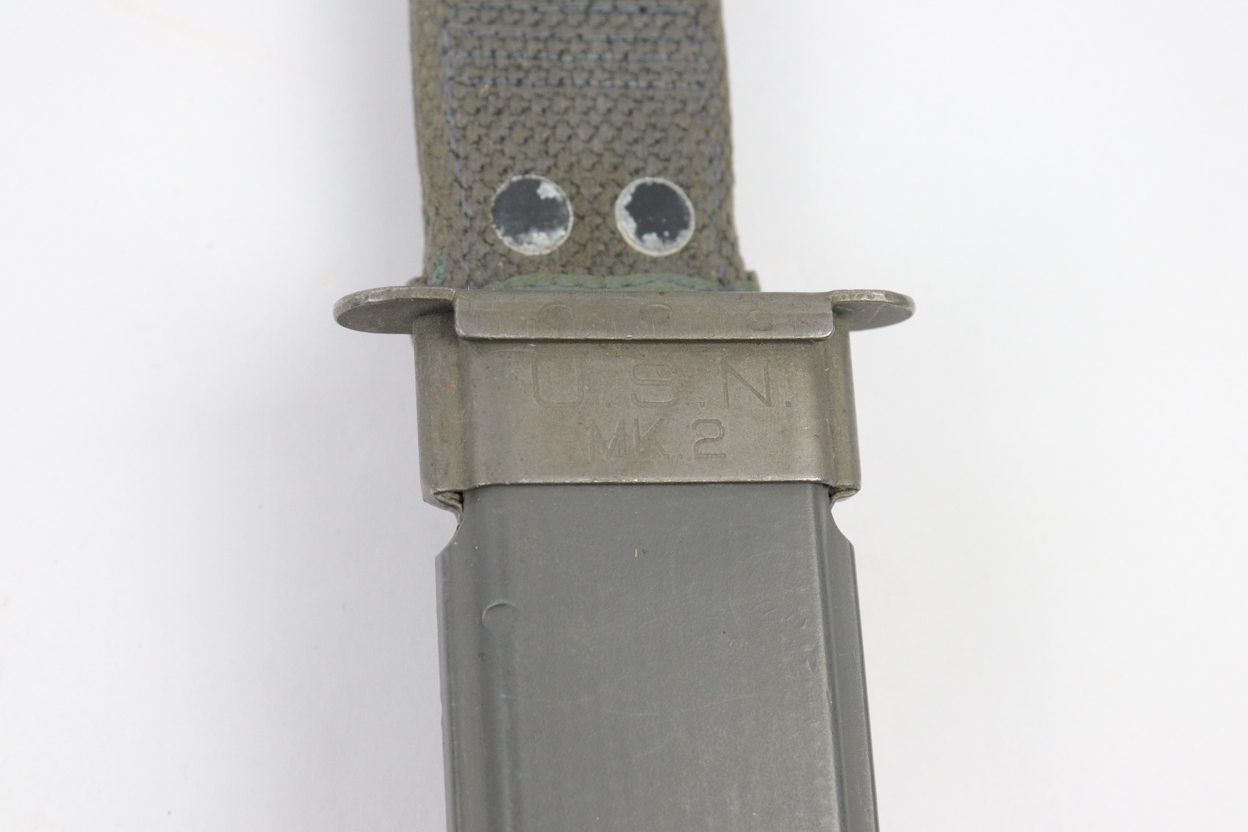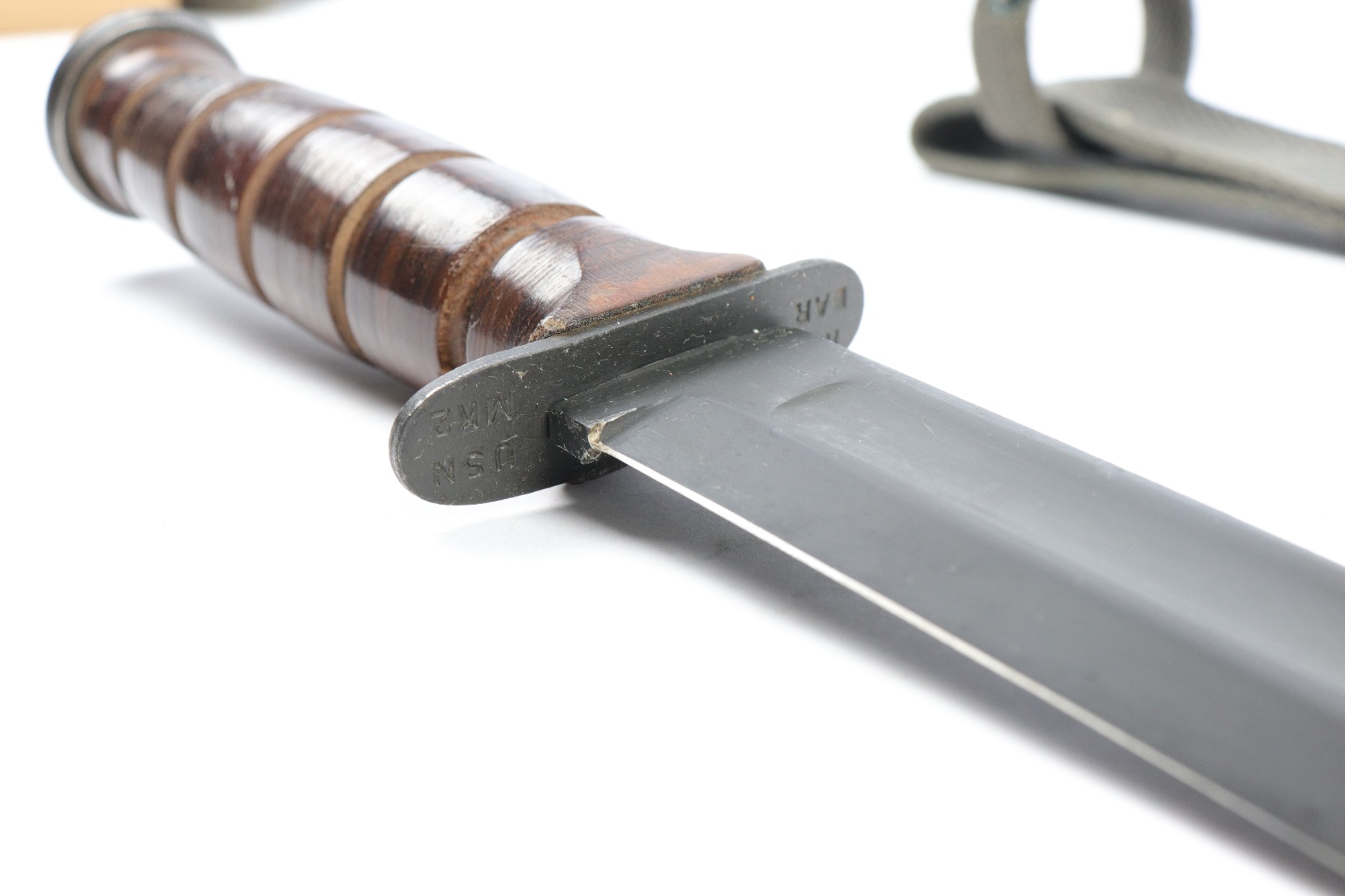 4/2/18 – This is a US Navy issued KA-BAR fighting knife from WW2. The blade is in minty condition with no notable flaws. There are a few oil marks on the blade, but these are removable if desired. The handle is excellent, clean pressed leather. The hilt is KA-BAR maker stamped as well as “USN MK2”. The scabbard is similarly in minty condition. Guaranteed original.