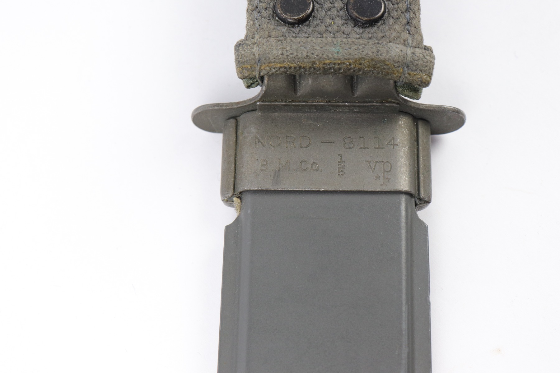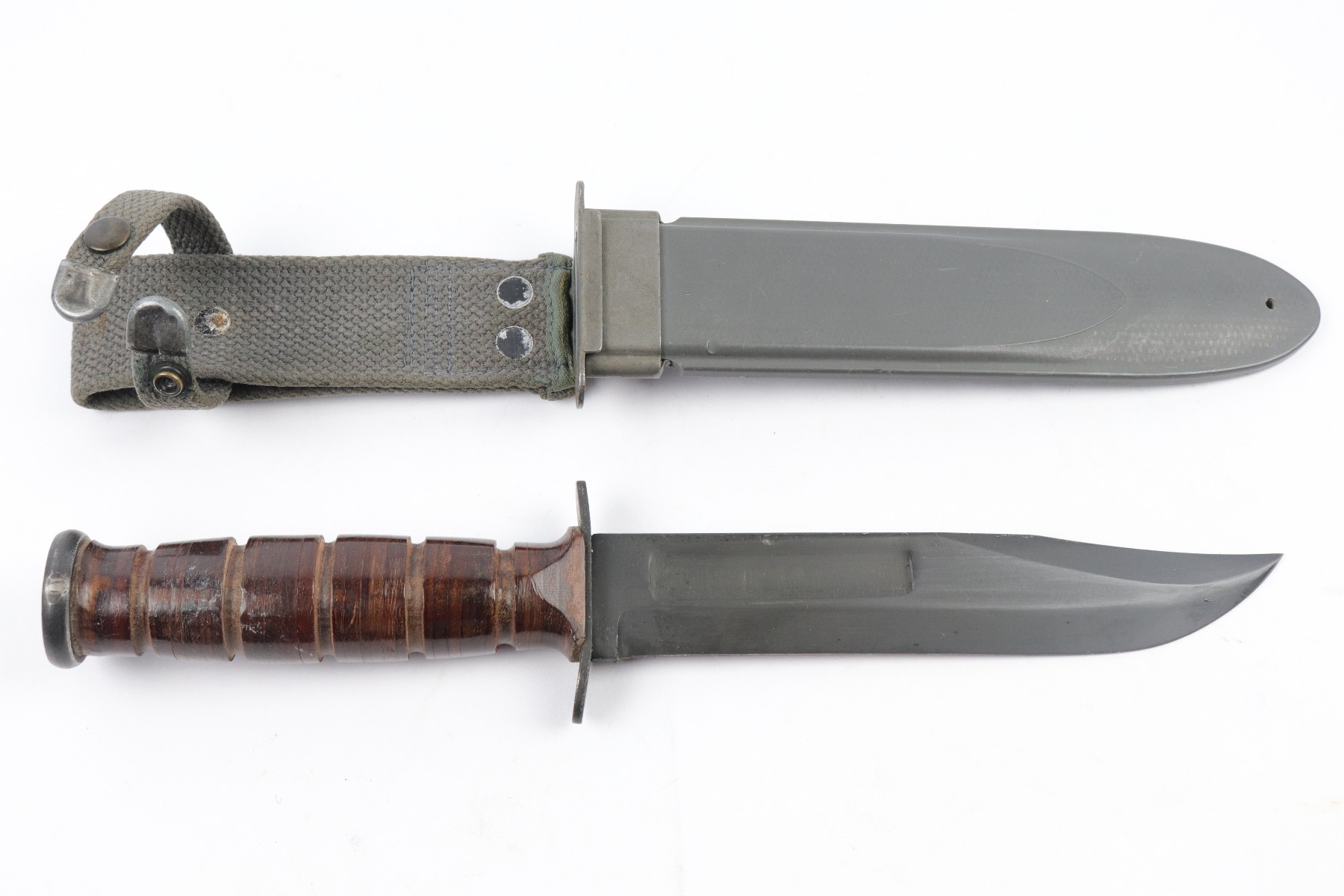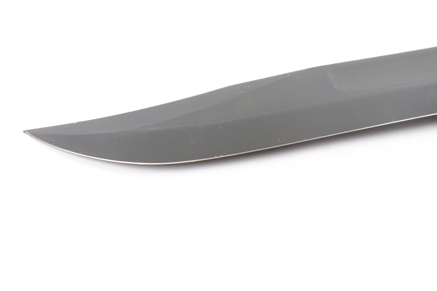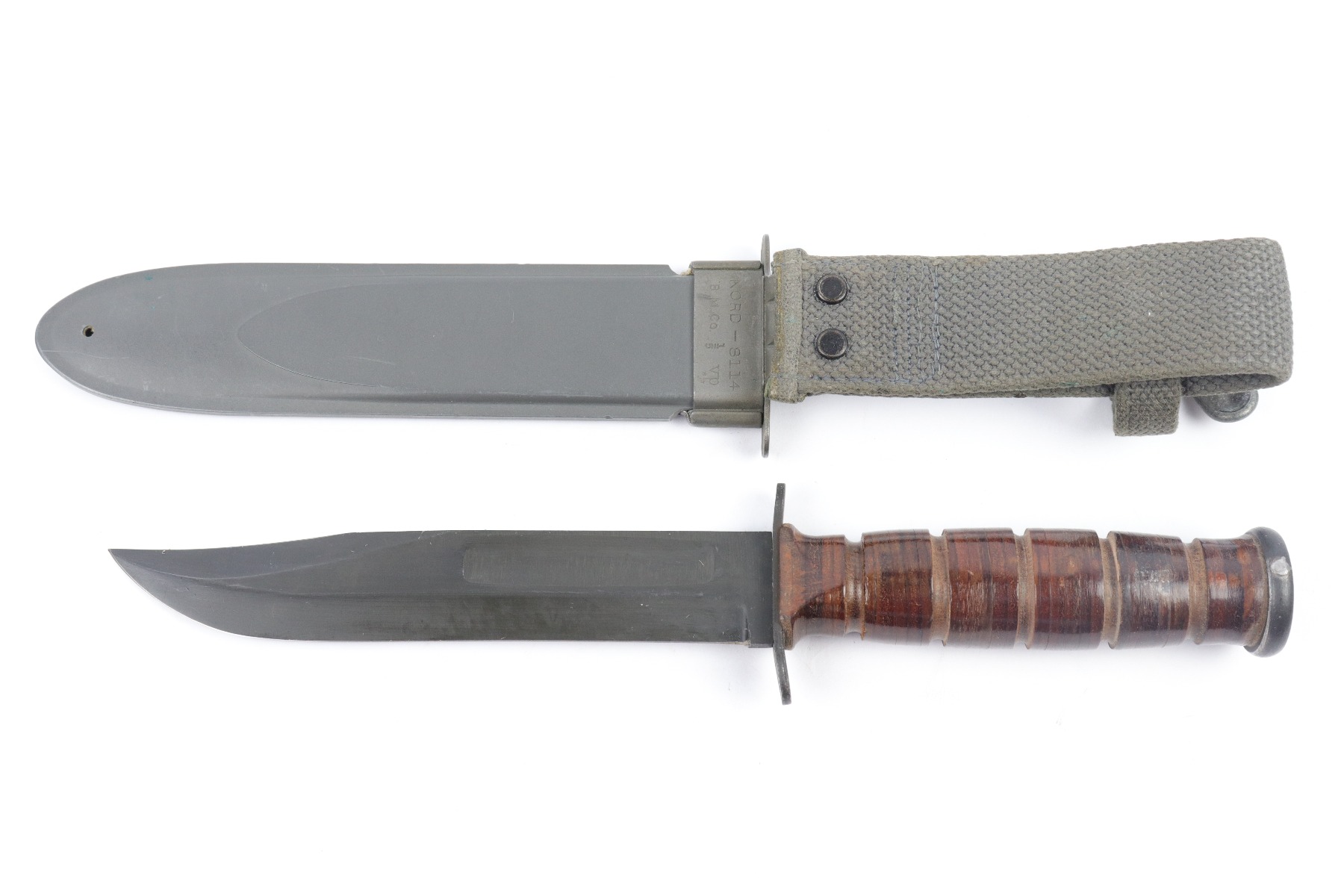 4/2/18 – This is a US Navy issued KA-BAR fighting knife from WW2. The blade is in minty condition with no notable flaws. There are a few oil marks on the blade, but these are removable if desired. The handle is excellent, clean pressed leather. The hilt is KA-BAR maker stamped as well as “USN MK2”. The scabbard is similarly in minty condition. Guaranteed original.