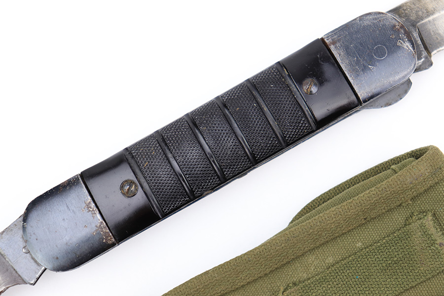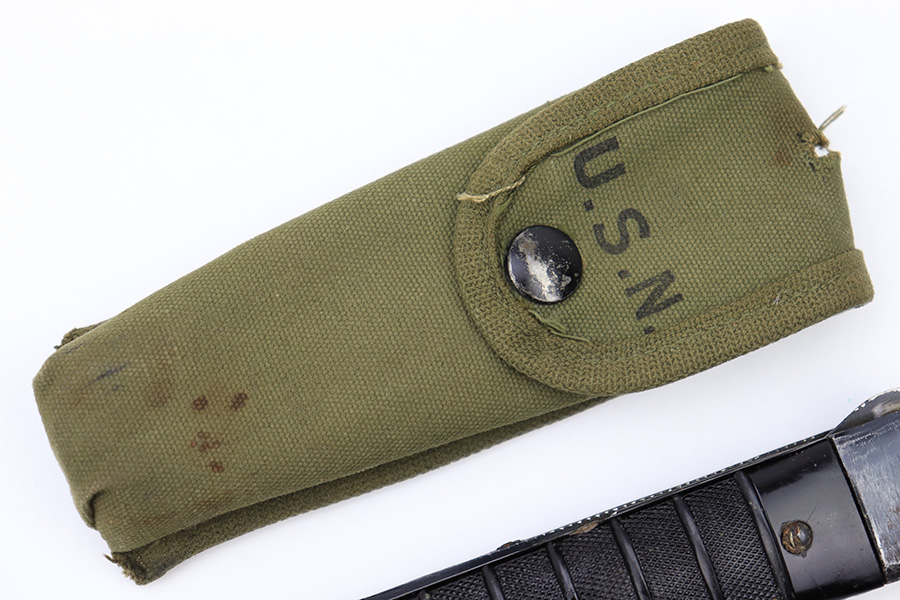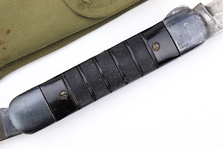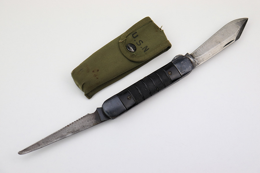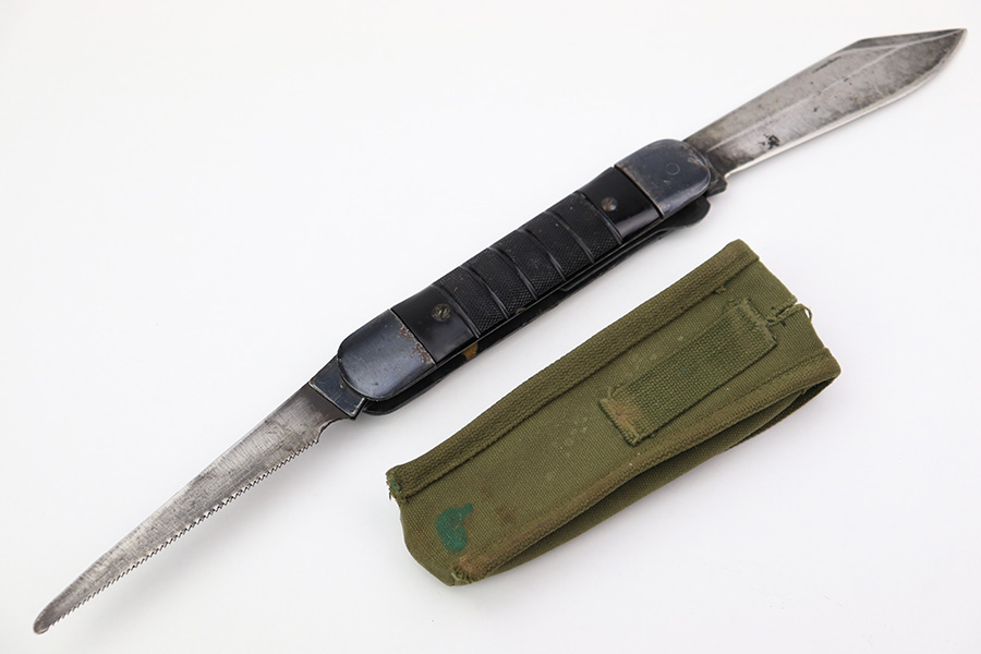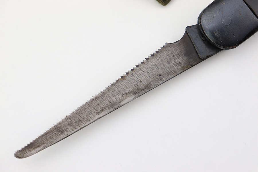 7/7/22 – This is an original WW2 era USN Survival knife. The folding knife measures about 6 inches long when folded up. There’s a sawblade and pocket utility knife that fold out. No markings or stamps, and great overall condition with nice natural patina throughout. Mechanically sound and unsharpened edges. Comes with a canvas carry pouch.