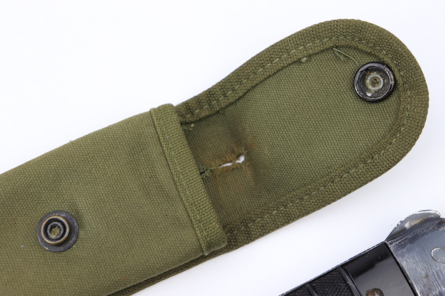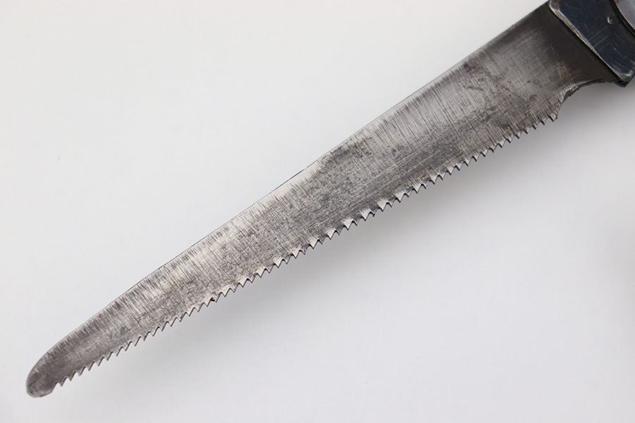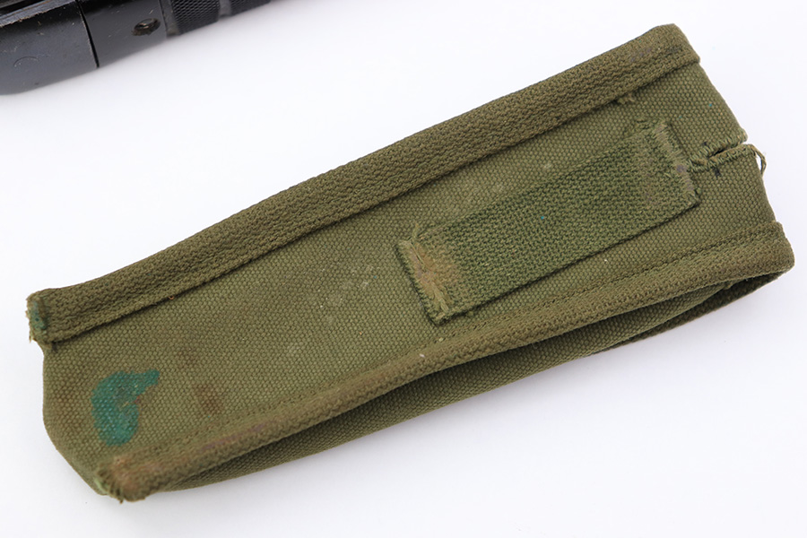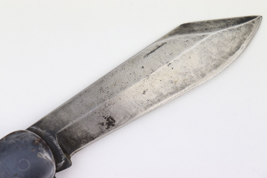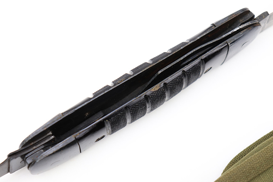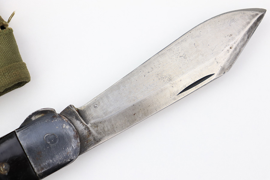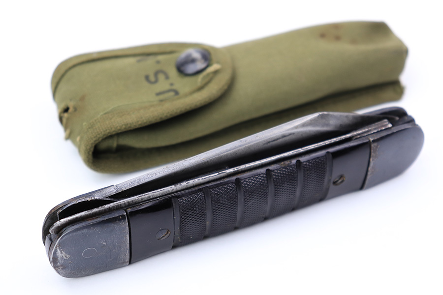 7/7/22 – This is an original WW2 era USN Survival knife. The folding knife measures about 6 inches long when folded up. There’s a sawblade and pocket utility knife that fold out. No markings or stamps, and great overall condition with nice natural patina throughout. Mechanically sound and unsharpened edges. Comes with a canvas carry pouch.