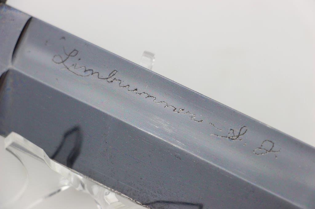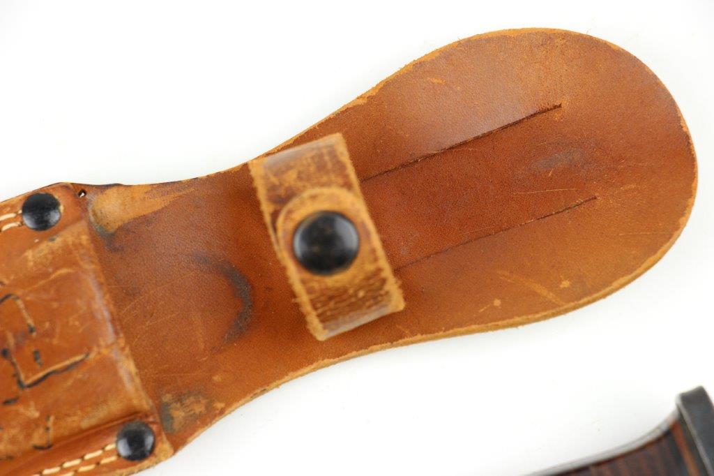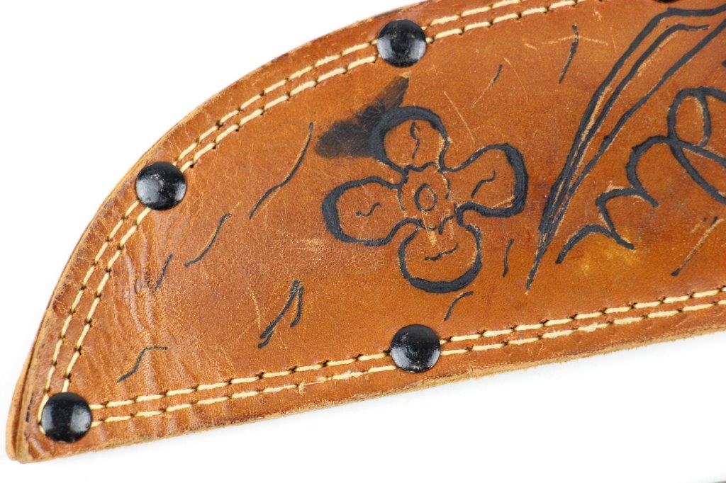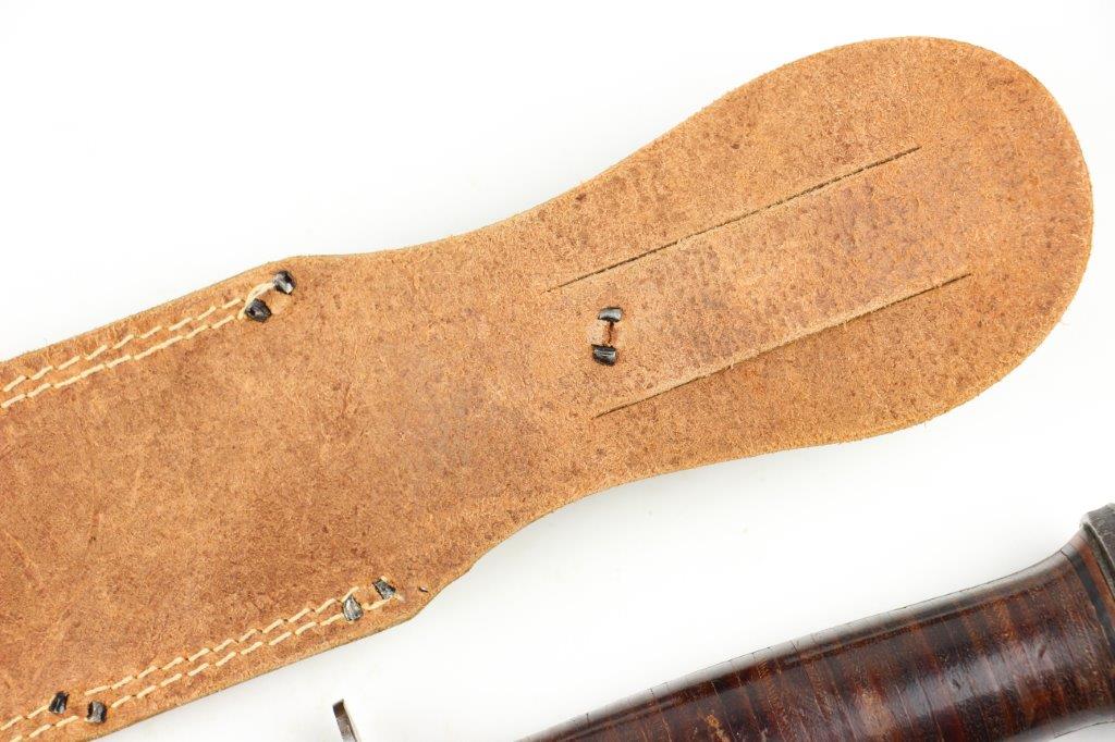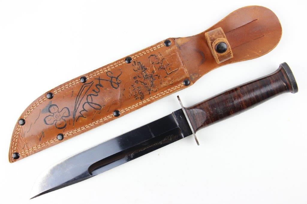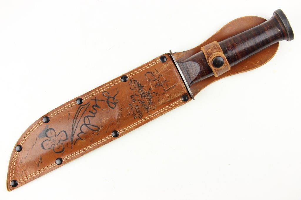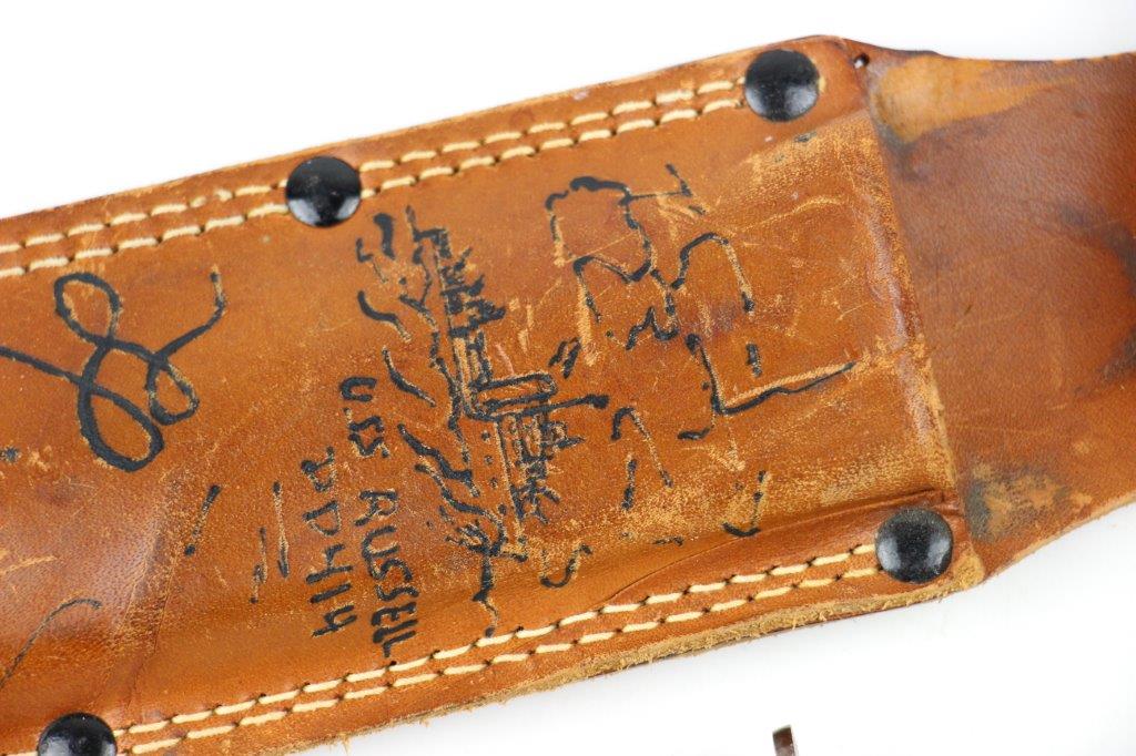 9/18/24 – This is a unique piece of US history; a hand-engraved Western Knife with a matching named leather sheath. The sheath is also hand-inscribed “U.S.S. Russell DD414” along with a drawing of the vessel, presumably by the veteran who carried and engraved the blade while onboard the ship. The knife is a scarce Western 8 inch fixed blade G-46-8 model with proper WW2 black and red spacers, a crisp leather handle, beautiful high polish blued blade, and twice pinned pommel (correct crude style). The blade and original leather scabbard alone are highly collectible, but what makes this example special is the hand-engraved name on one side of the blade, located inside the blood groove. The cursive is hard to decipher, but we believe the name is “S.J. Limbrunner”. The initials and style of writing matches that found on the front of the scabbard. This veteran also named the ship he was stationed on, a famous Sims-class destroyer with a decorated service history throughout WW2. Click Here for the Wikipedia page, which has the full military history. An incomparable piece of US History and great addition to any collection.