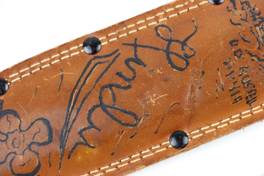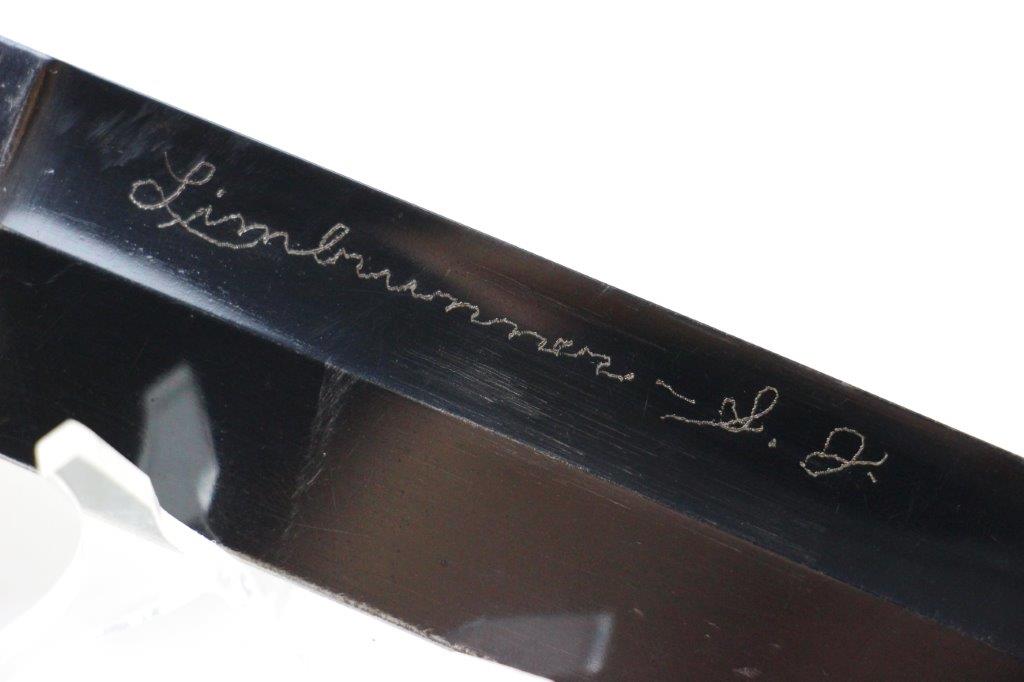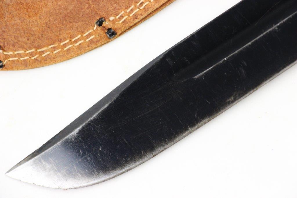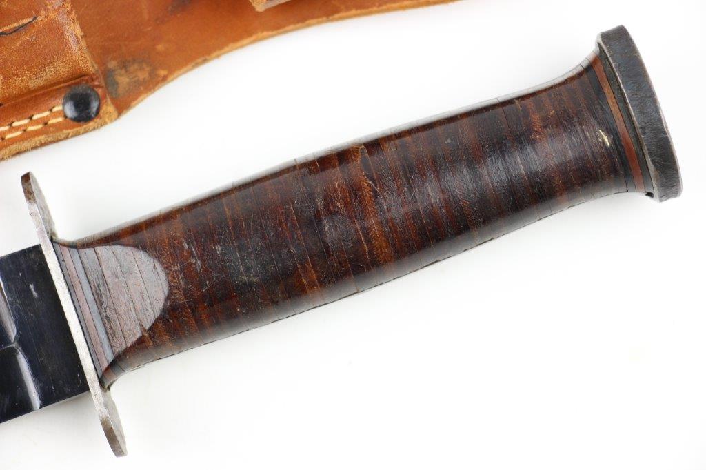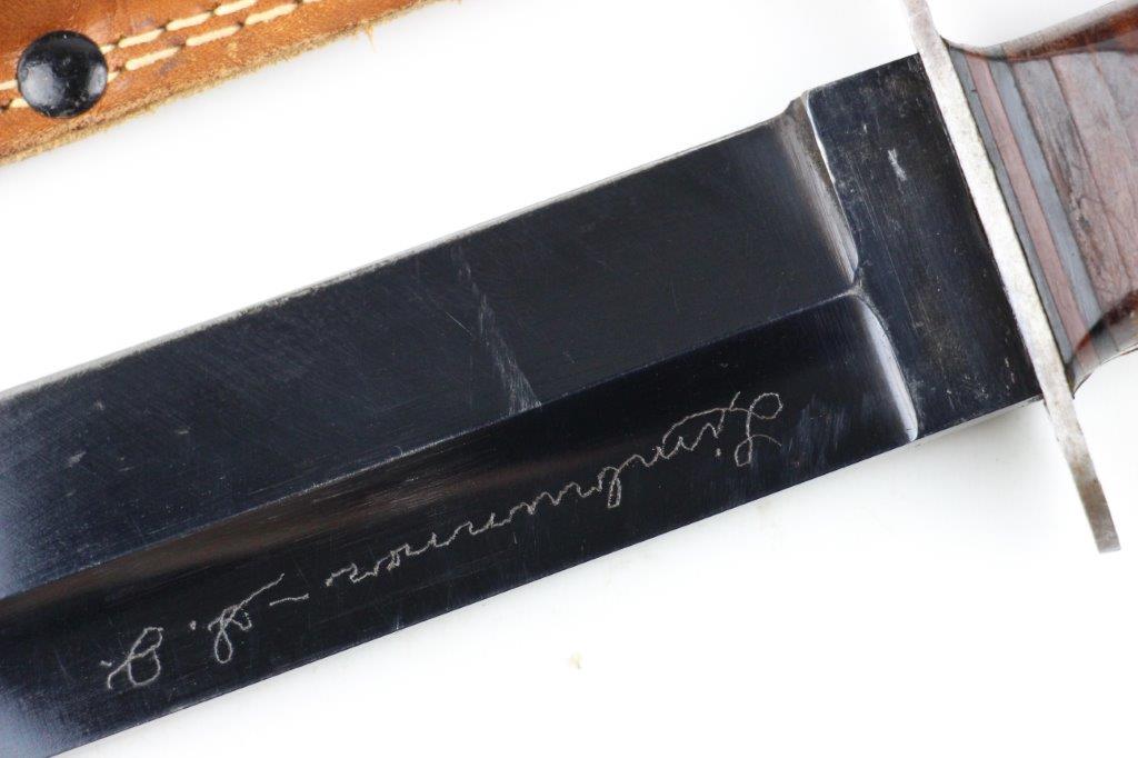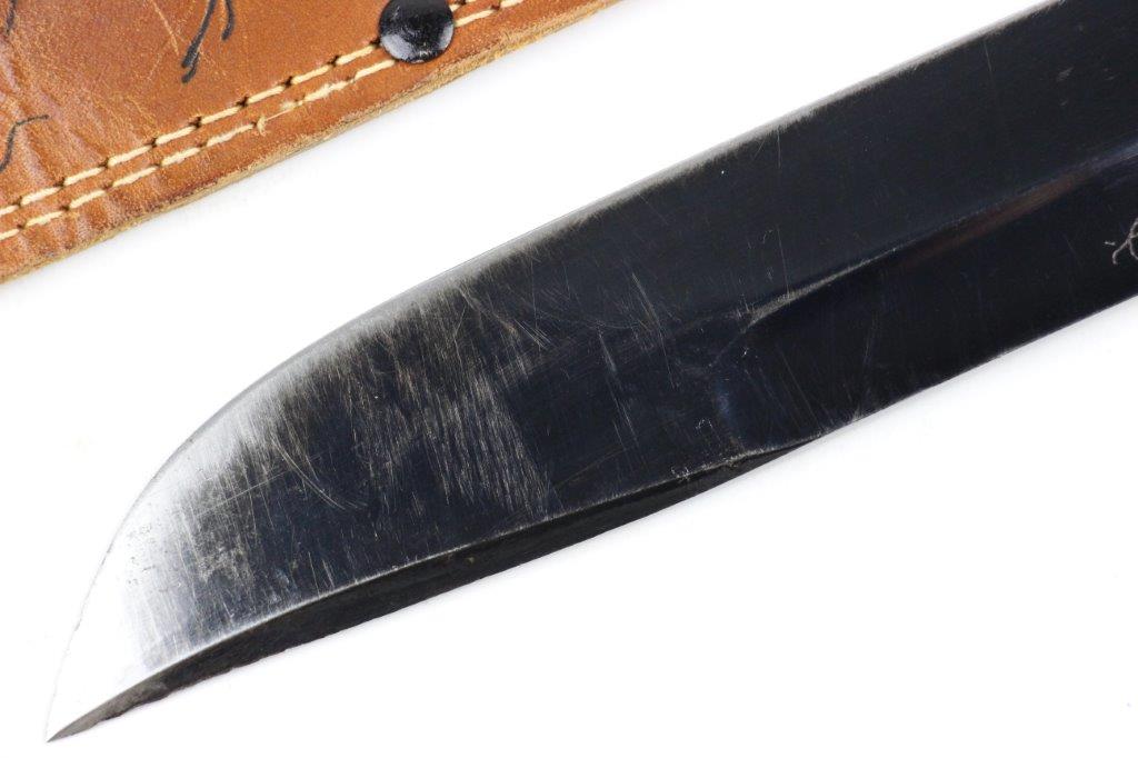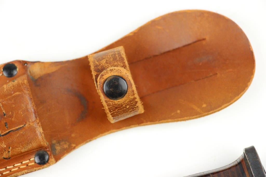 9/18/24 – This is a unique piece of US history; a hand-engraved Western Knife with a matching named leather sheath. The sheath is also hand-inscribed “U.S.S. Russell DD414” along with a drawing of the vessel, presumably by the veteran who carried and engraved the blade while onboard the ship. The knife is a scarce Western 8 inch fixed blade G-46-8 model with proper WW2 black and red spacers, a crisp leather handle, beautiful high polish blued blade, and twice pinned pommel (correct crude style). The blade and original leather scabbard alone are highly collectible, but what makes this example special is the hand-engraved name on one side of the blade, located inside the blood groove. The cursive is hard to decipher, but we believe the name is “S.J. Limbrunner”. The initials and style of writing matches that found on the front of the scabbard. This veteran also named the ship he was stationed on, a famous Sims-class destroyer with a decorated service history throughout WW2. Click Here for the Wikipedia page, which has the full military history. An incomparable piece of US History and great addition to any collection.