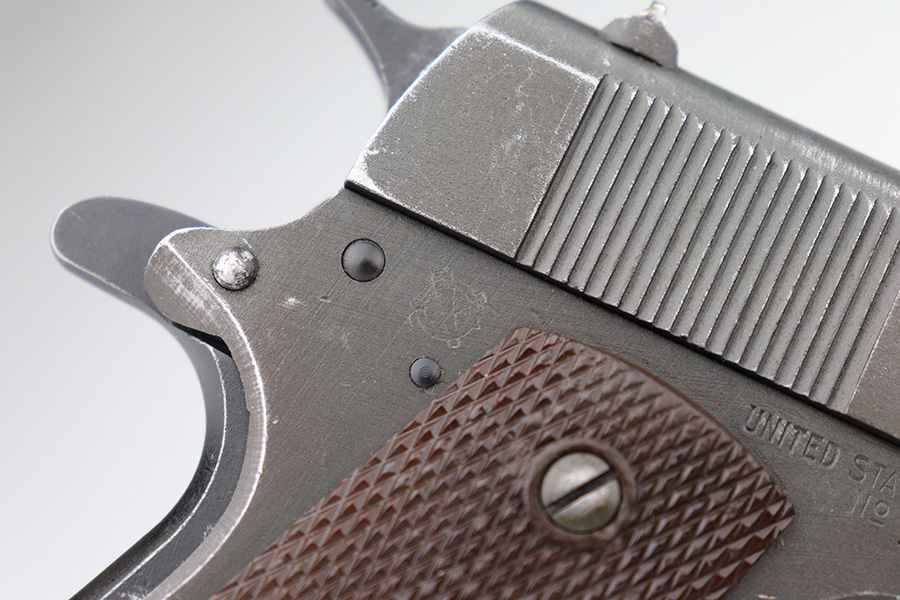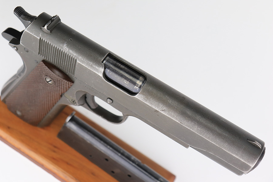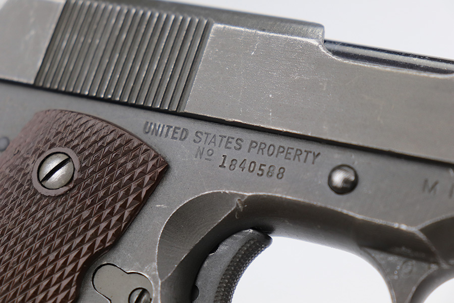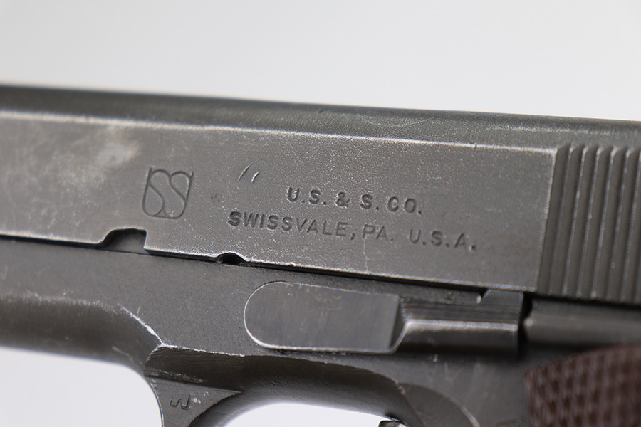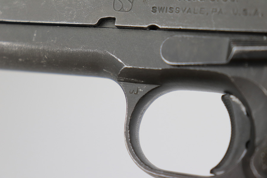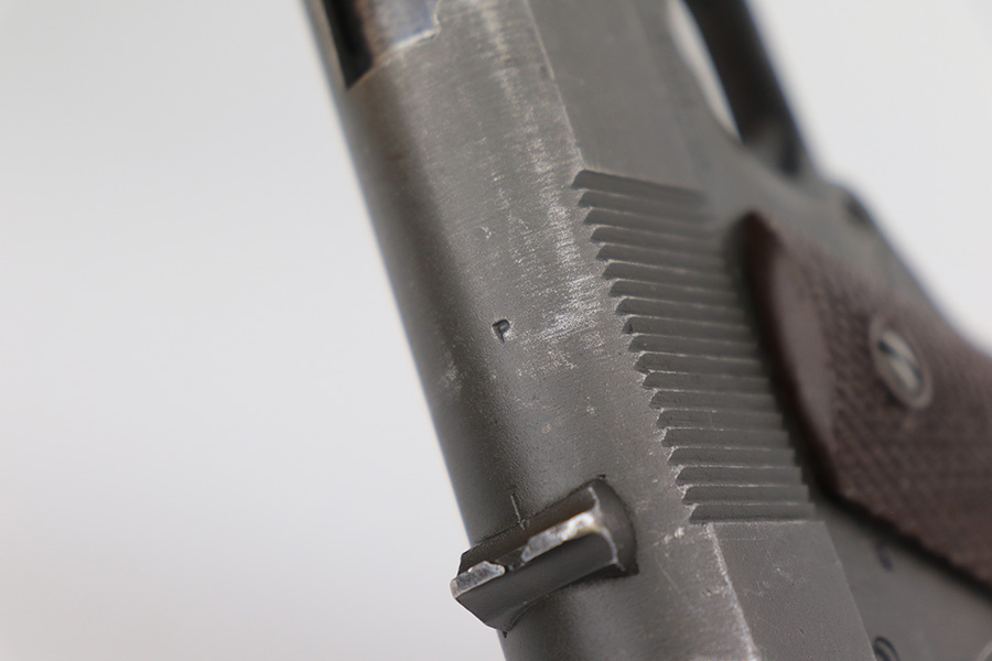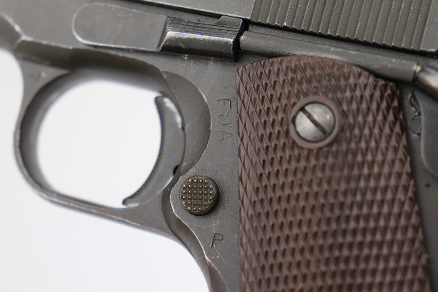 3/3/23 – This is a very nice example of a WW2-era Model 1911A1 pistol put together from parts. The frame was made by Ithaca and dates to 1944. The slide is scarce and made by Union Switch & Signal. The slide should have a dulite finish, but it appears to have been parkerized. The barrel was made by High Standard. The gun has retained about 94% of its finish. Areas of light spotty wear on the front strap, underside of the frame, and along both sides of the slide, concentrated mostly around the high edges. Fitted with period-correct reddish plastic grips. Comes with a period-correct “R” marked magazine. Mint bore.